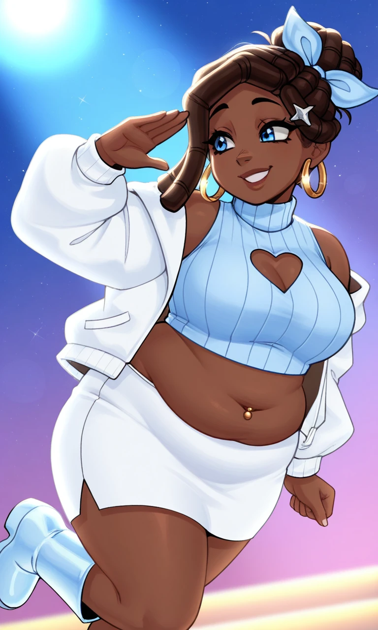 Tessa_Goodwin, 1girl, light_brown_skin, blue_eyes, dark_brown_dreadlocks_side_swept/tied_up_in_bun_with_sky_blue_bow, chubby, tall, gold_hoop_earrings, navel_piercing