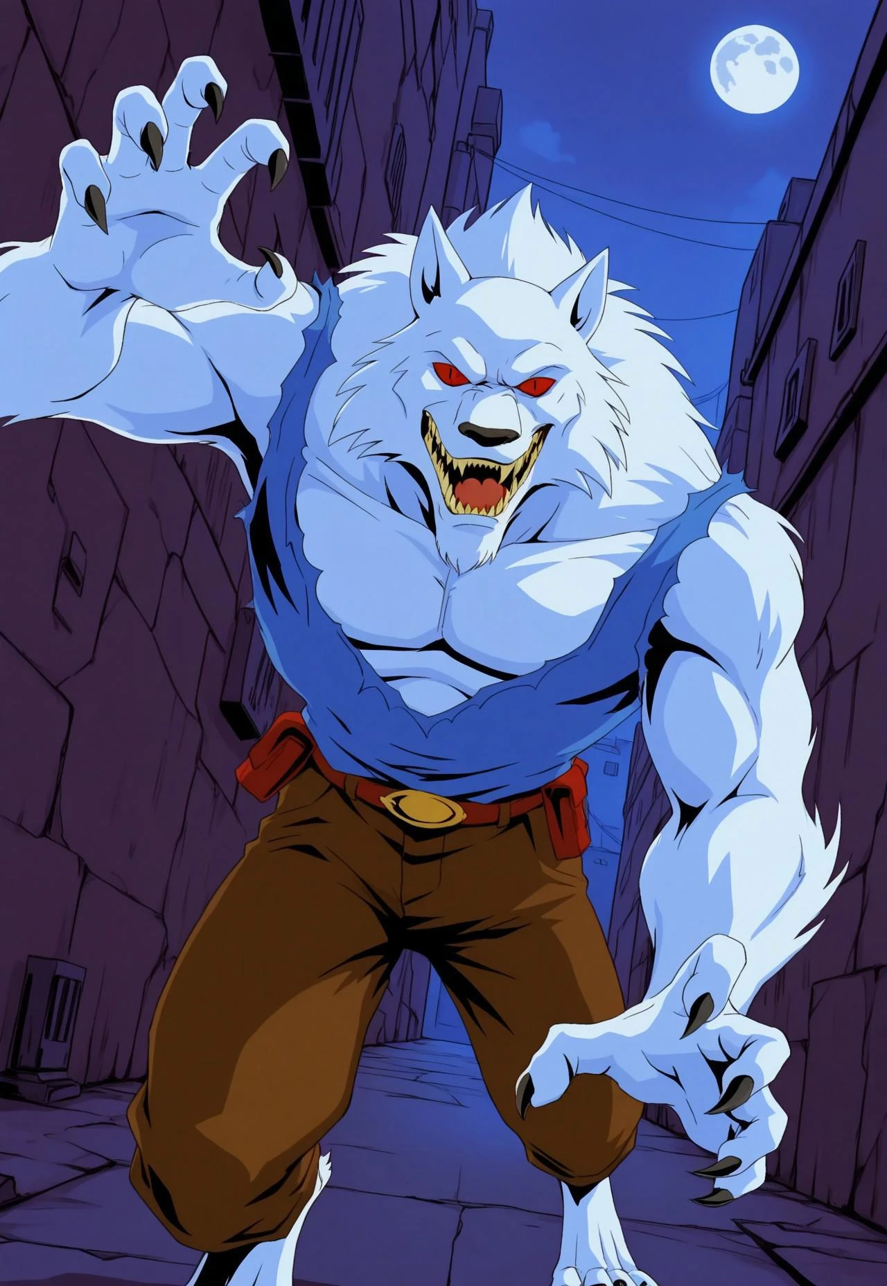 MWolf, furry male, solo, werewolf, white fur, muscular, red sclera, black eyes, slit pupils, sharp teeth, blue tank top, brown pants, torn clothes, pouch