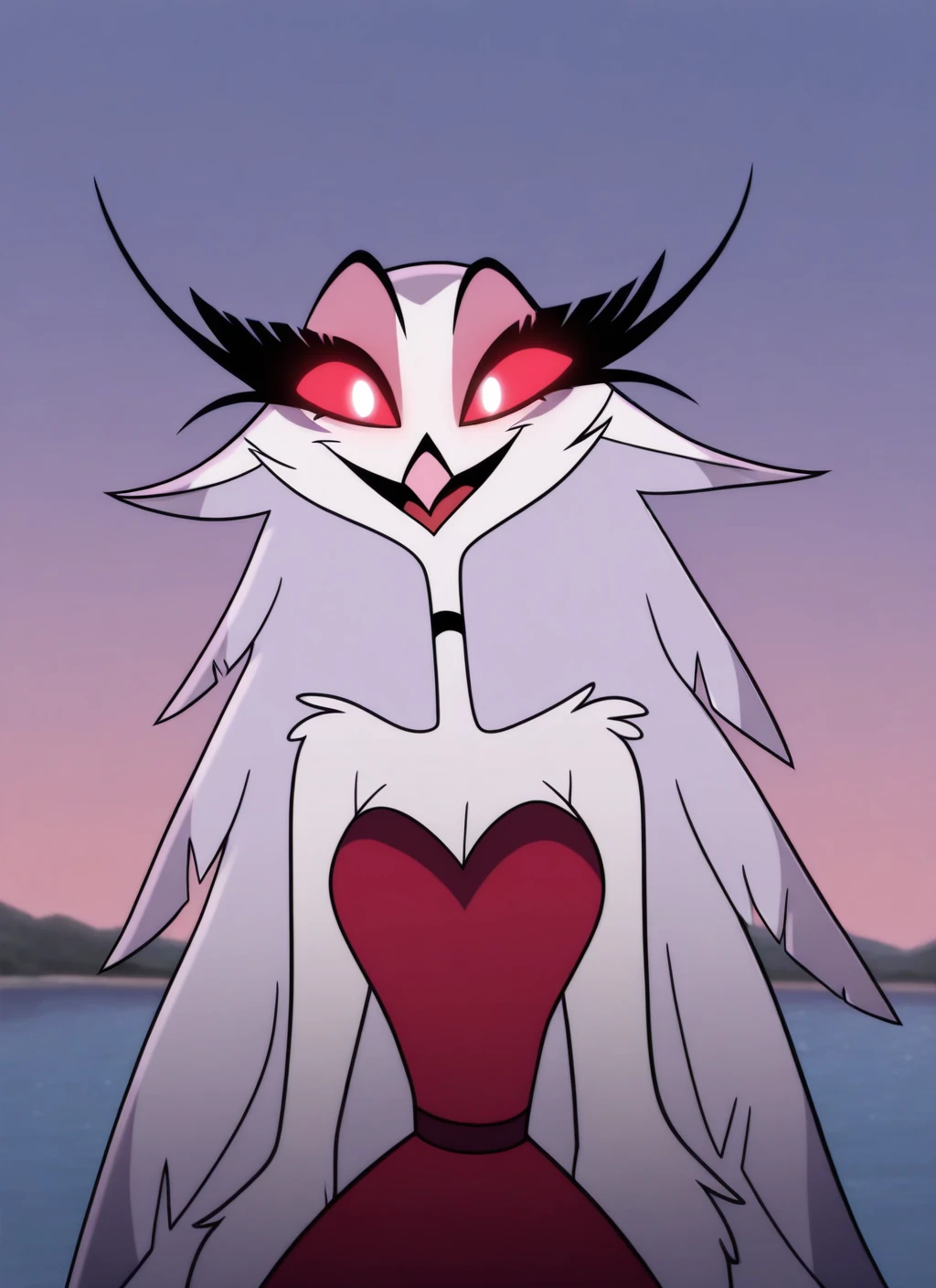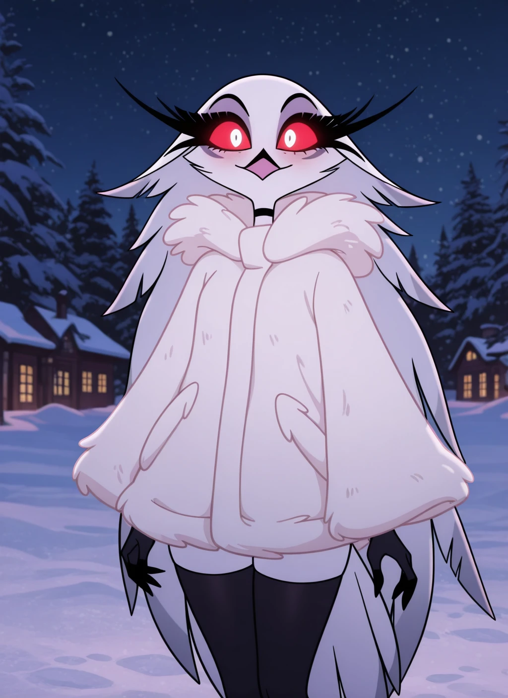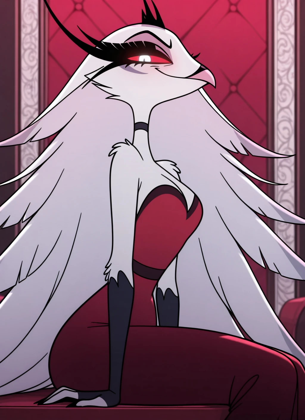 Stella: stla, anthro, avian, white feathers, white hair, feather hair, long hair, red sclera, white eyes