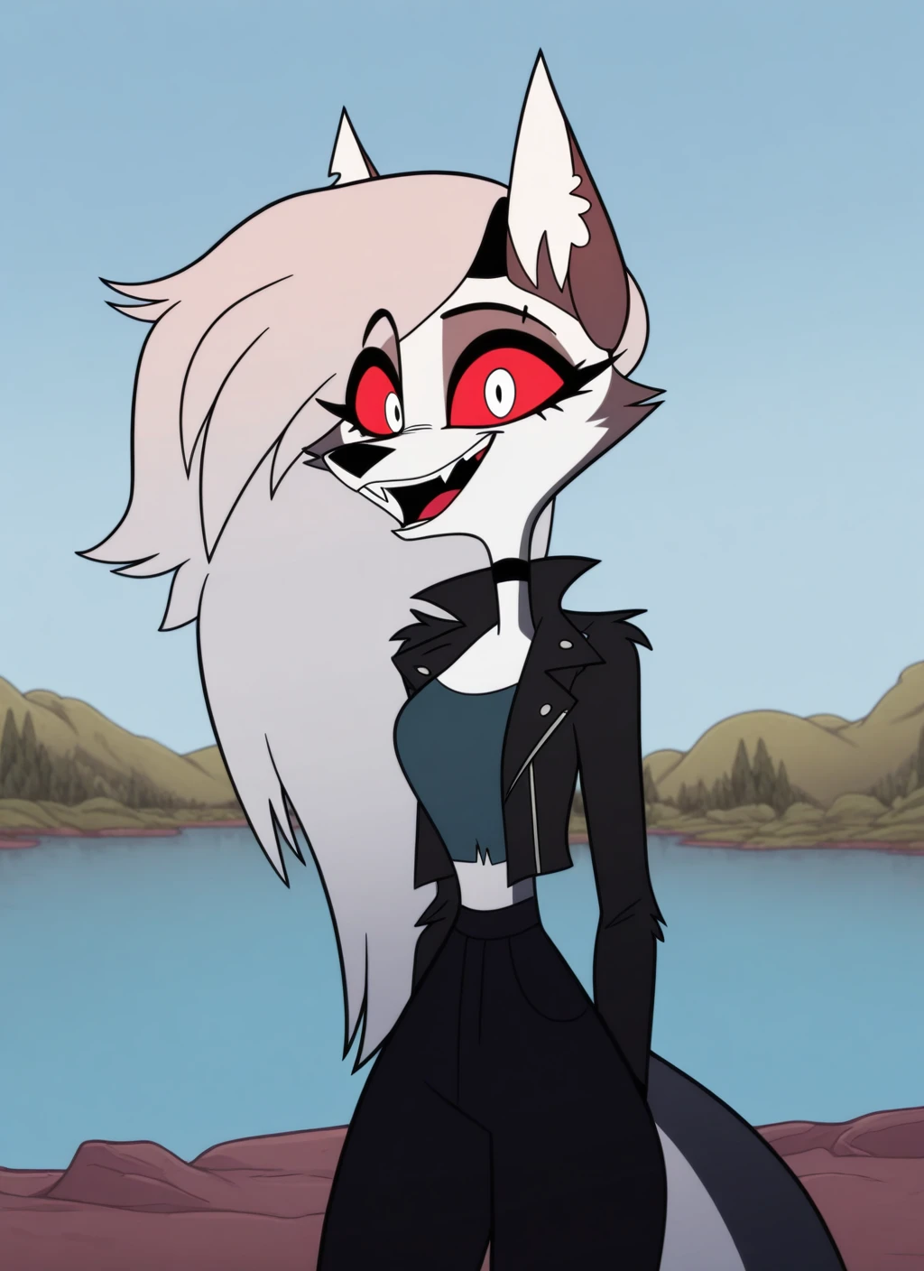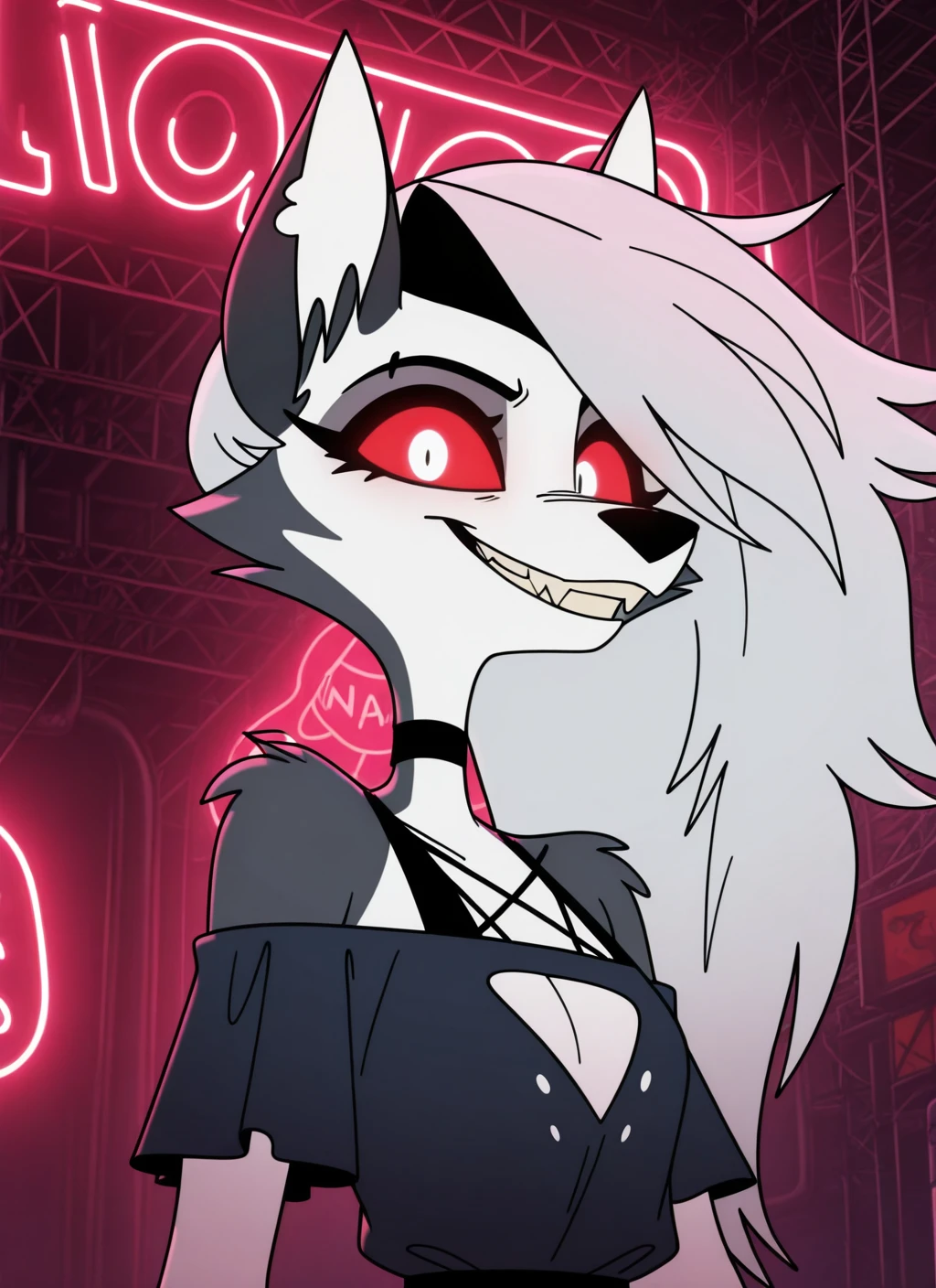 Loona: l00na, anthro, furry, red sclera, white eyes, white fur, gray fur, tail, white hair, long hair, shaved hair