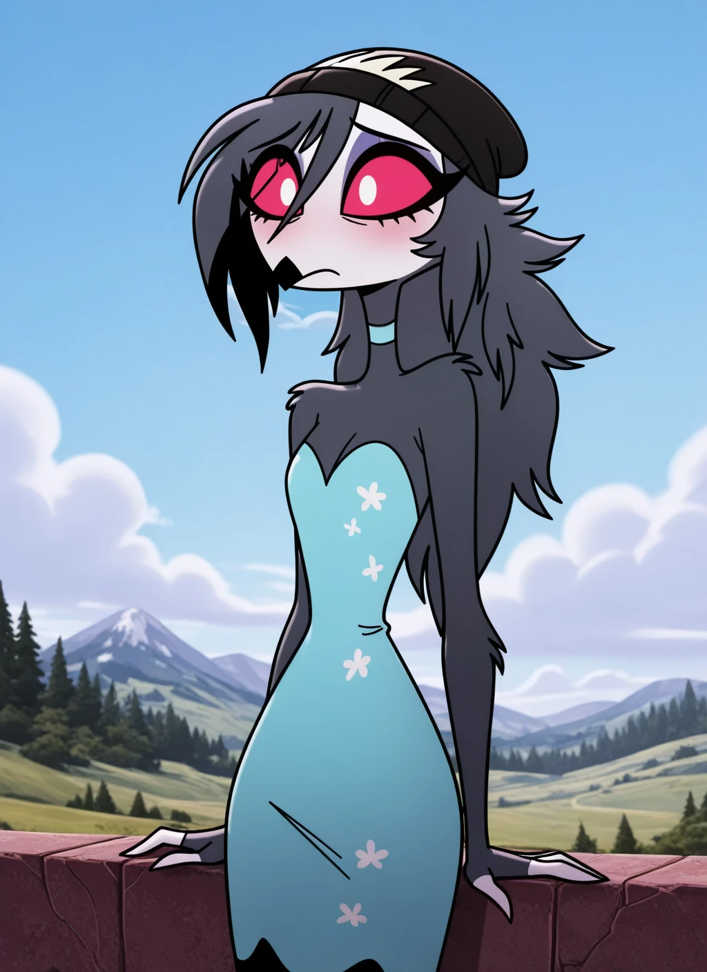 Octavia: octv, anthro, avian, gray feathers, gray hair, pink sclera, white eyes, feather tail, black beanie // you might need to use 'white face'