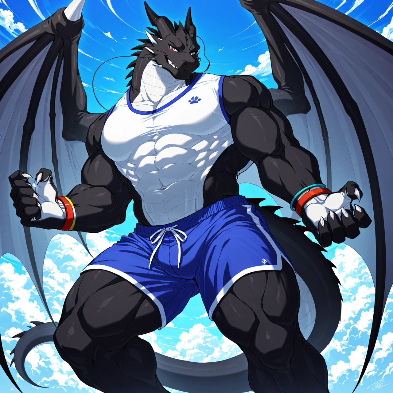 hatsu tori,dragon,scalie,black body,claws,membranous wings,tail,bracelet on right hand