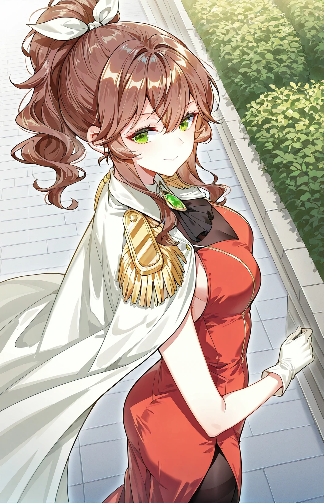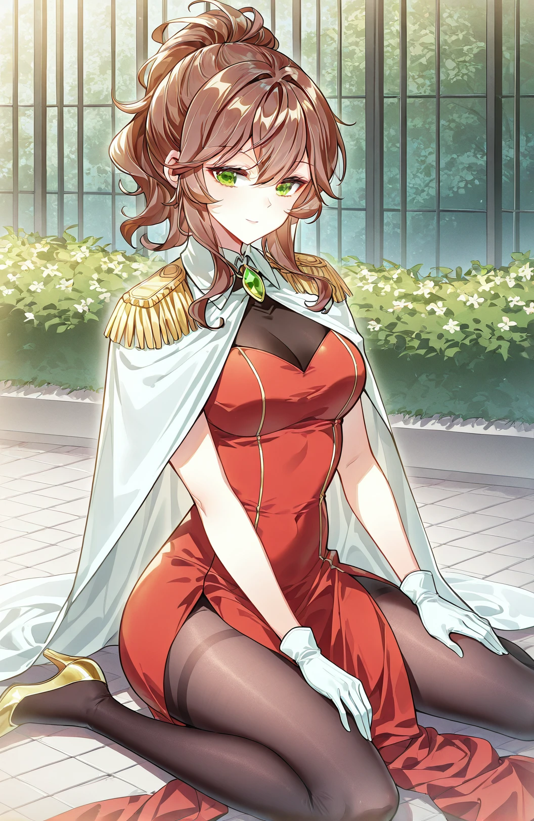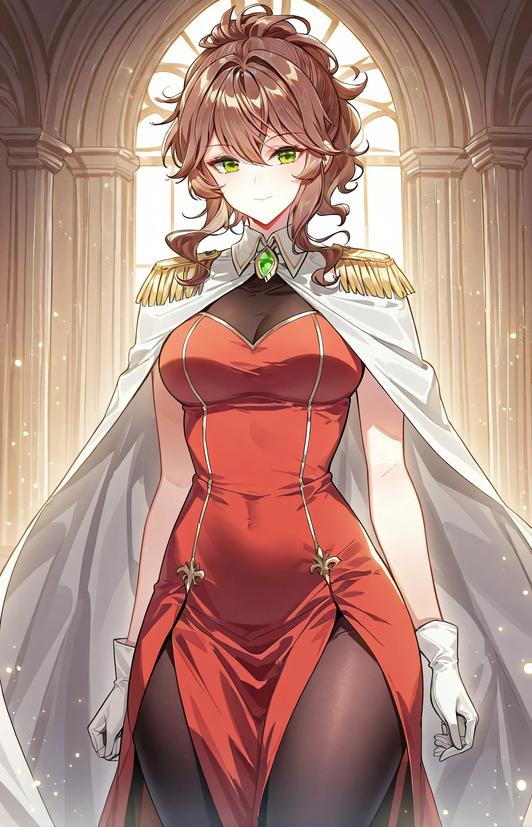 Weier_outfit, white cape, golden shoulder epaulettes, red dress, black chest panel, sleeveless, thigh slit dress, gold trim, black pantyhose, green gemstone brooch, white gloves, high heels, gold heels,