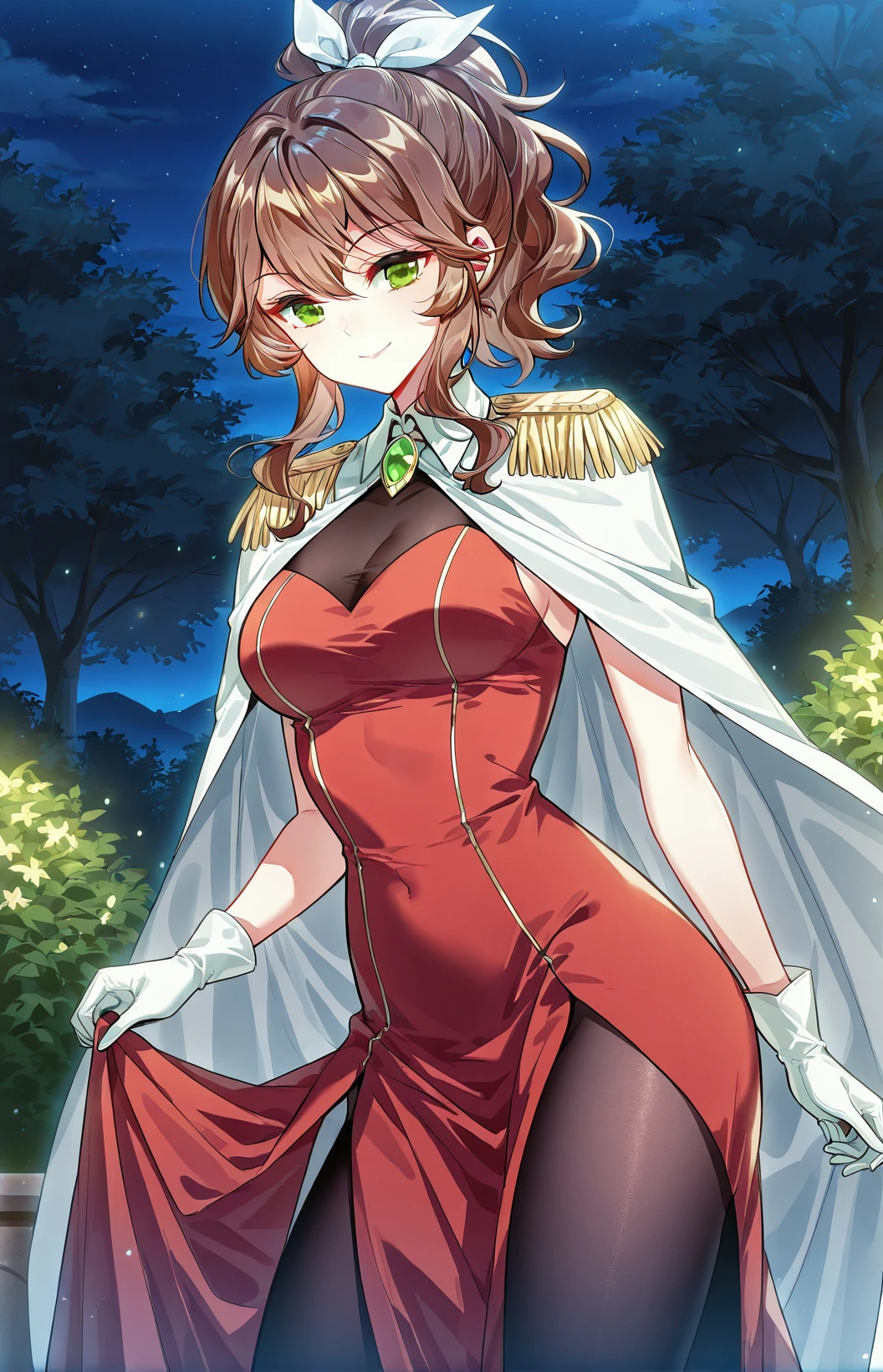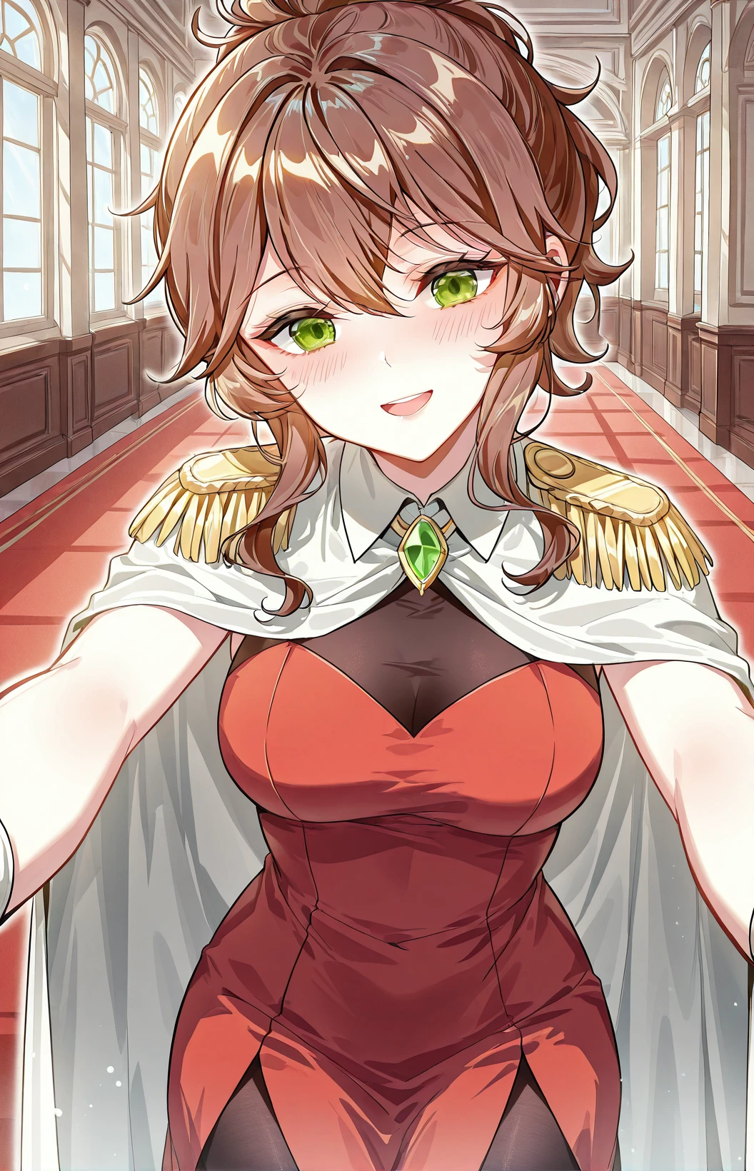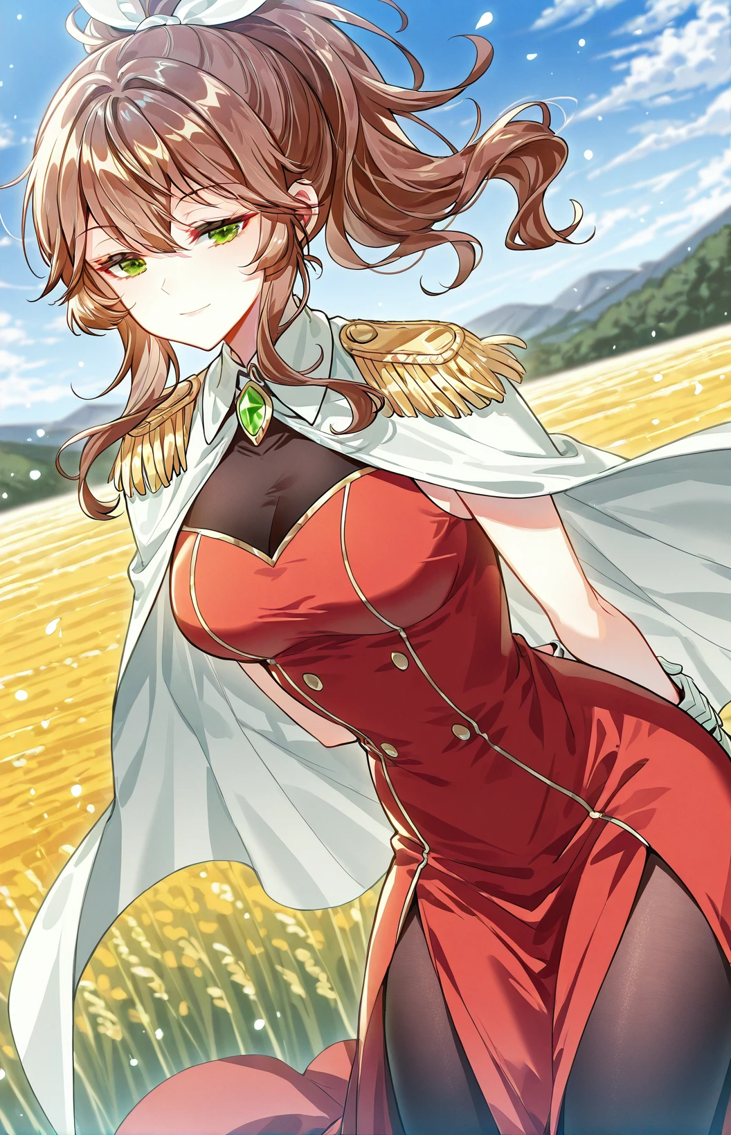 Weier_outfit, white cape, golden shoulder epaulettes, red dress, black chest panel, sleeveless, thigh slit dress, gold trim, black pantyhose, green gemstone brooch, white gloves, high heels, gold heels,