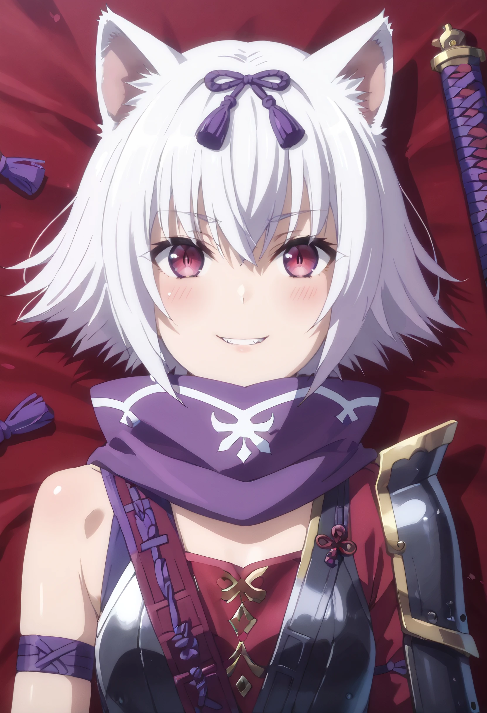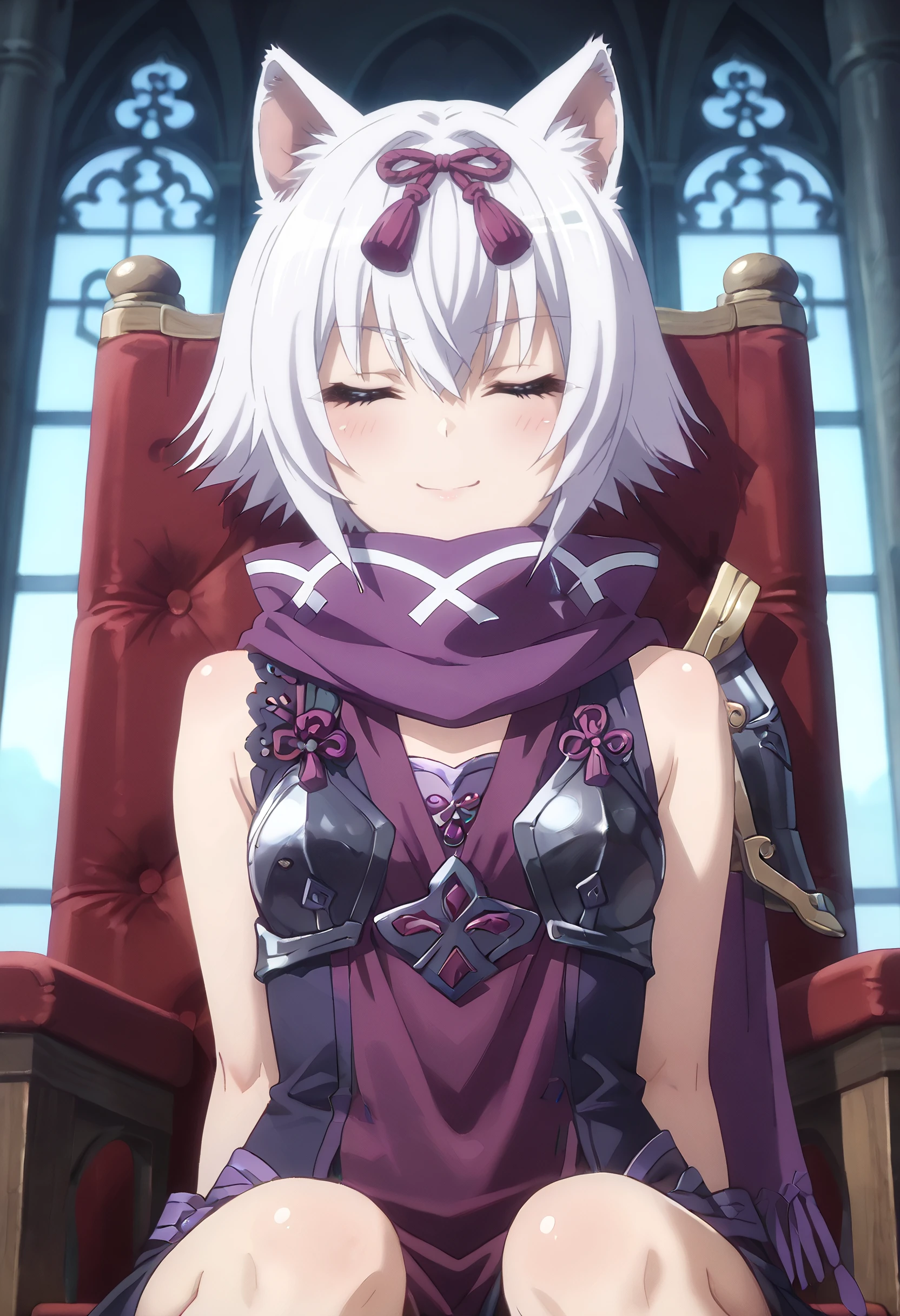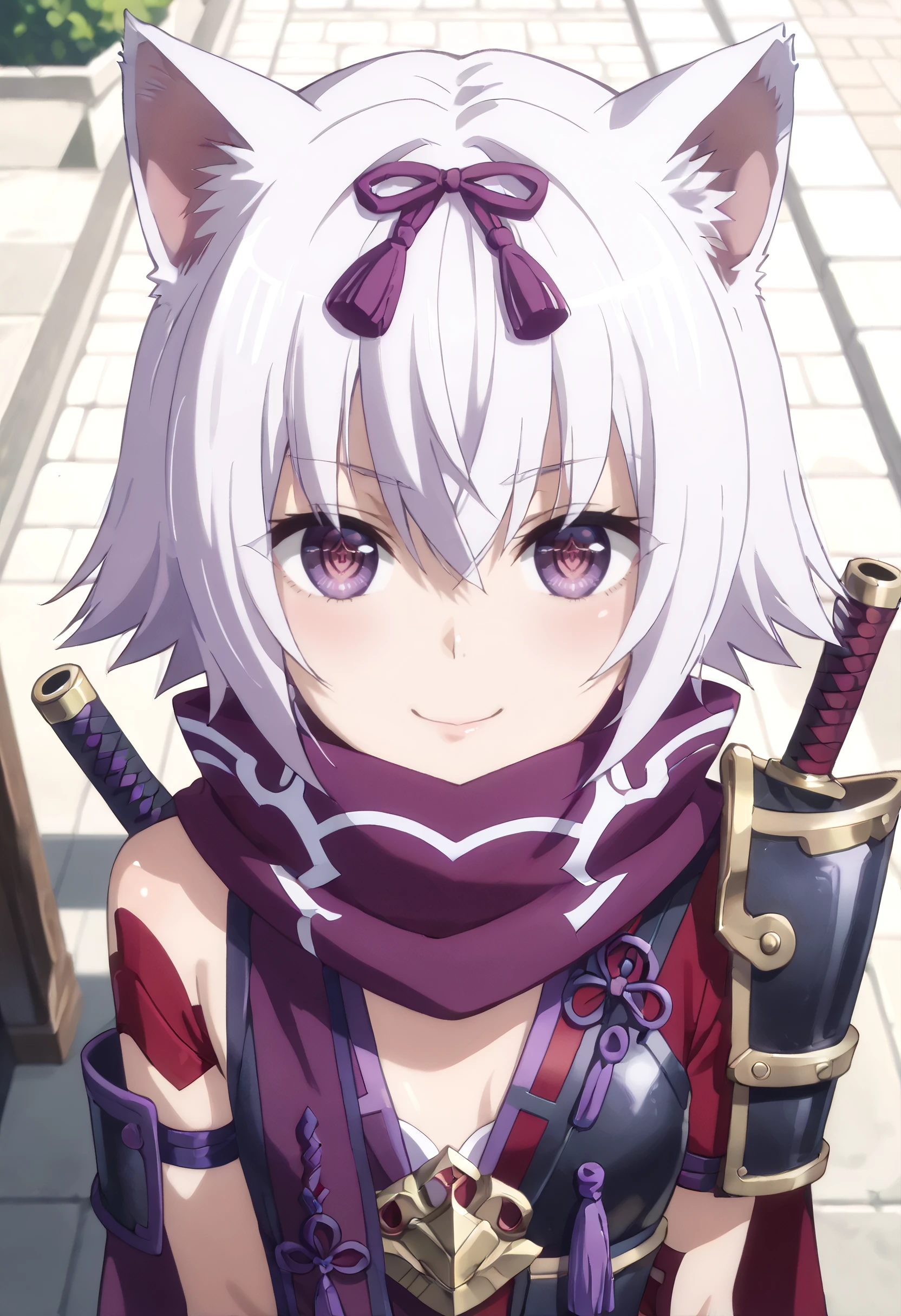 hair ribbon, ribbon, scarf, shoulder armor, purple scarf, purple ribbon,