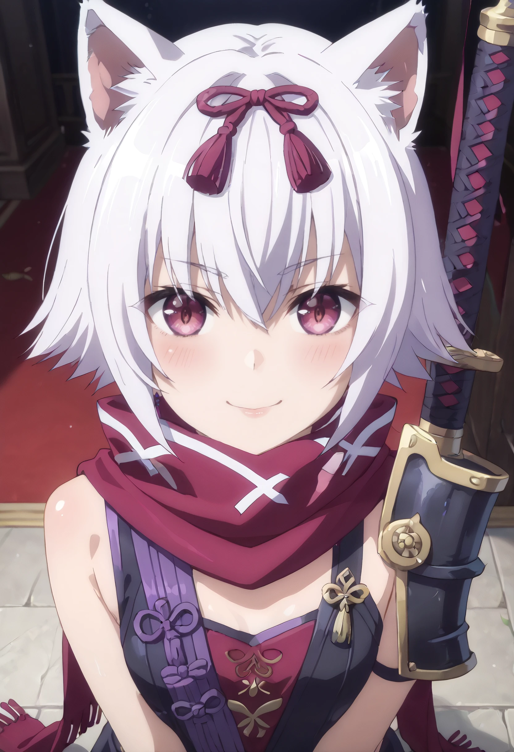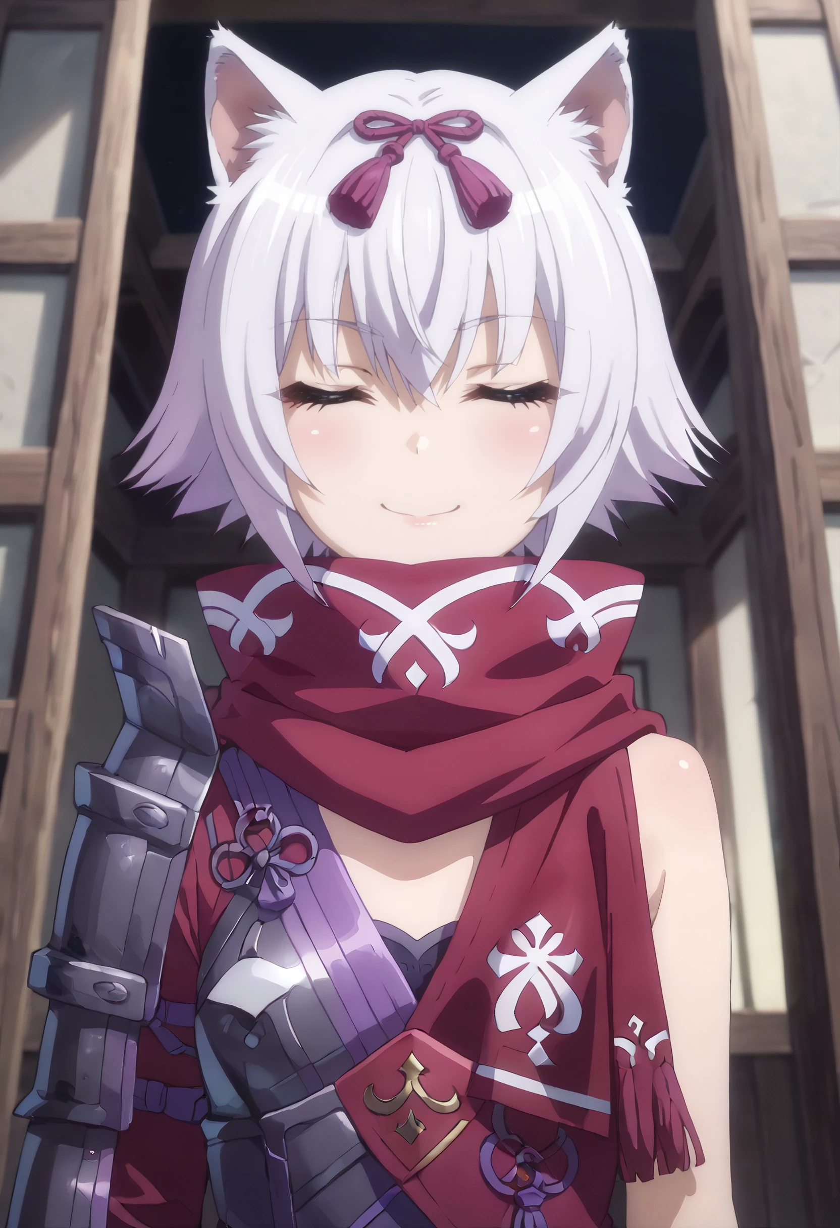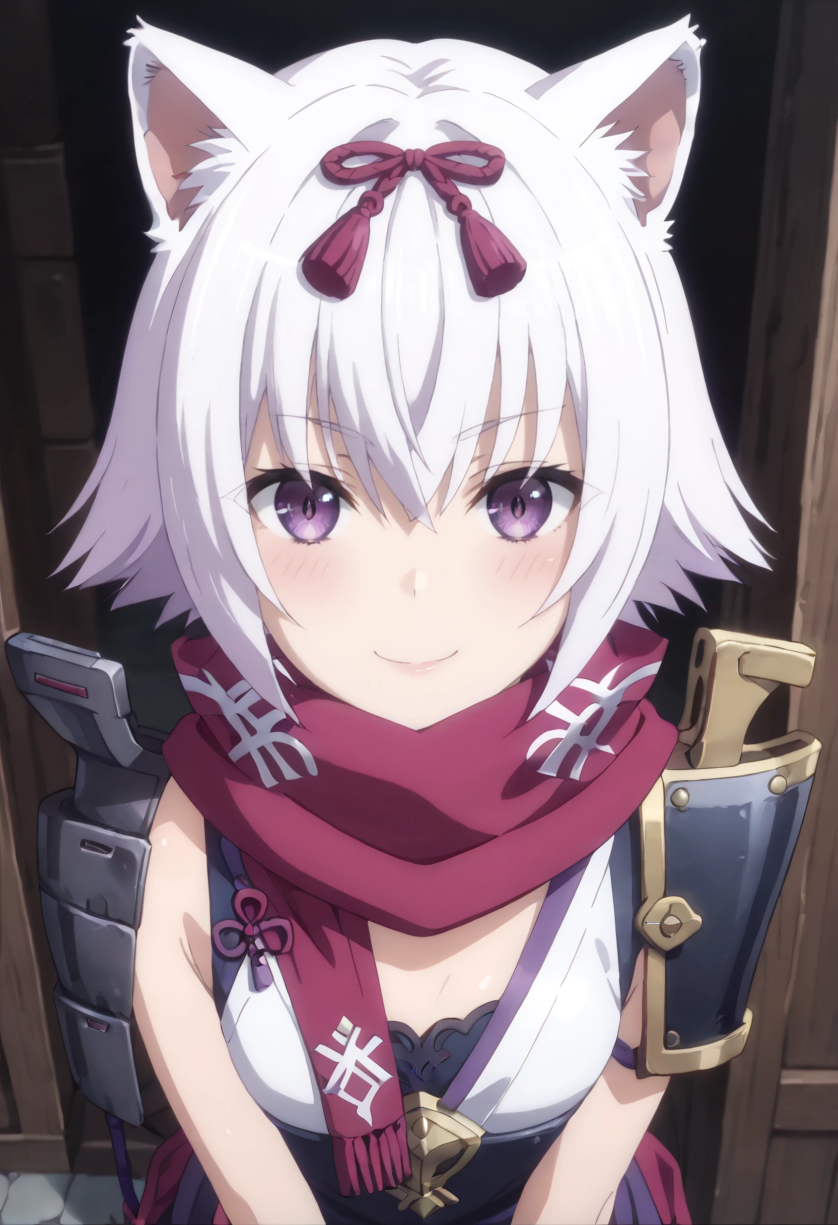 hair ribbon, ribbon, scarf, shoulder armor, purple scarf, purple ribbon,