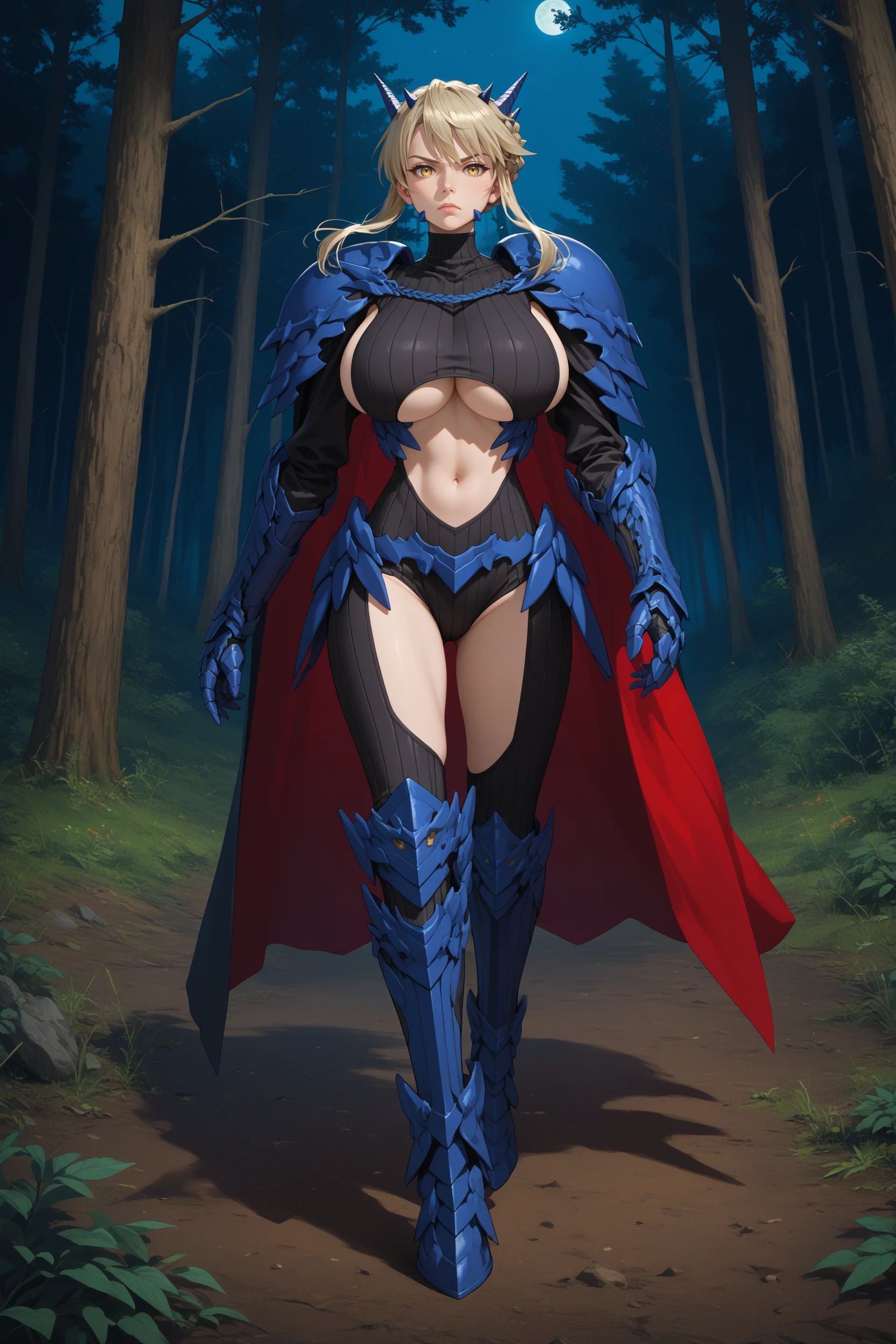 Add "black bodysuit, center opening, clothing cutout, underboob, navel, long sleeves, armor, pauldrons, red and black cape, armored boots, gauntlets" for her 3rd Ascension look.
