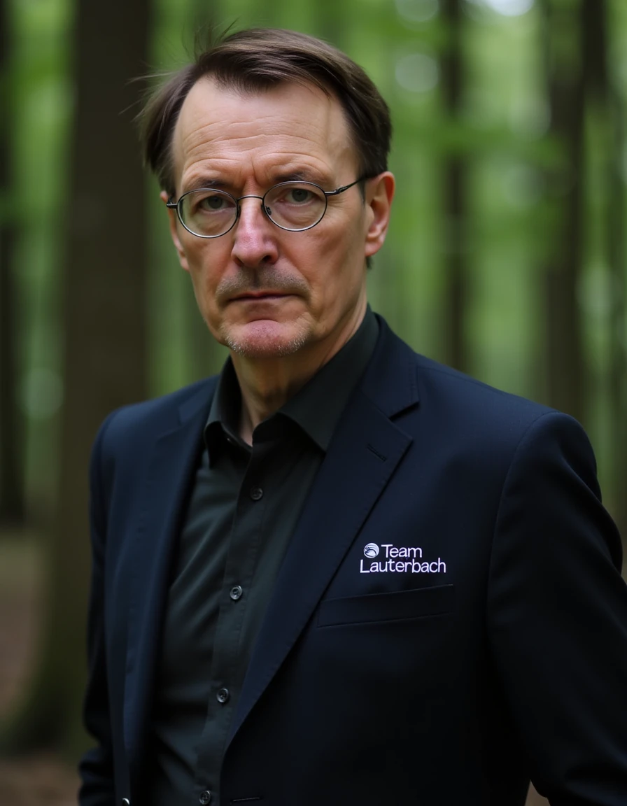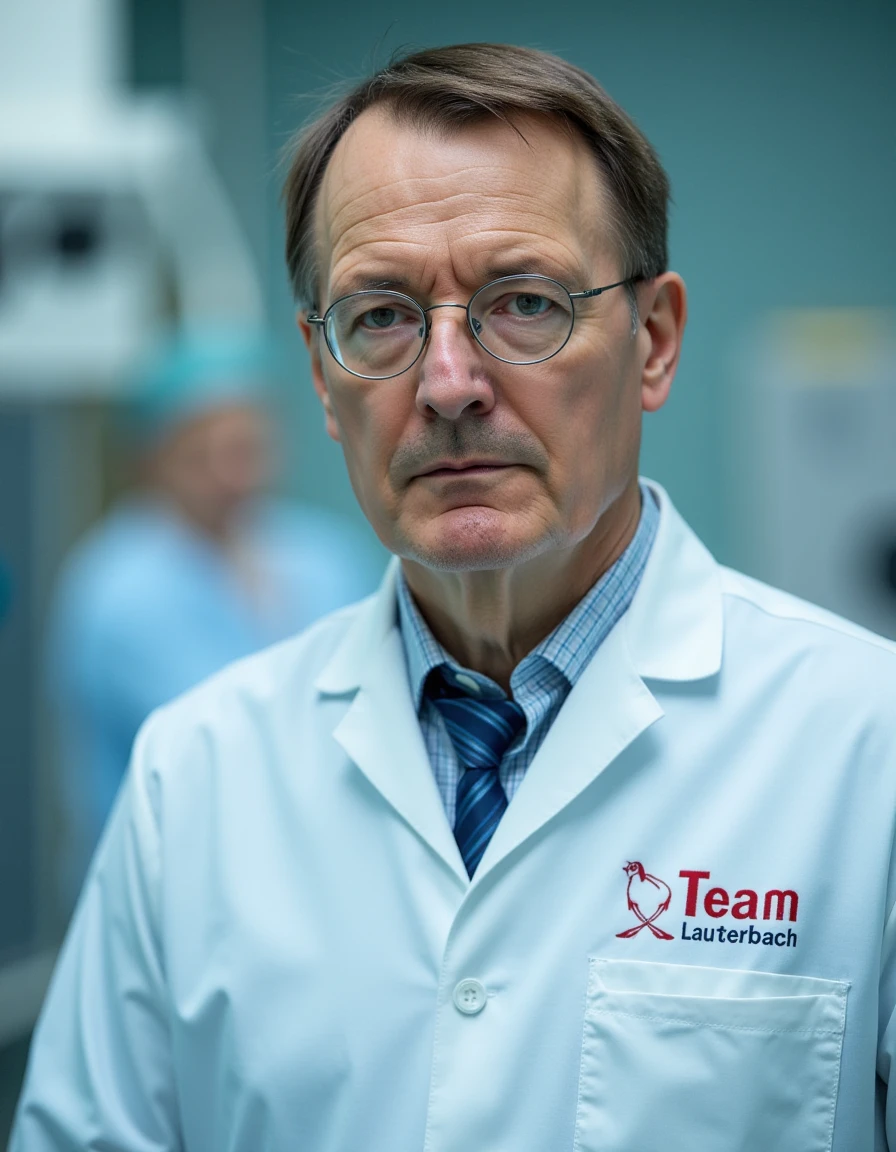example prompt: from below, portrait of a man as doctor in labor, wears nickel glasses, wears s Doctor's coat with imprint "Team Lauterbach", serious, LauterLoraXL