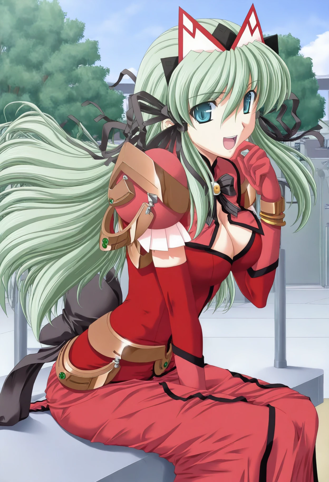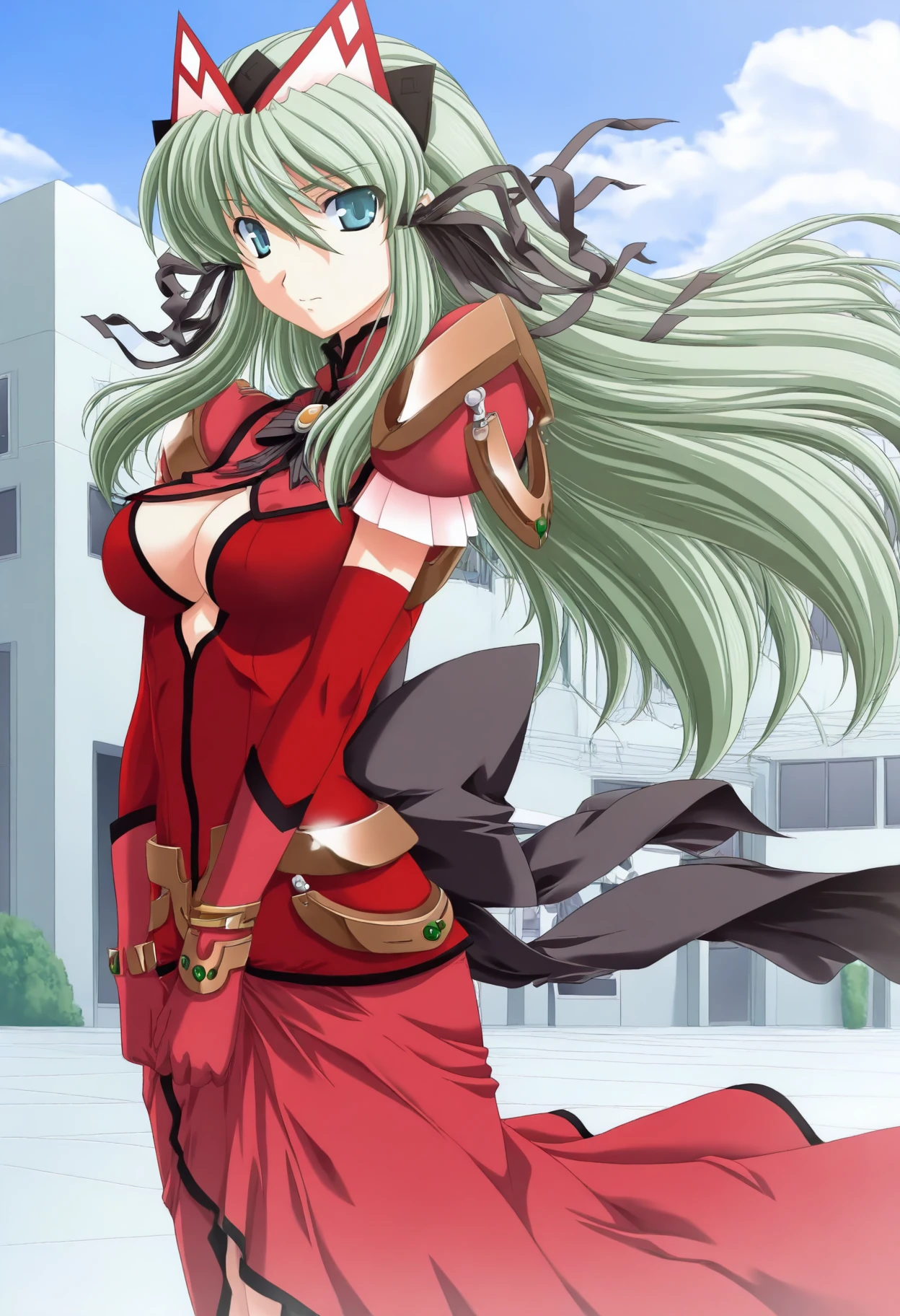 Clothing: red dress, cleavage cutout, black bowtie, back bow, yellow brooch, armor, juliet sleeves, elbow gloves, red skirt,