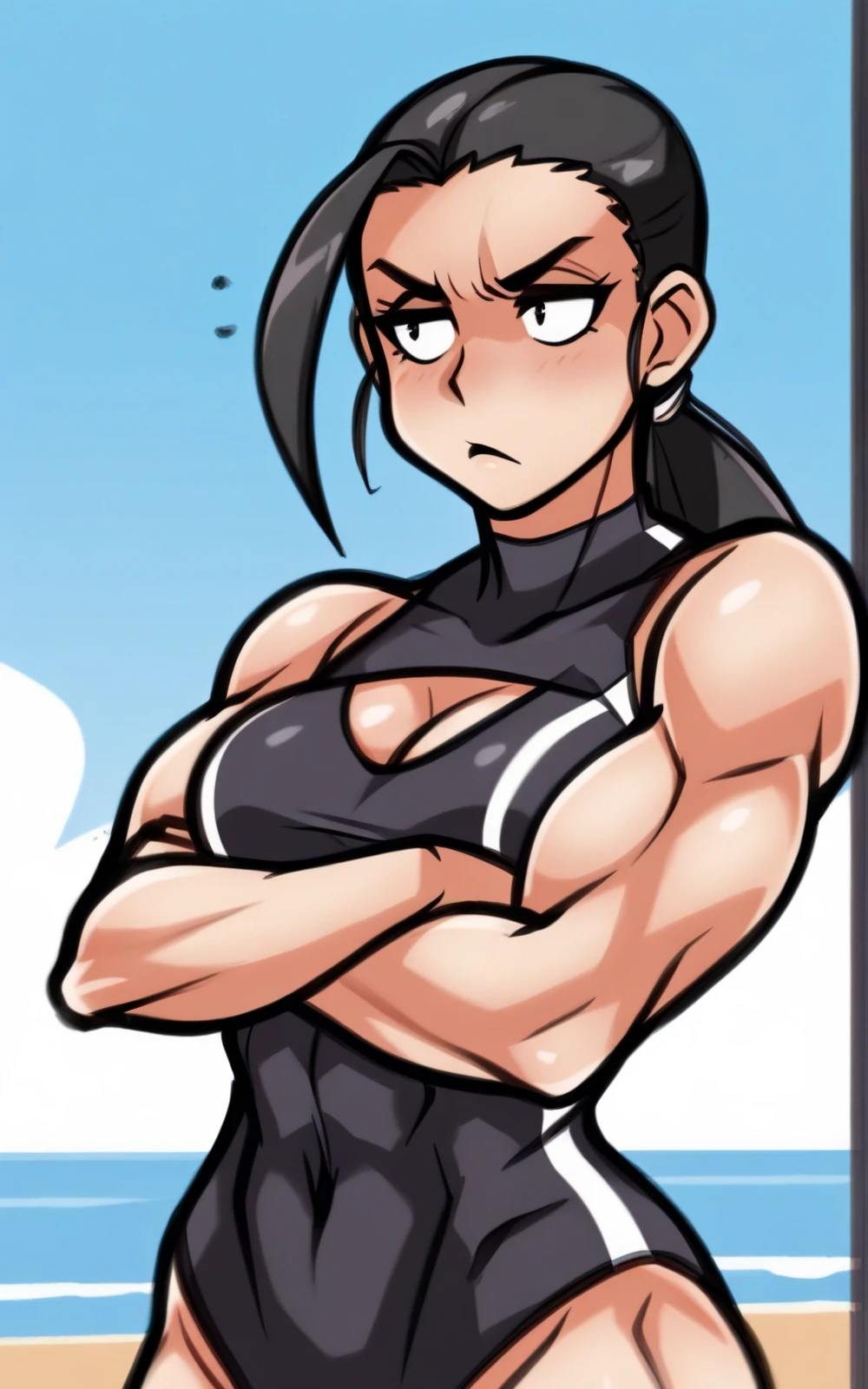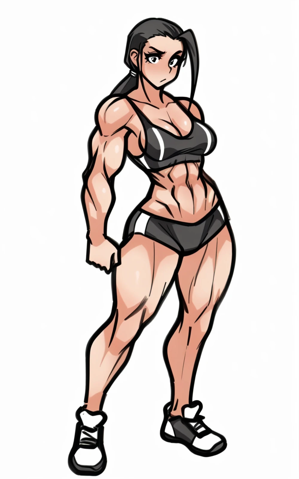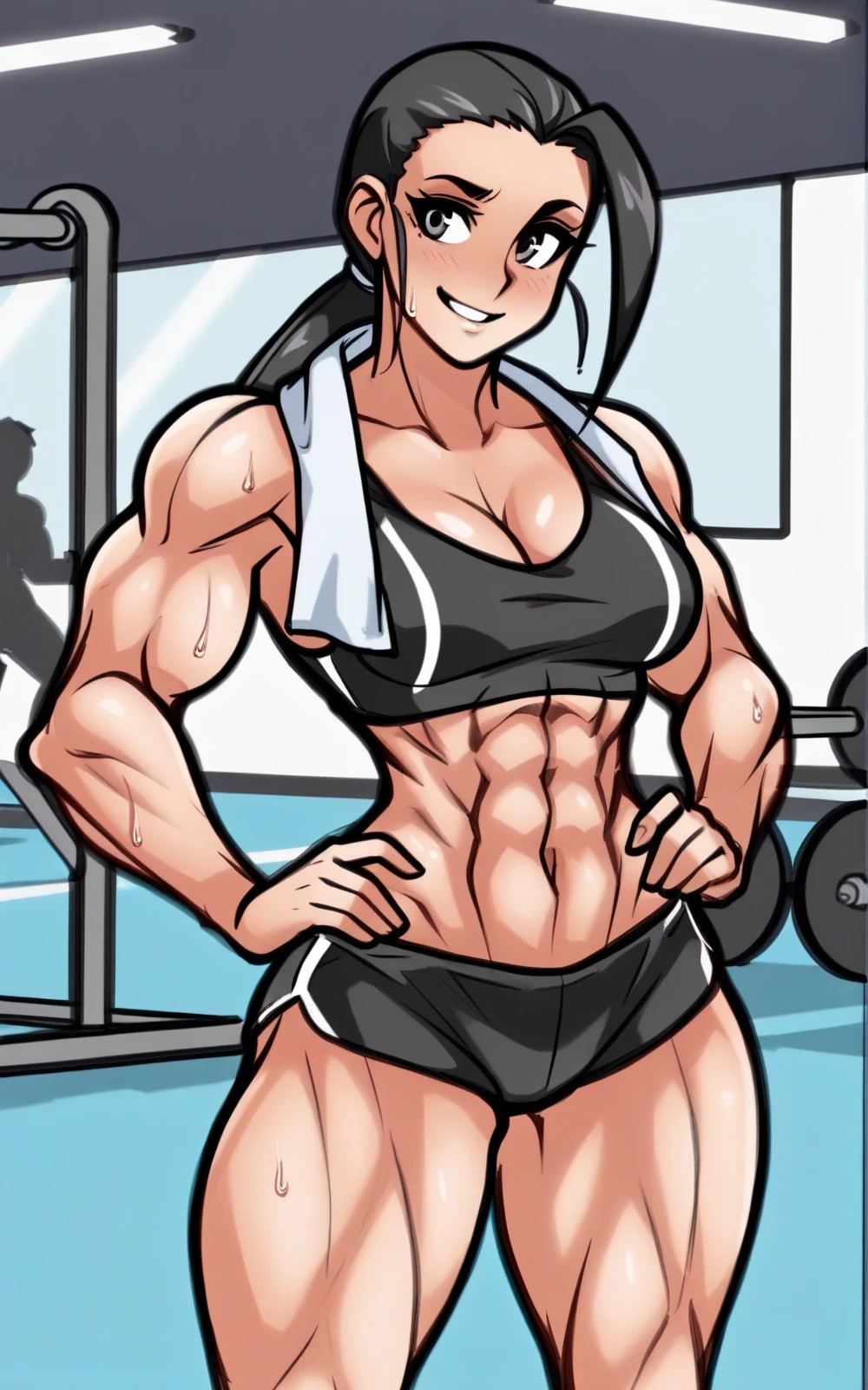 Reinforcement Tags: black hair, breasts, muscular female, ponytail, abs, navel, long hair