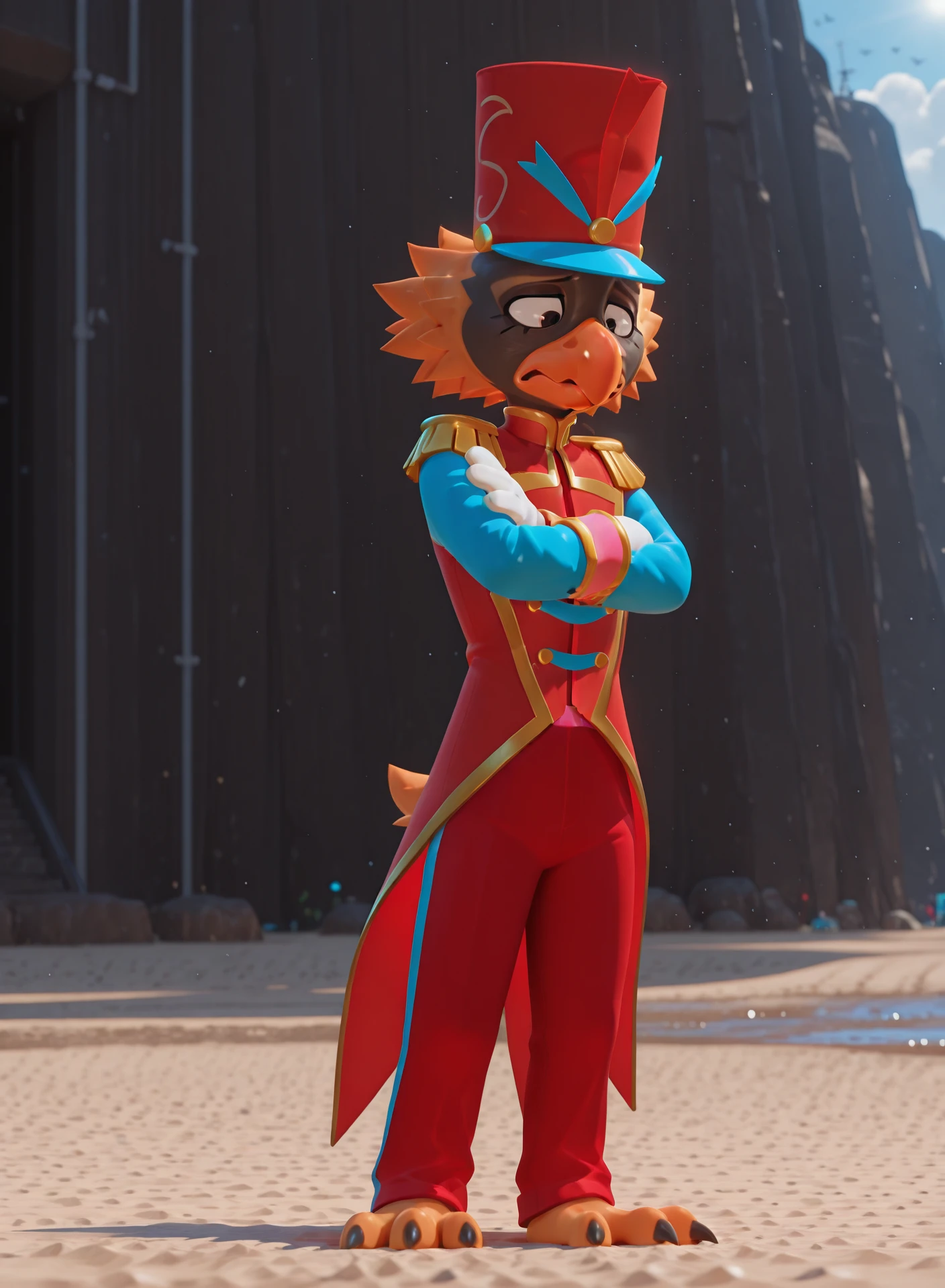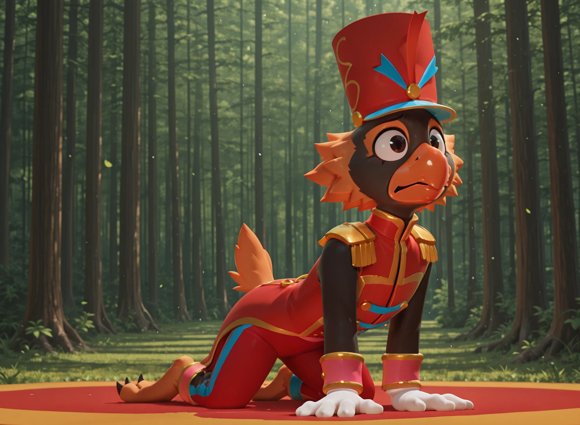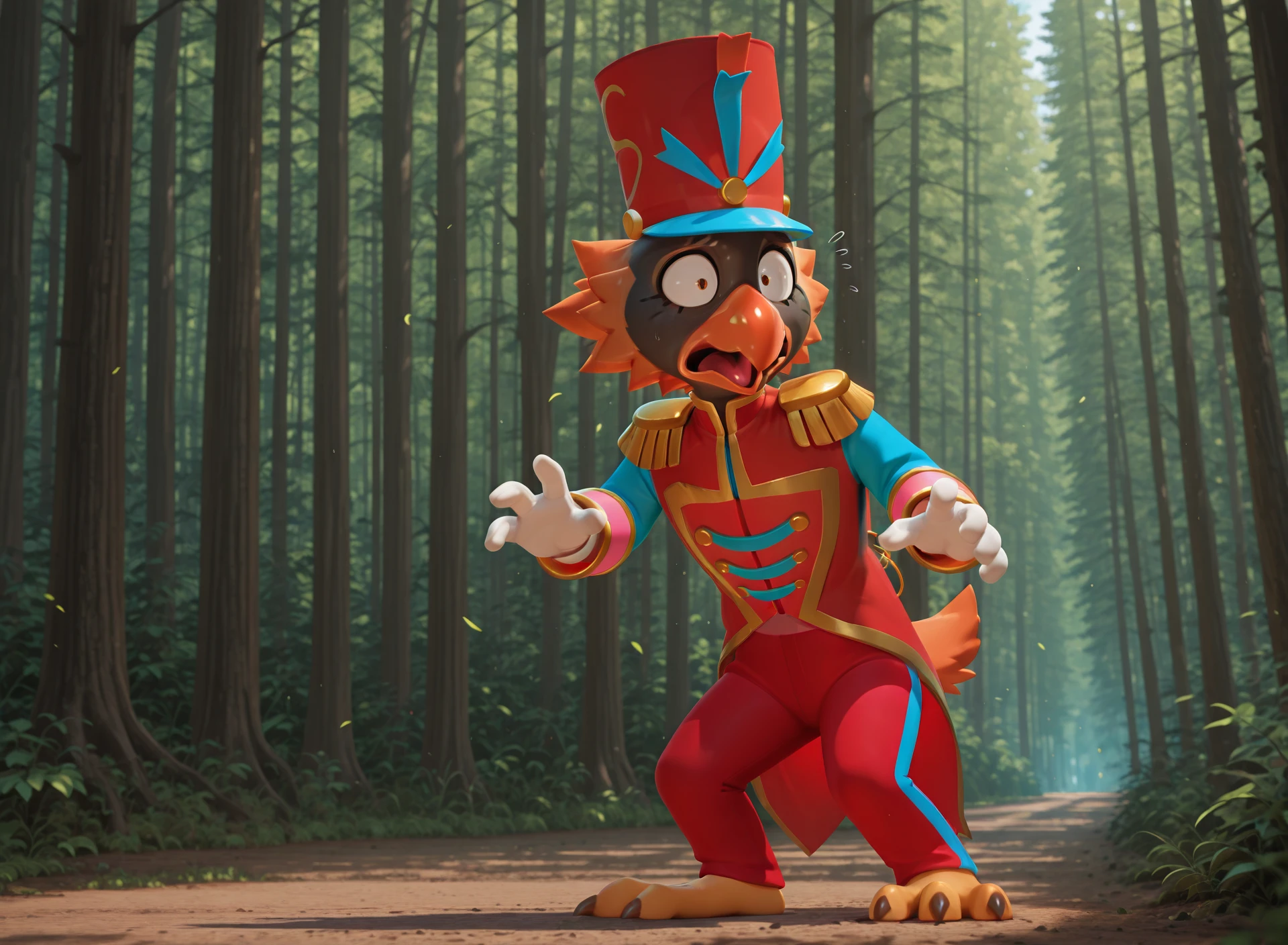 cosmo, male, bird, black skin, orange beak, 3 toes, bird legs, marching band uniform, red pants, conductor's hat, white gloves, orange hair,