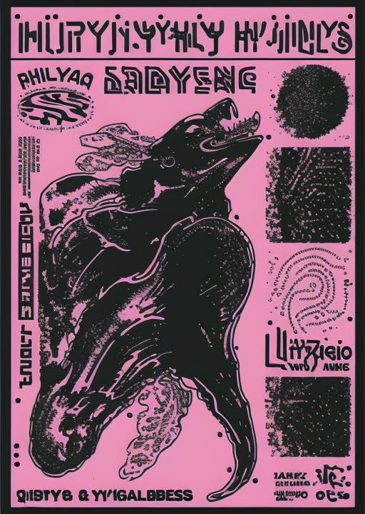 Don't hesitate to mix these. Some other keywords include: "complementary colors", "flat" & "print" (will give a rough inked typed of image), "grid", "font" and "gothic font". You can still experiment with the keyword "poster", but it'll be less good than the Acid Poster Lora.
