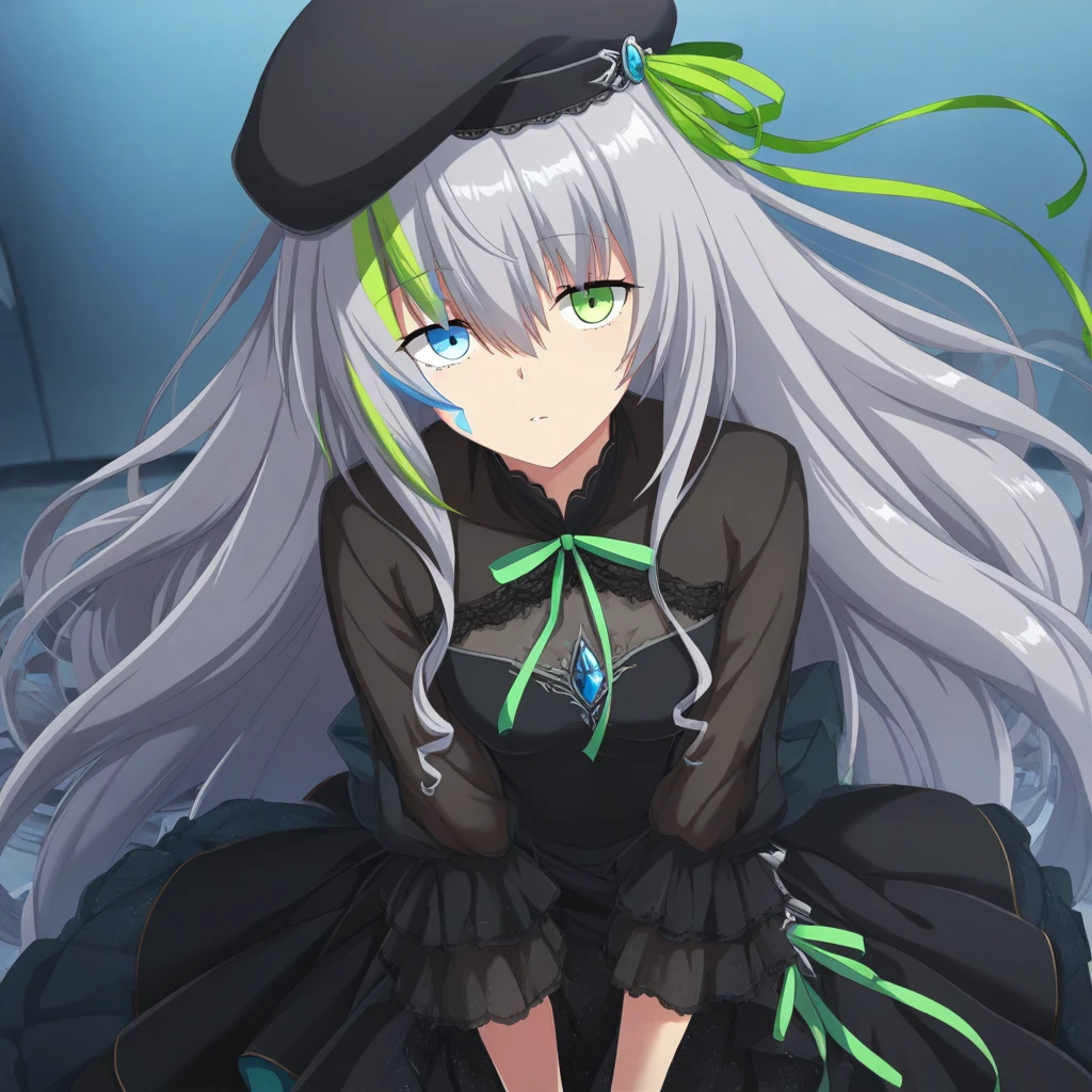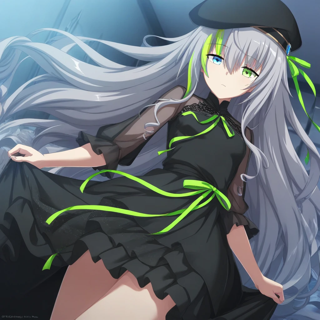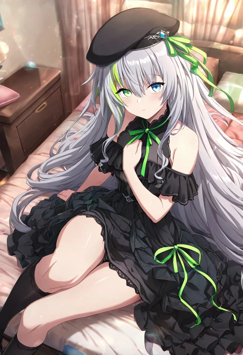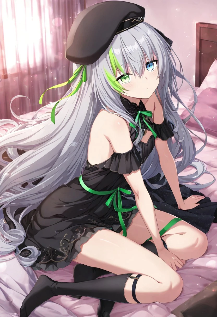MilvaDRESS,Black dress,black hat,green ribbon,bare shoulders,black kneehighs,