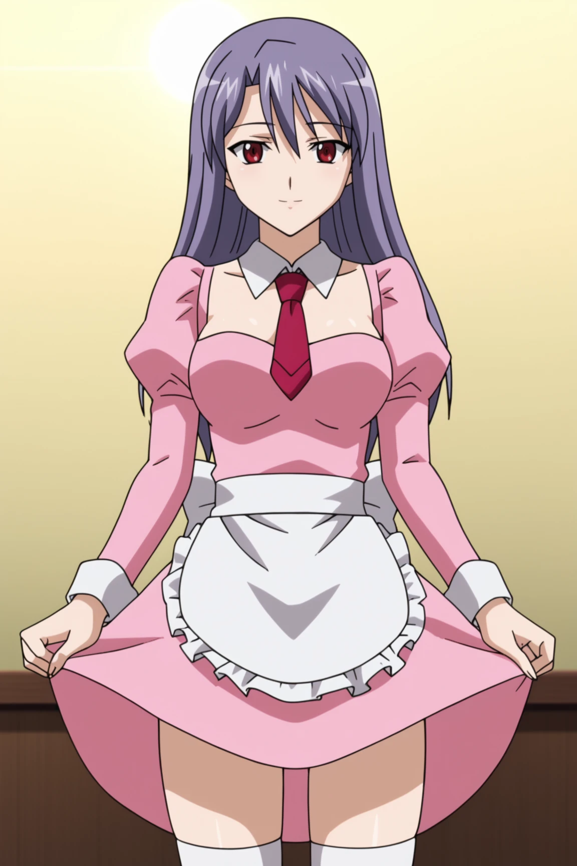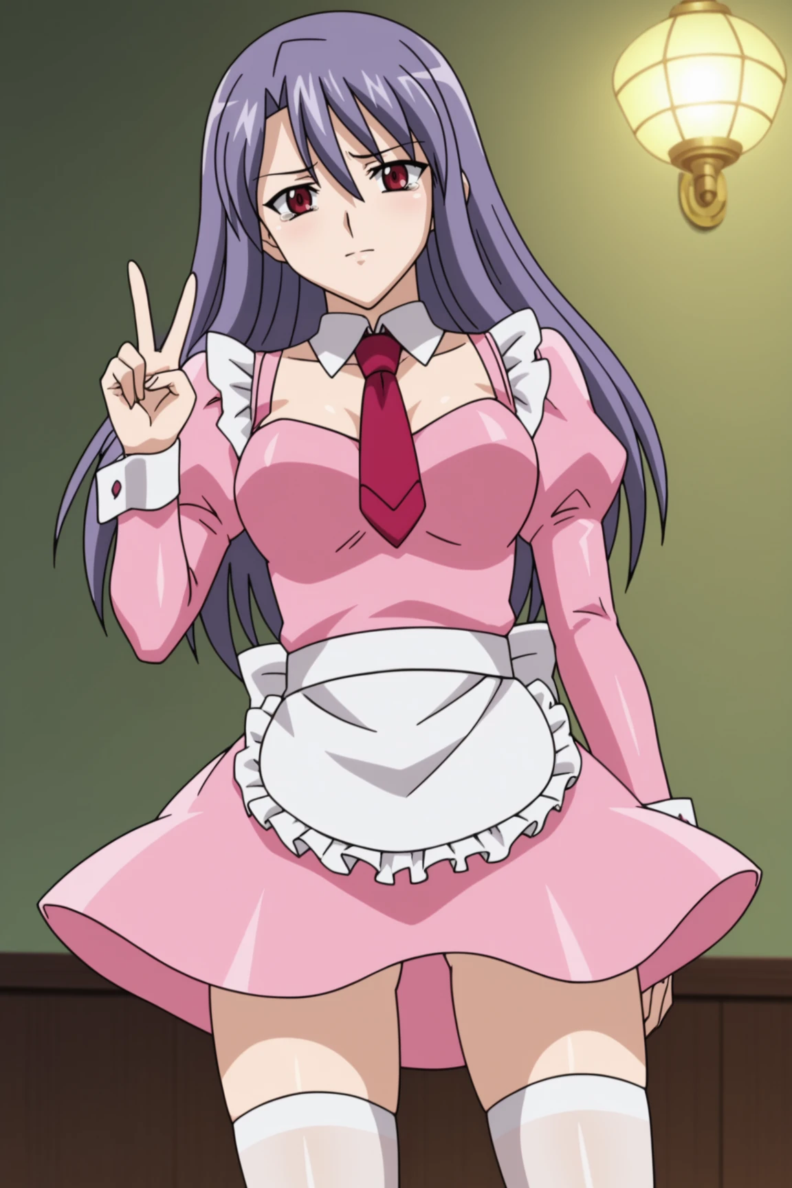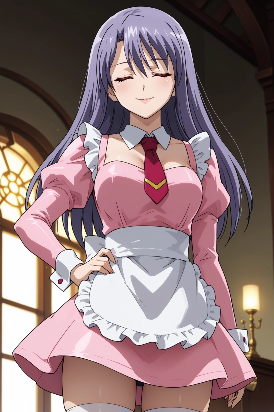 maidmiyu, maid, apron, pink dress, frills, necktie, detached sleeves, long sleeves, puffy sleeves, white thighhighs,
