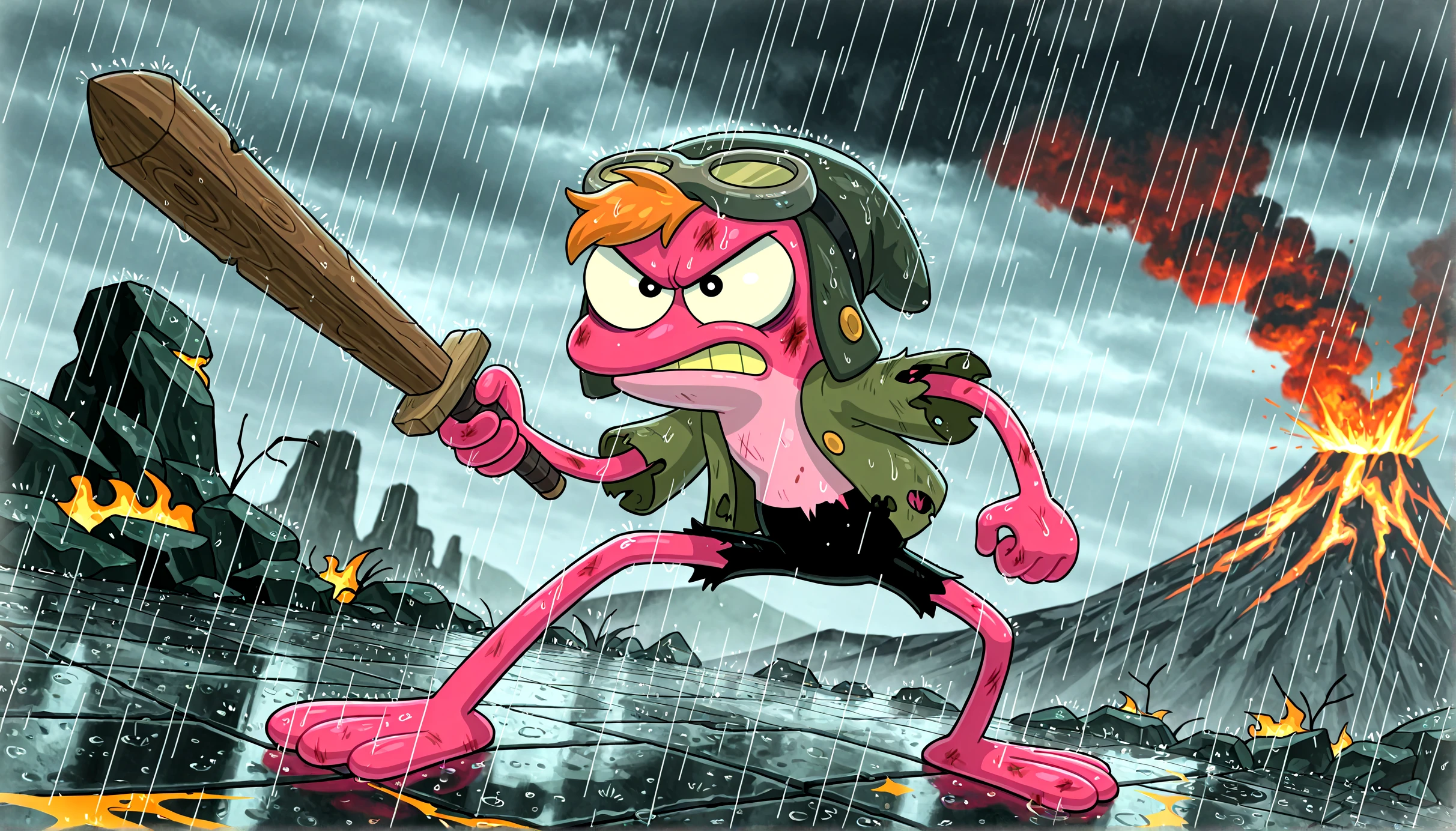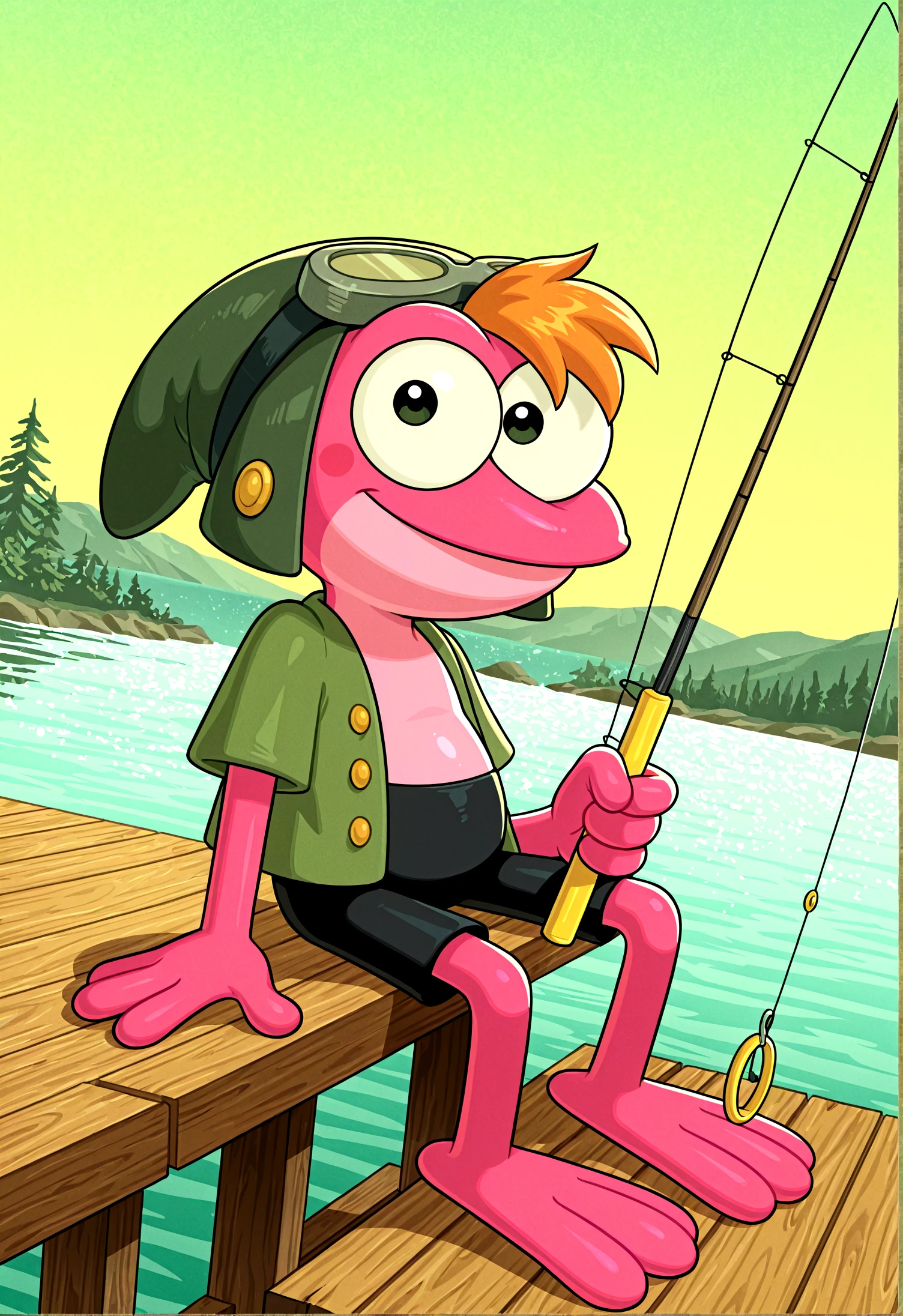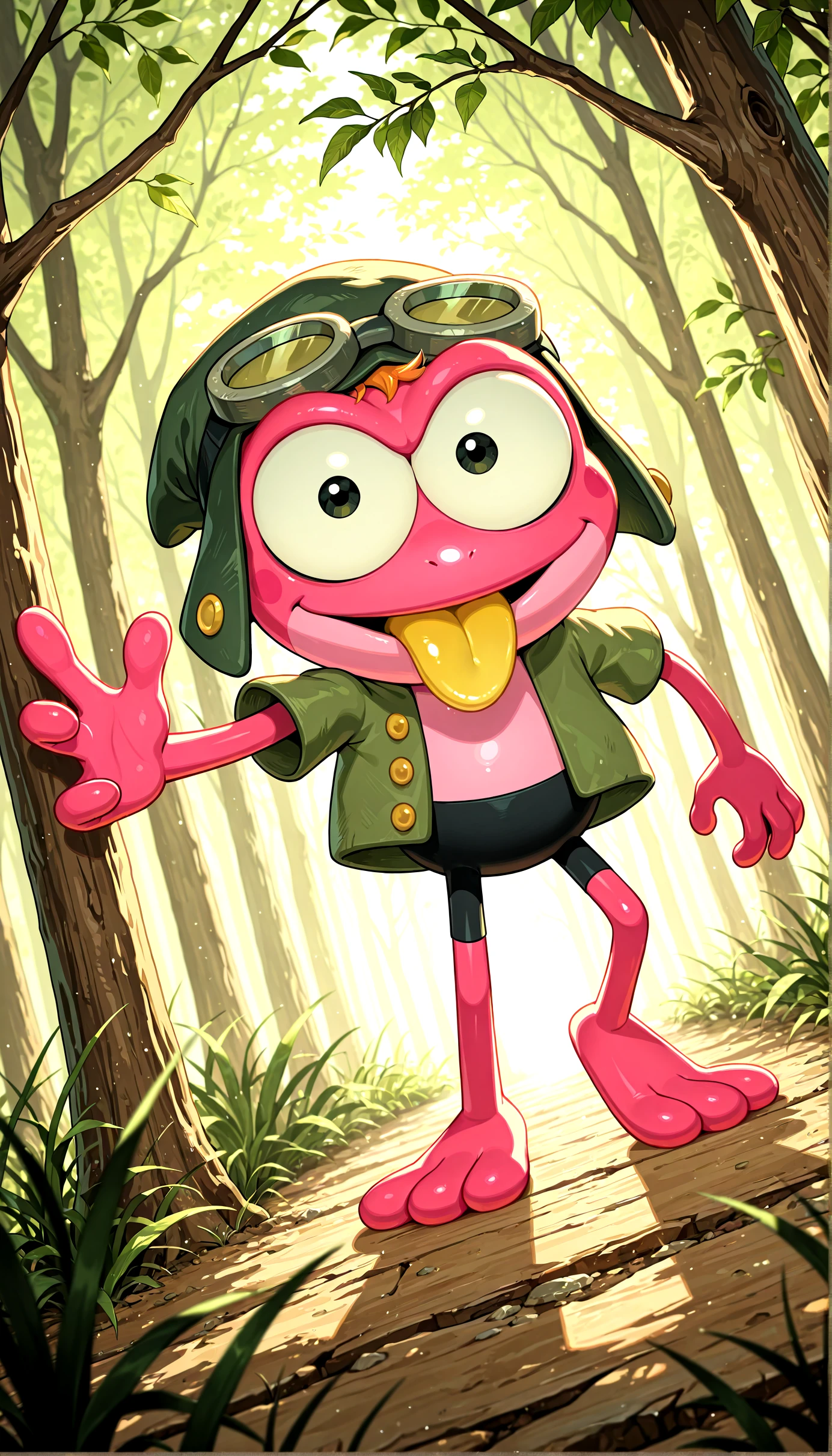 Sprig Plantar, pink skin, orange hair, amphibian, frog, cartoon, clothed, goggles, hat, 2 toes