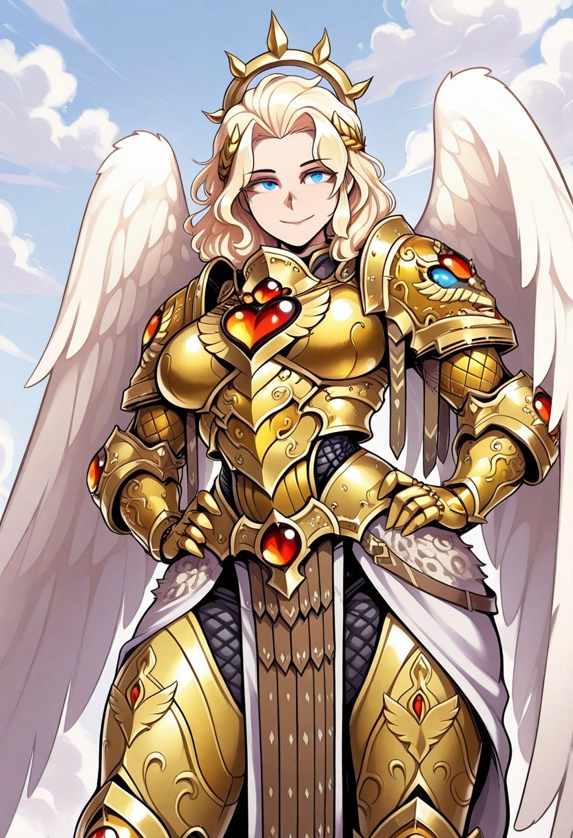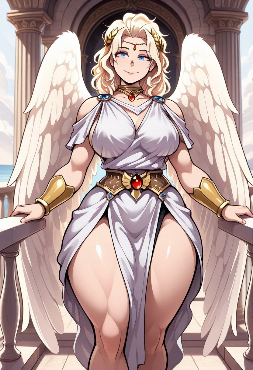 SanguinaXL, blonde hair, short hair, blue eyes, large breasts, angel wings, white wings
