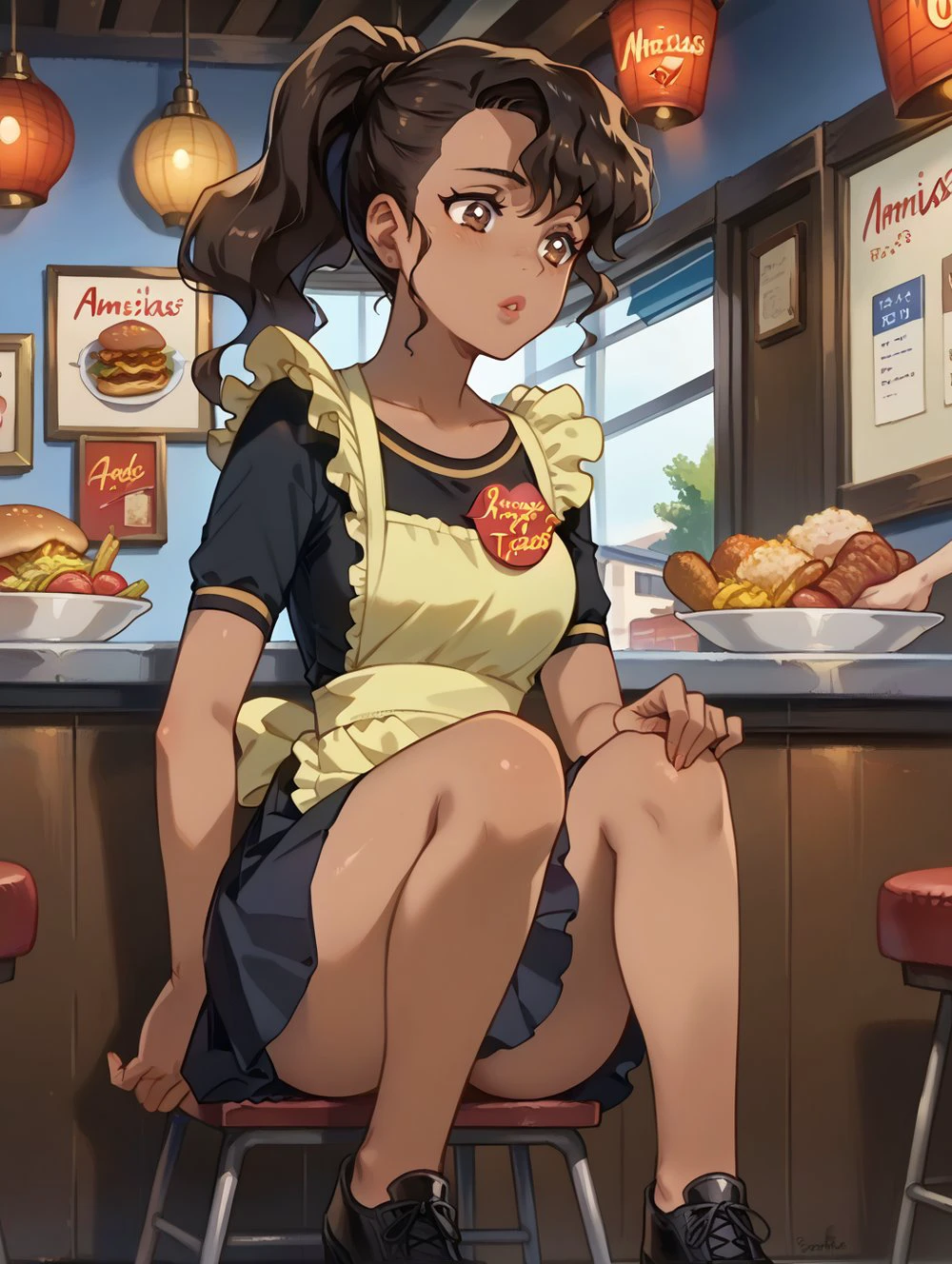 1girl,Tanned skin,dark brown hair,wavy hair tied in a ponytail,apron,black shirt,black short skirt,black shoes,Margarita