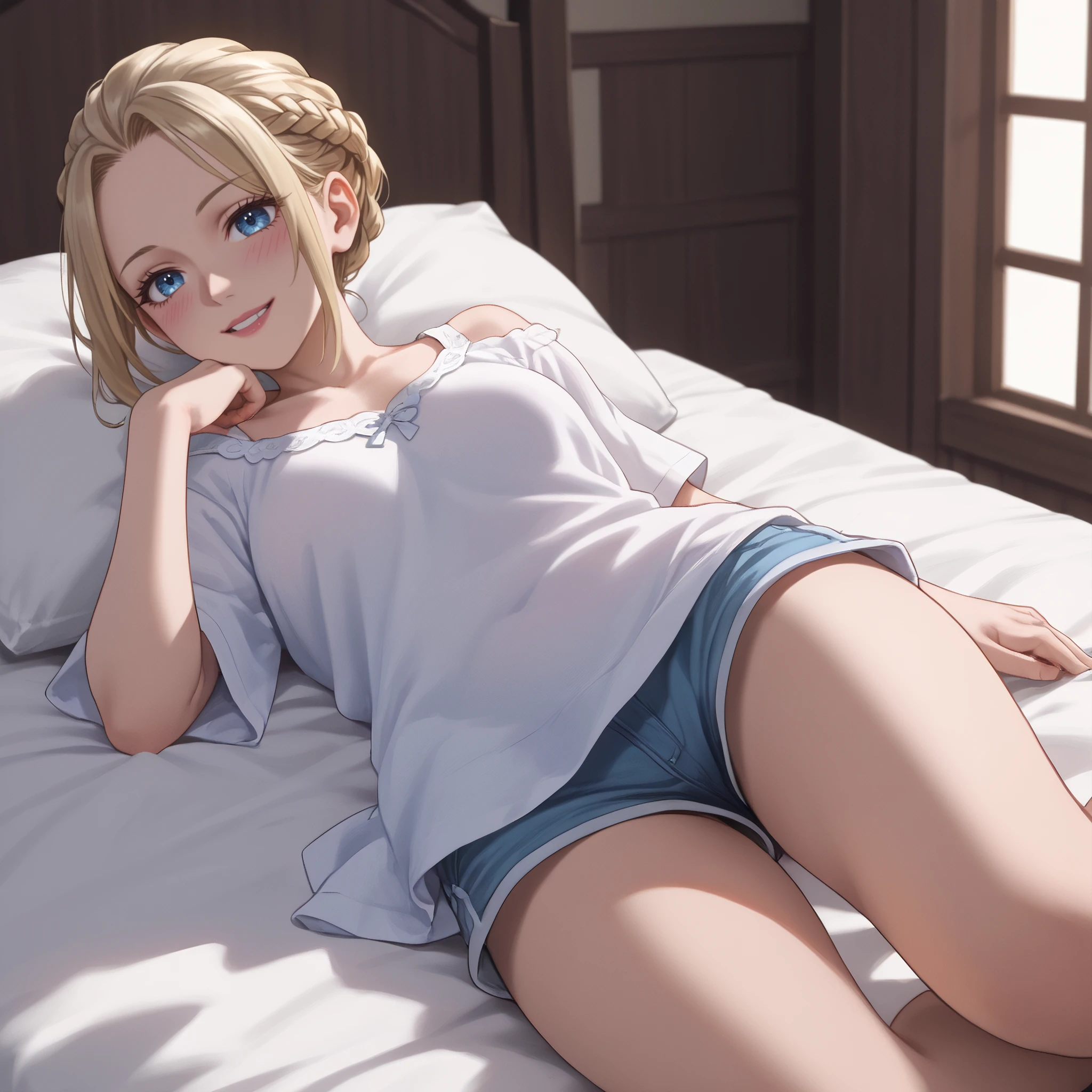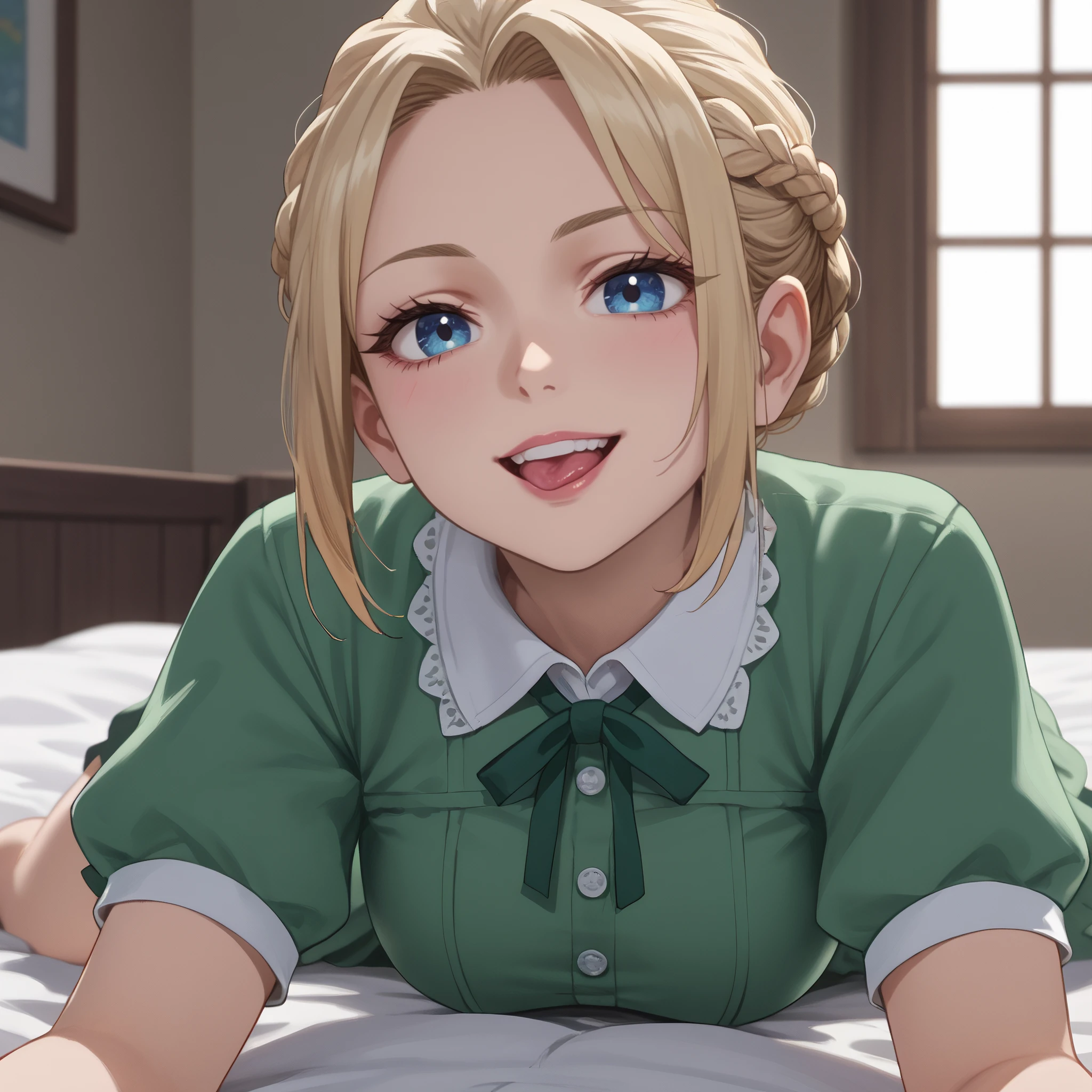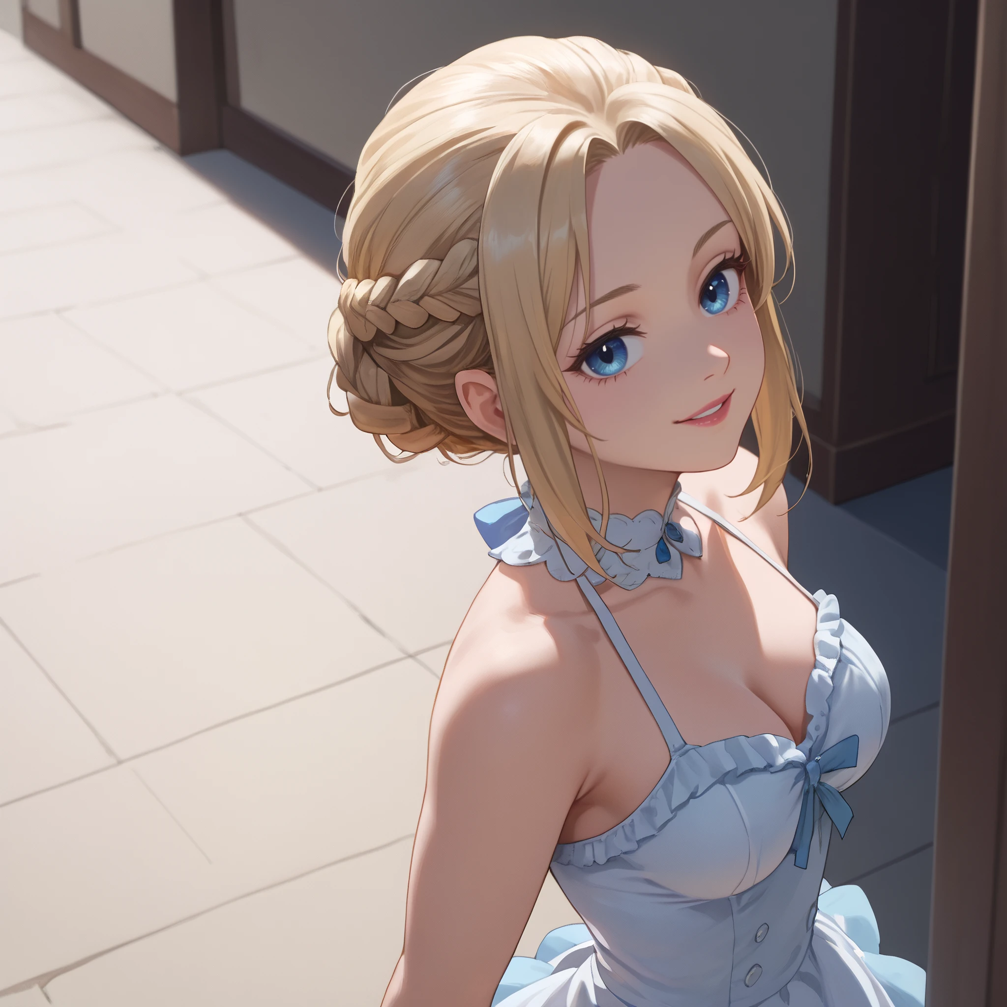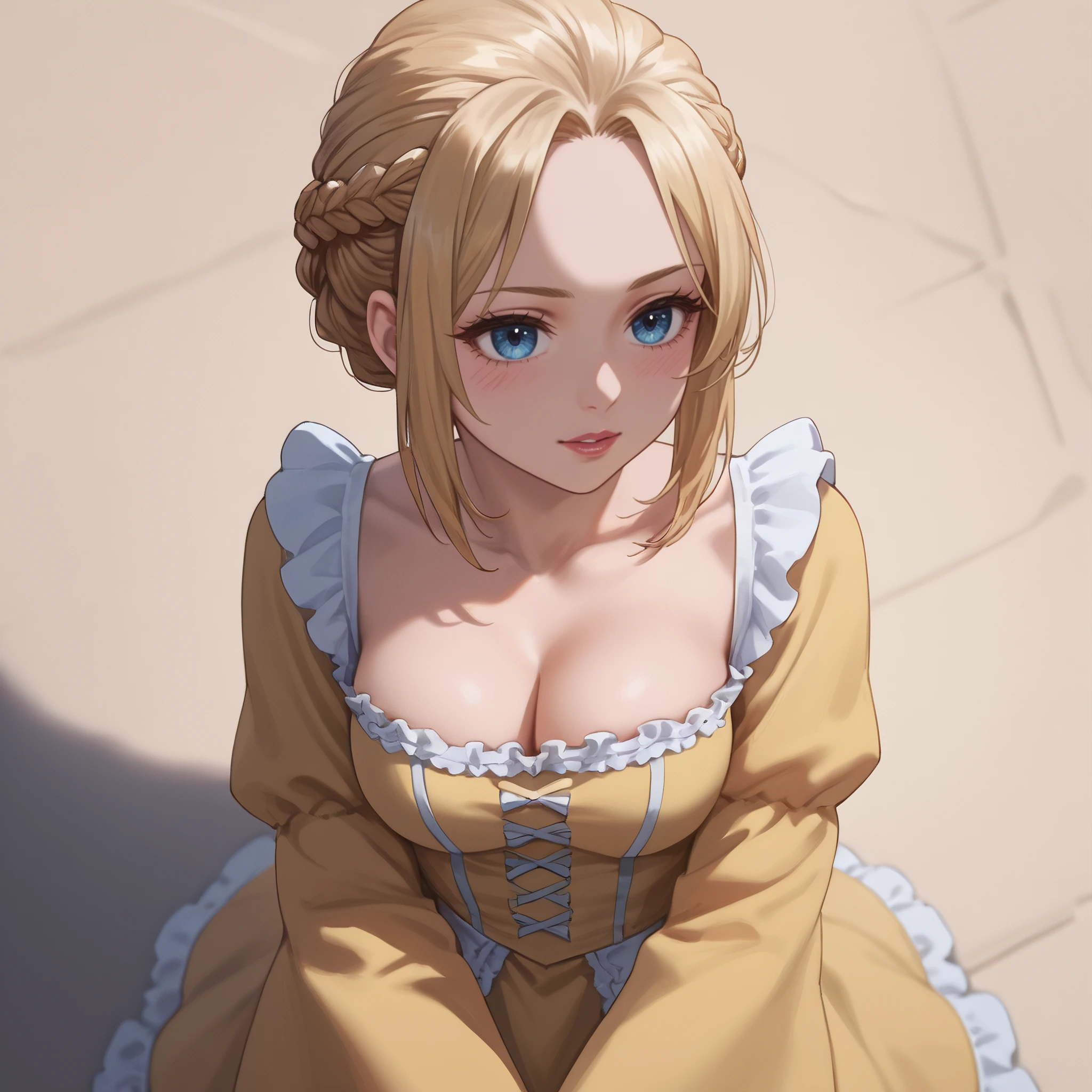 A4OCanaan, blonde hair, braid, short hair, blue eyes, french braid, sidelocks, hair bun, bangs,