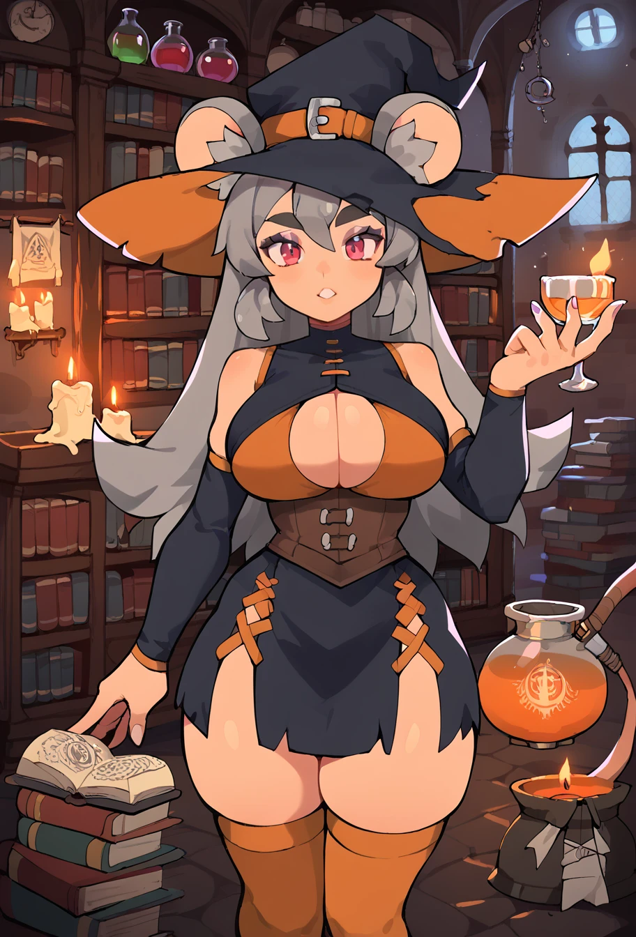 "witch hat, mouse_animal_ears, ears_through_headwear, cleavage_cutout, detached sleeves, skirt, skindentation, thighhighs" for her outfit,
