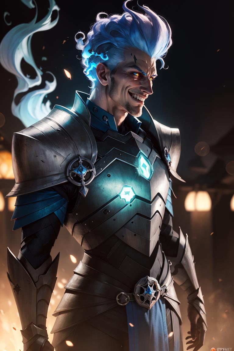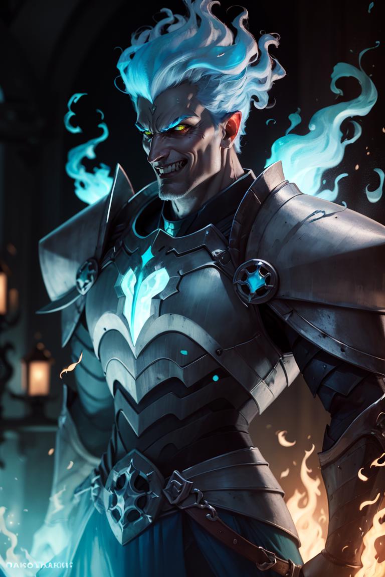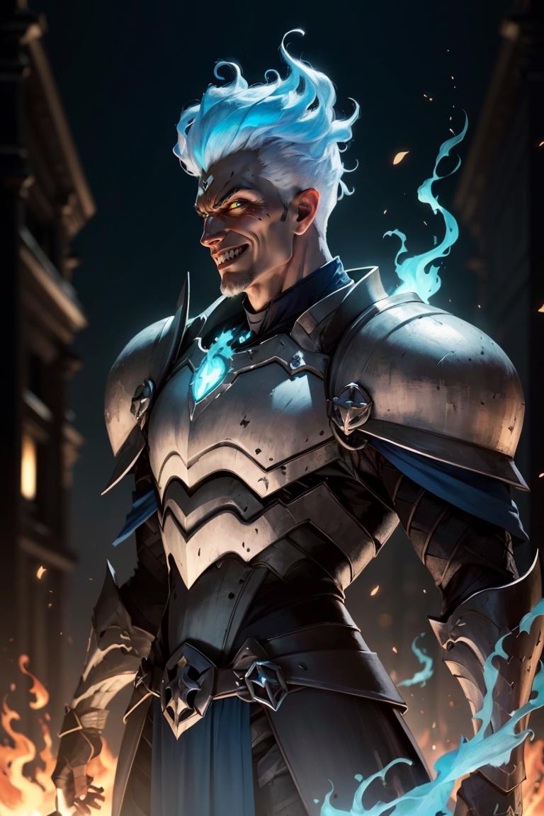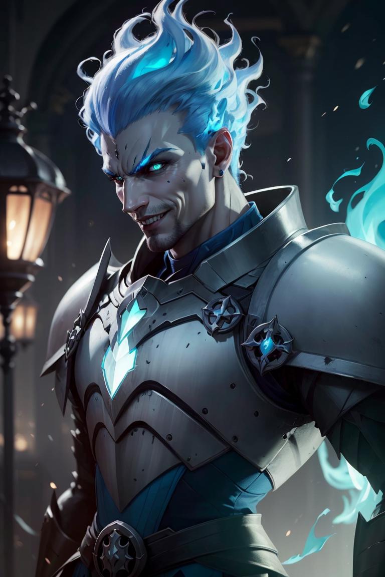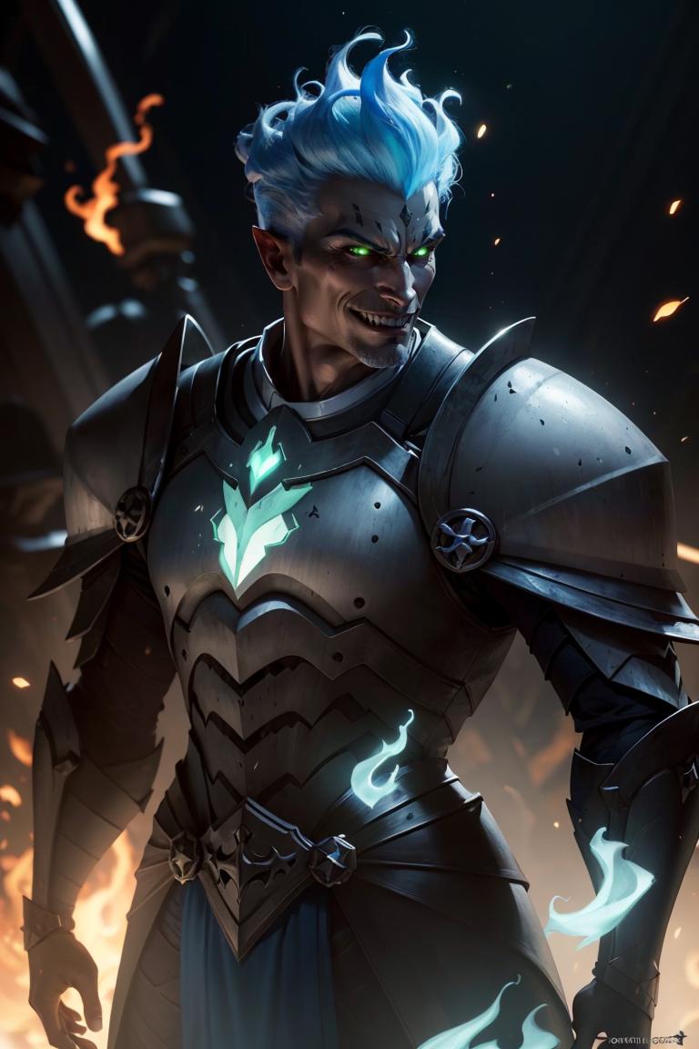 Grezhul_AFK, solo, grey skin, 1boy, evil grin, from the side, fiery hair, blue fire, cowboy shot, breastplate, armor,