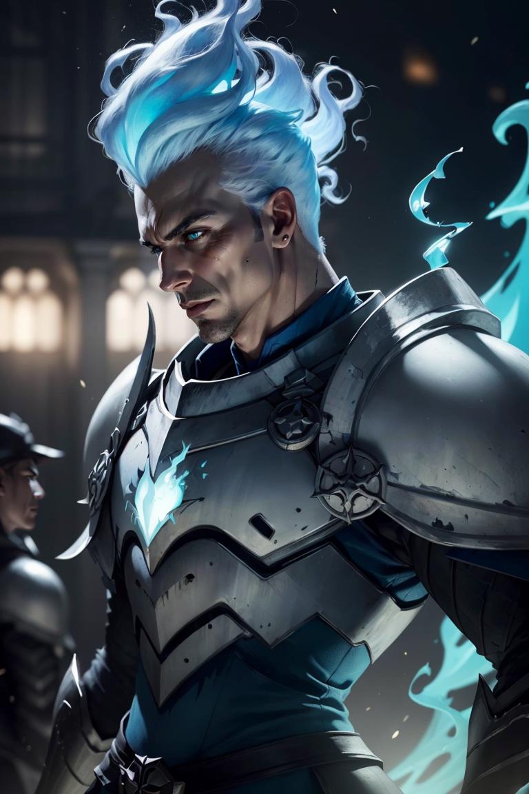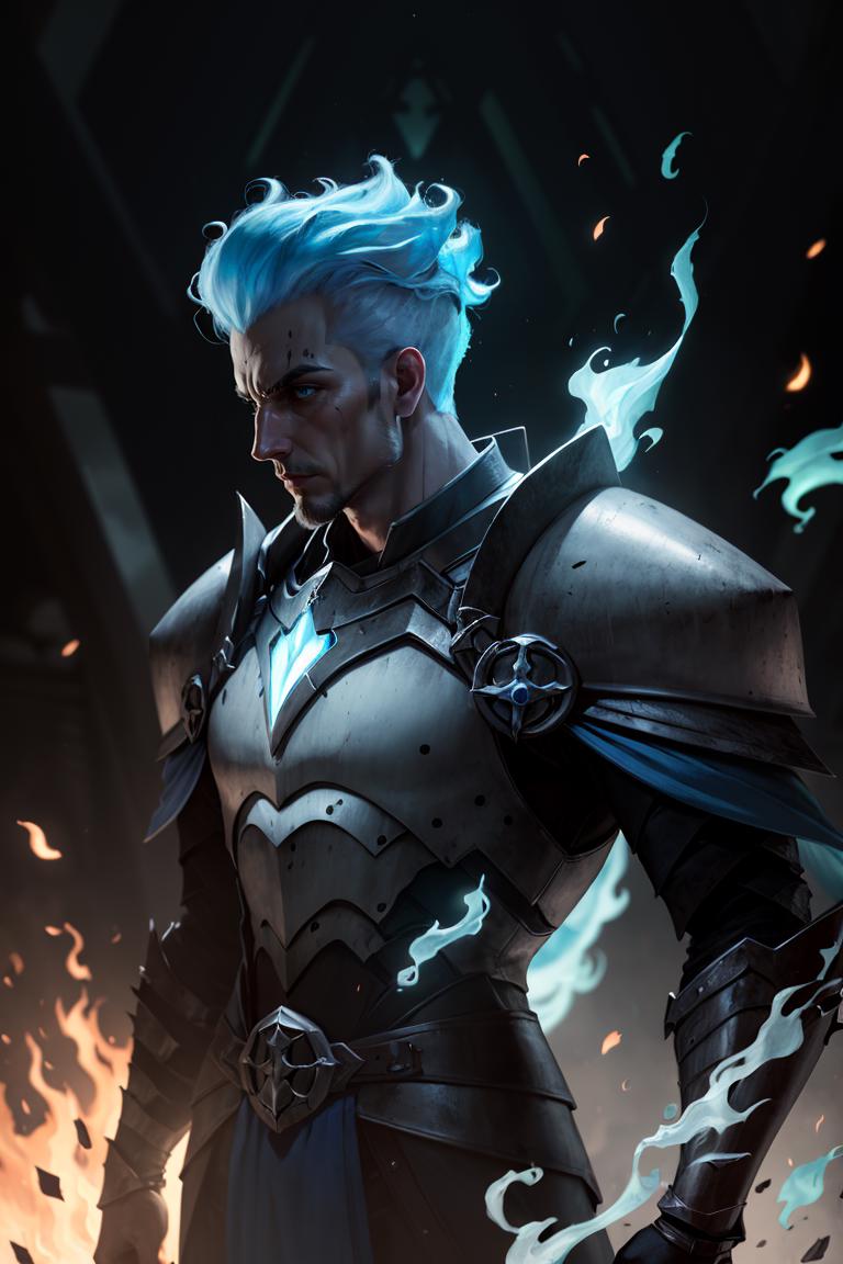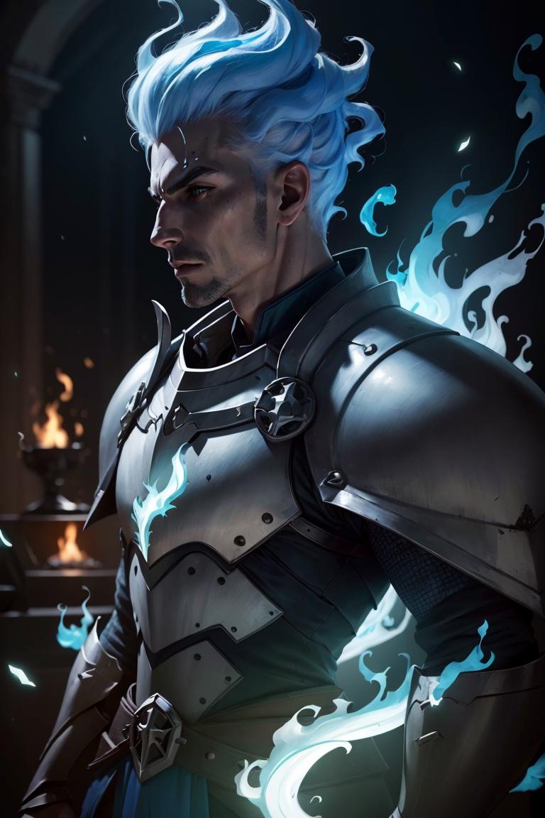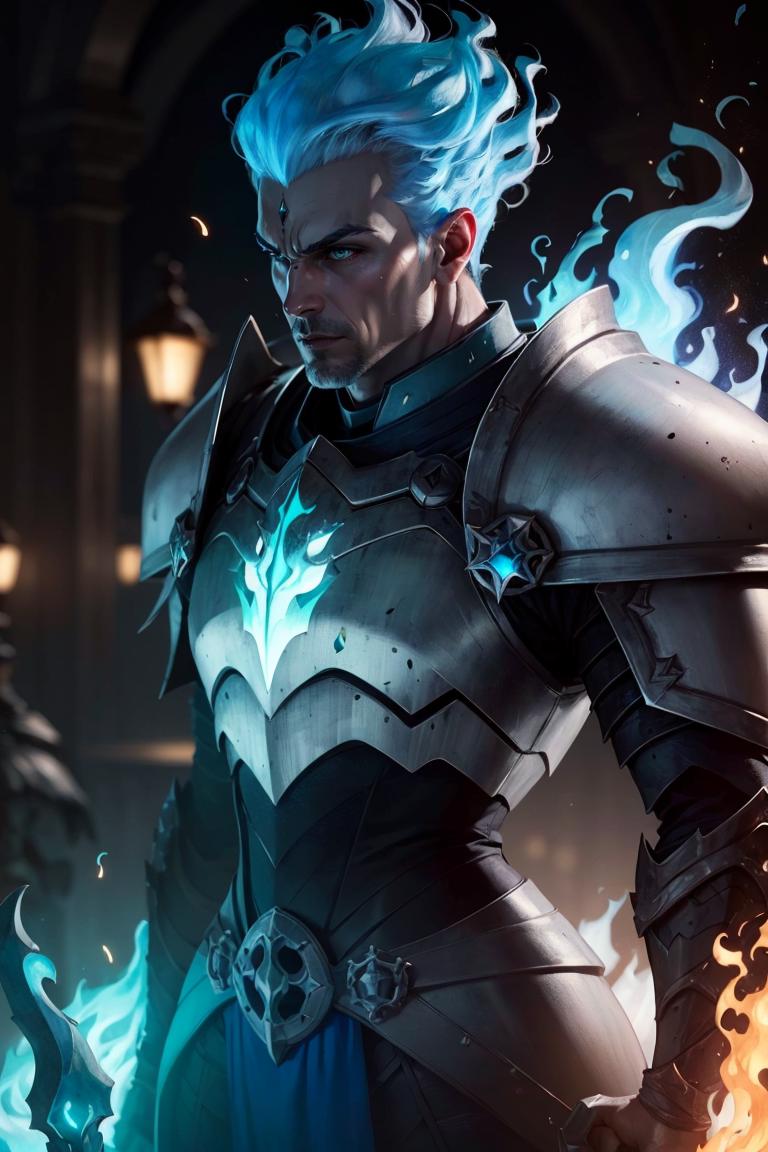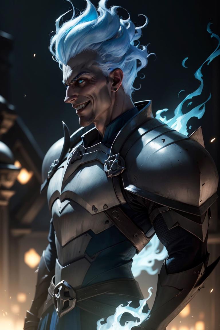Grezhul_AFK, solo, grey skin, 1boy, evil grin, from the side, fiery hair, blue fire, cowboy shot, breastplate, armor,
