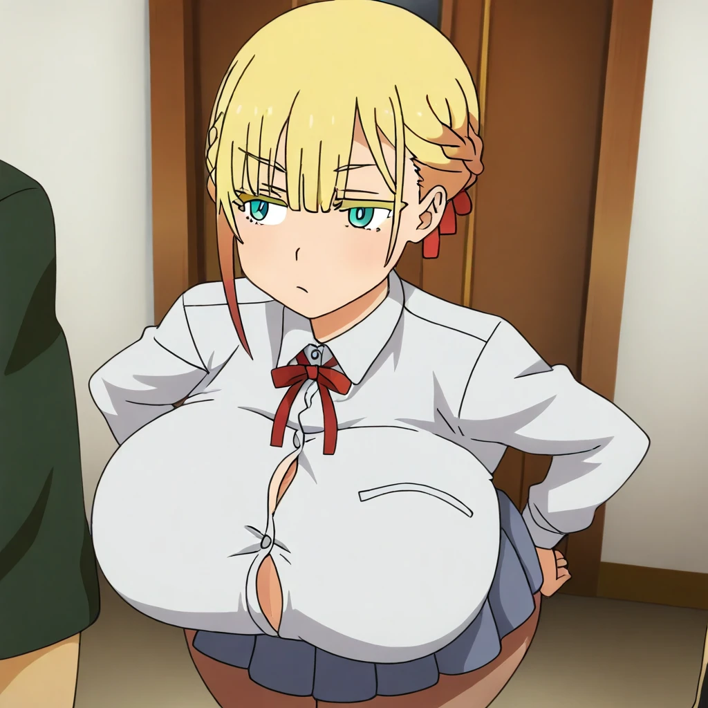 Alice, aqua eyes, blonde hair, french braid, yellow eyelashes, , white collared shirt, red neck ribbon, button gap, miniskirt, grey pleated skirt, pantyhose