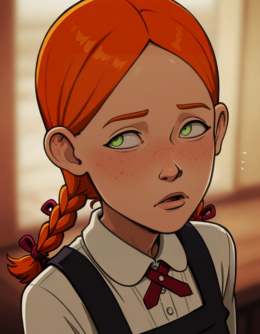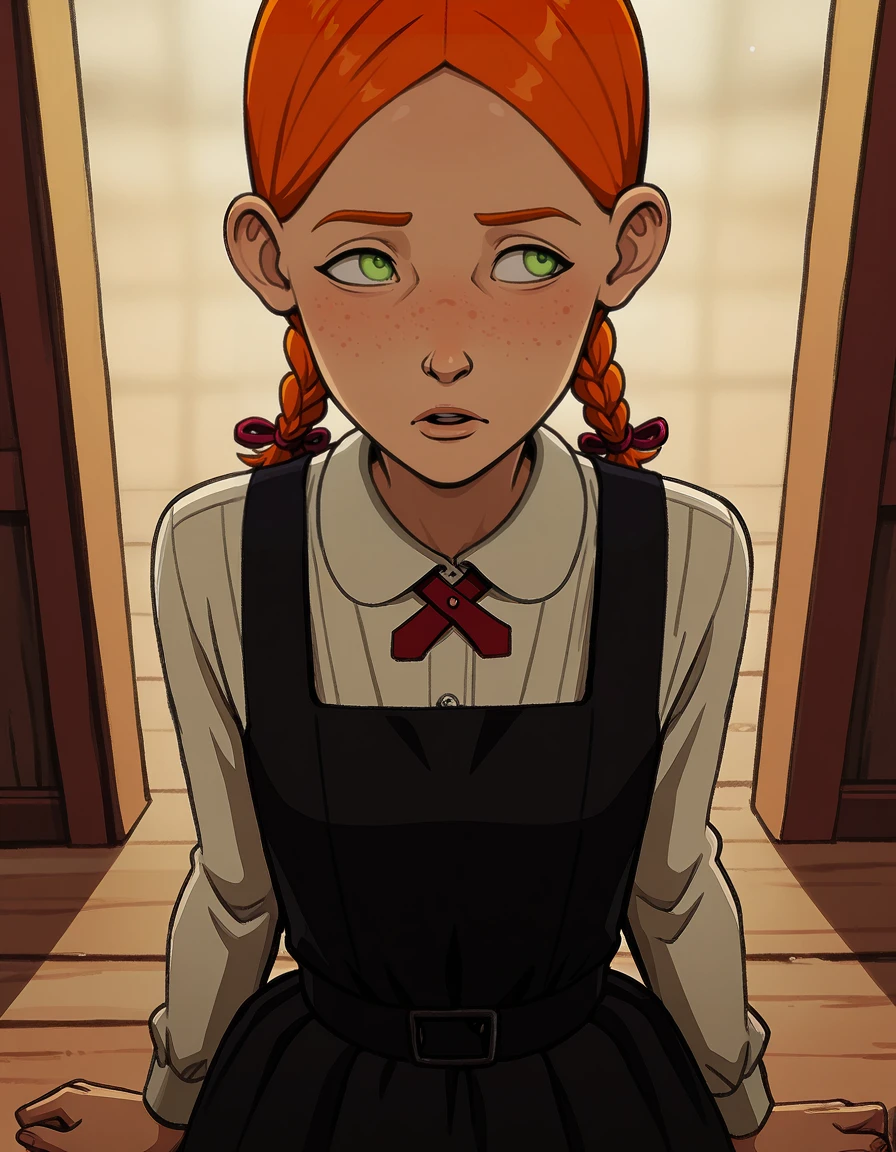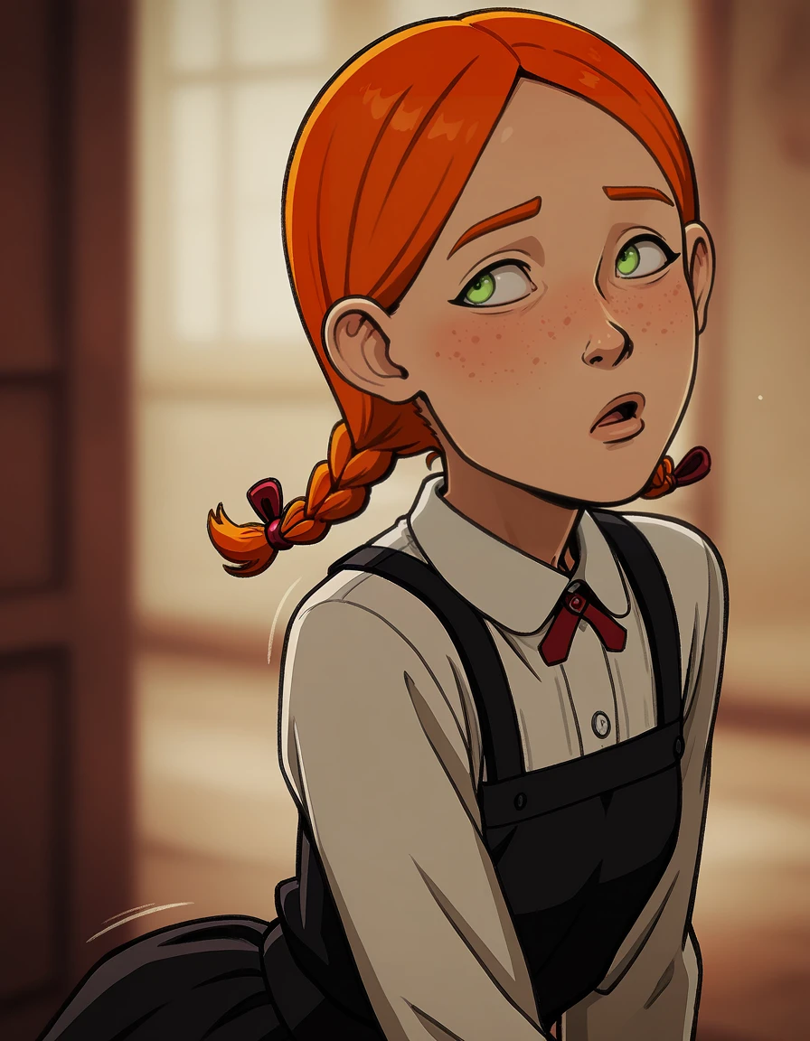 ponpujennybennett,1girl,green eyes, freckles,twin braids,orange hair,jewelry,ribbon,shirt,pinafore skirt,solo