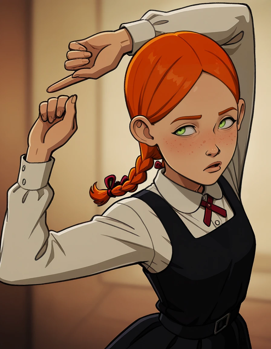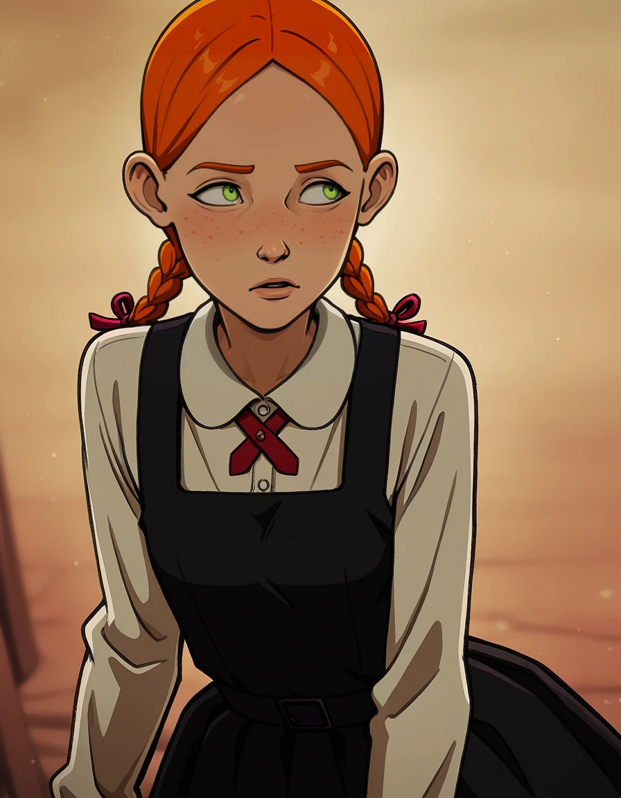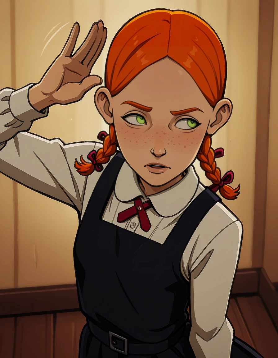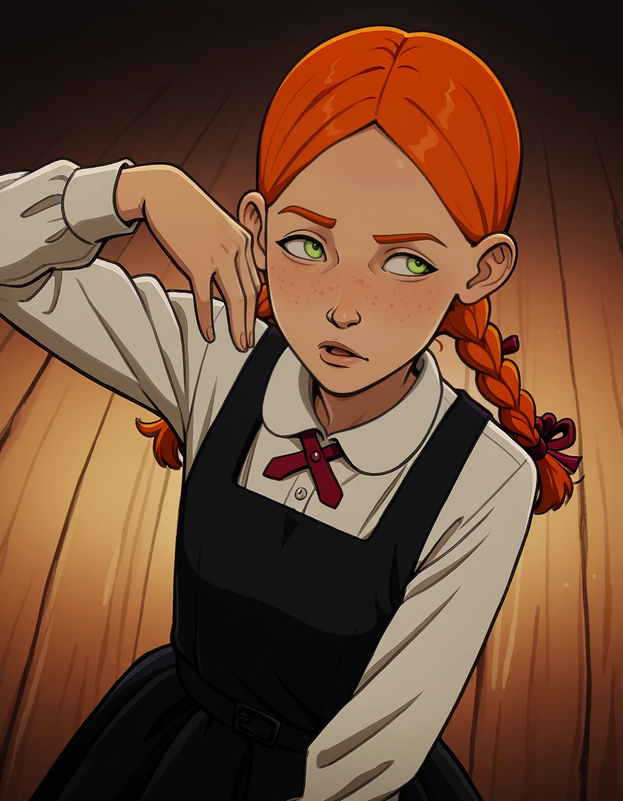ponpujennybennett,1girl,green eyes, freckles,twin braids,orange hair,jewelry,ribbon,shirt,pinafore skirt,solo