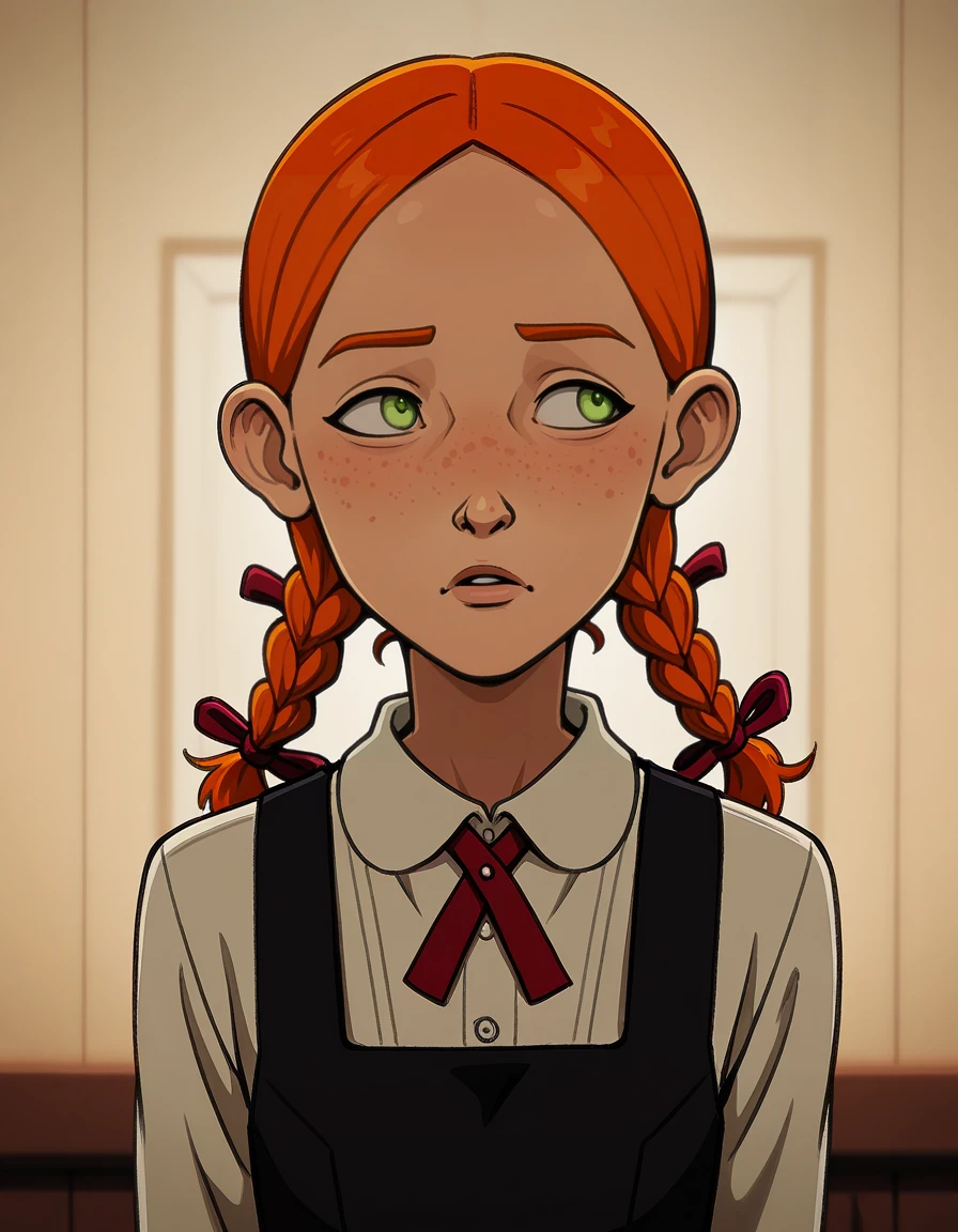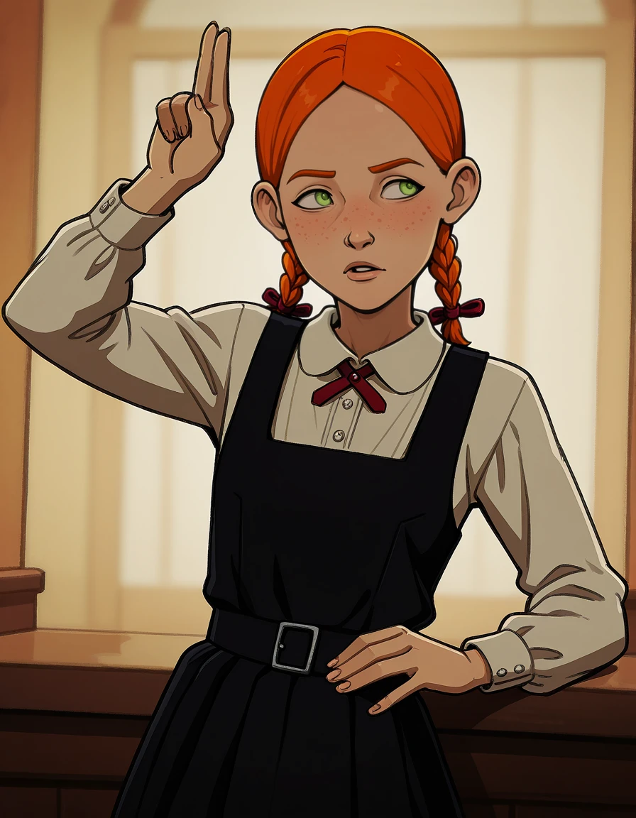 -ponpujennybennett,1girl,green eyes, freckles,twin braids,orange hair,jewelry,ribbon,shirt,pinafore skirt,solo