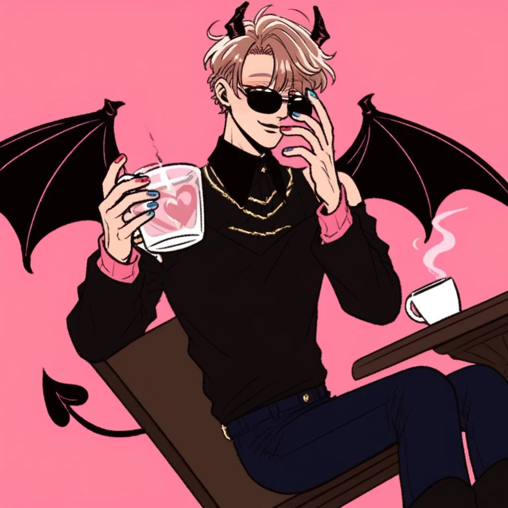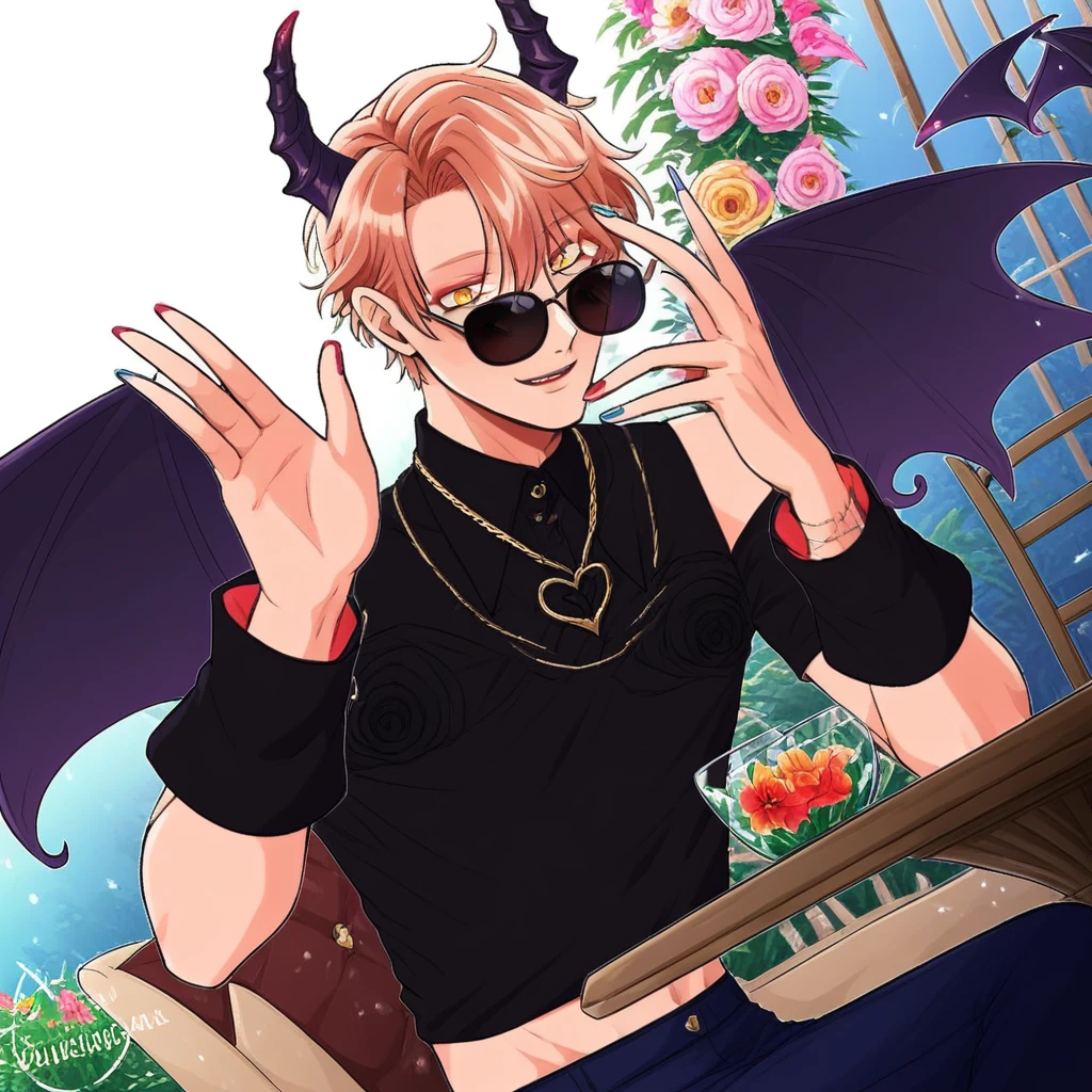 nail polish, blonde hair, Strawberry Blond hair, light orange with a yellow gradient, Demon horns,Demon wings