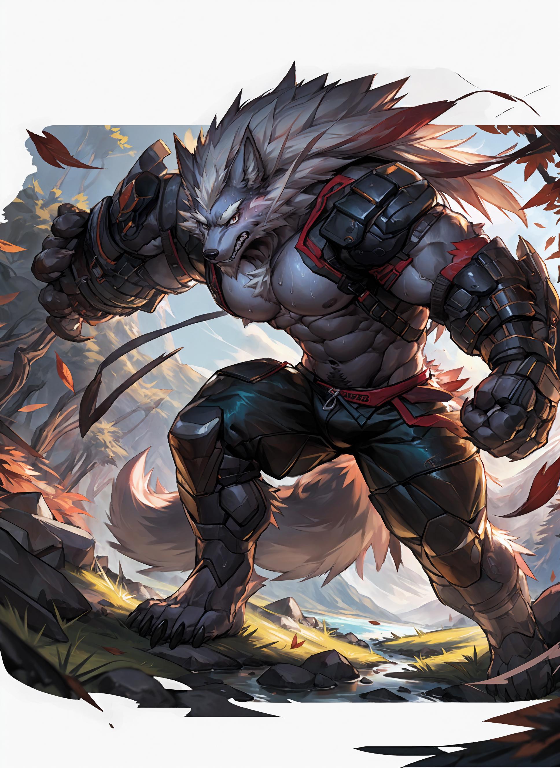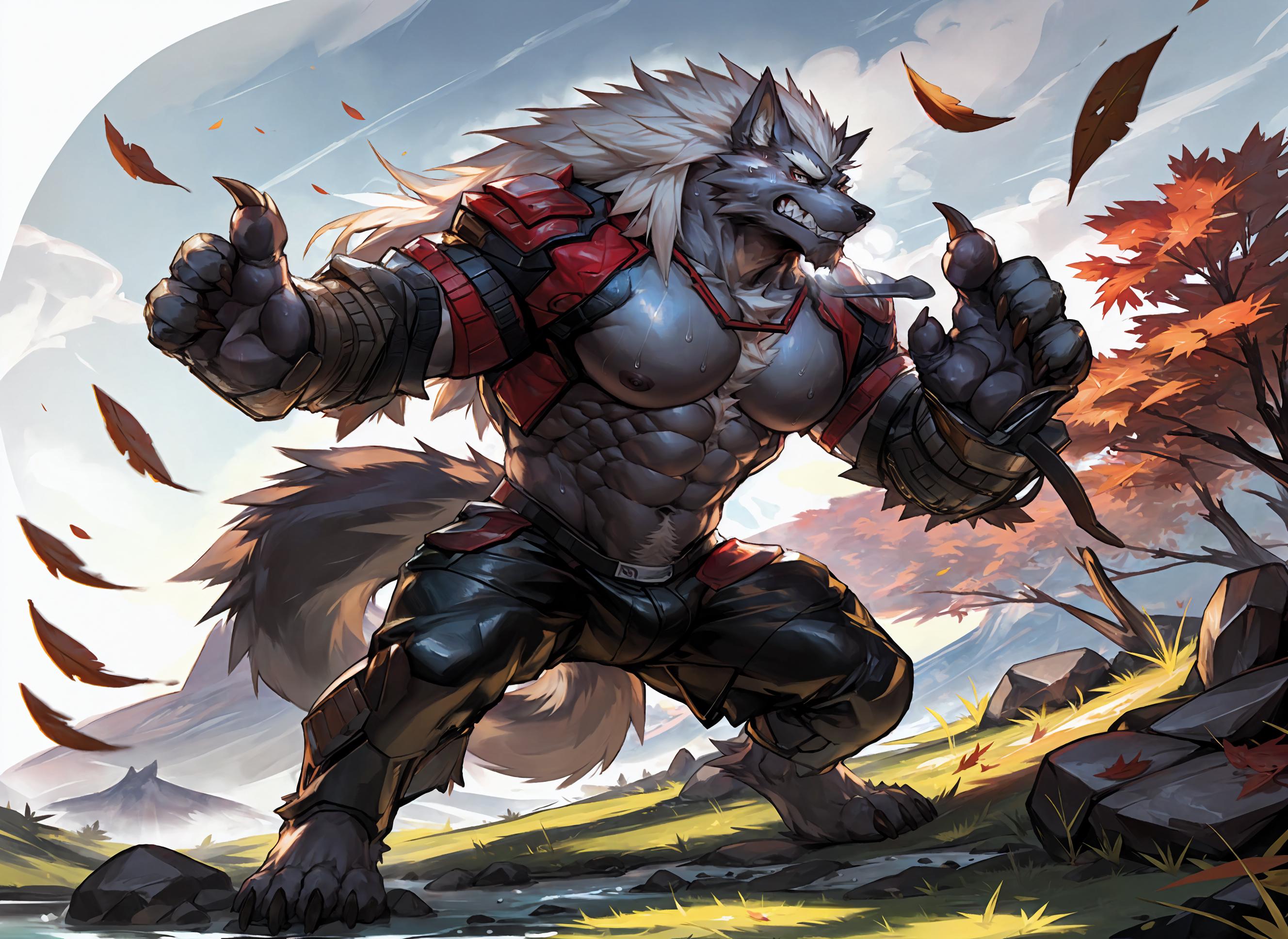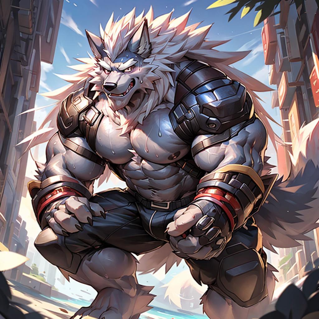 (langshu:1.3),wolf boy,facial hair,Thick eyebrows,grey body,wolf ears,white hair,long hair,wolf tail,claw,<lora:langshu_v2:0.6~0.8>,