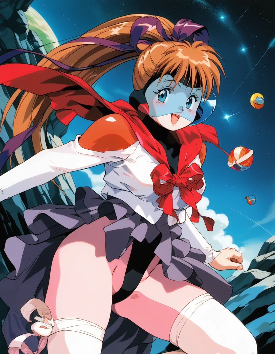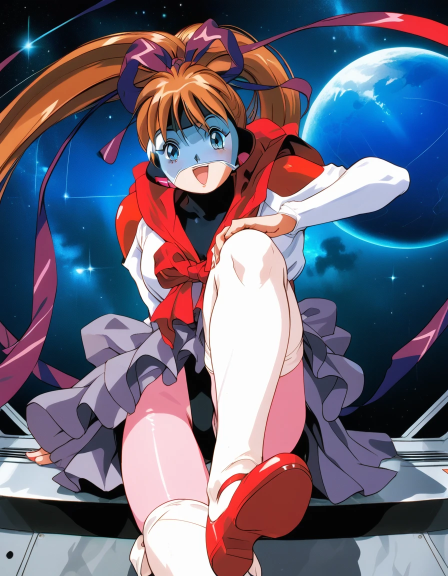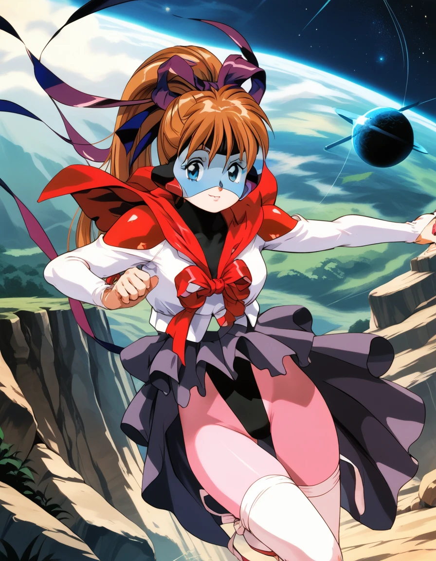 oozora mirai (moldiver), long hair, high ponytail, blue eyes, hair ribbon, brown hair,