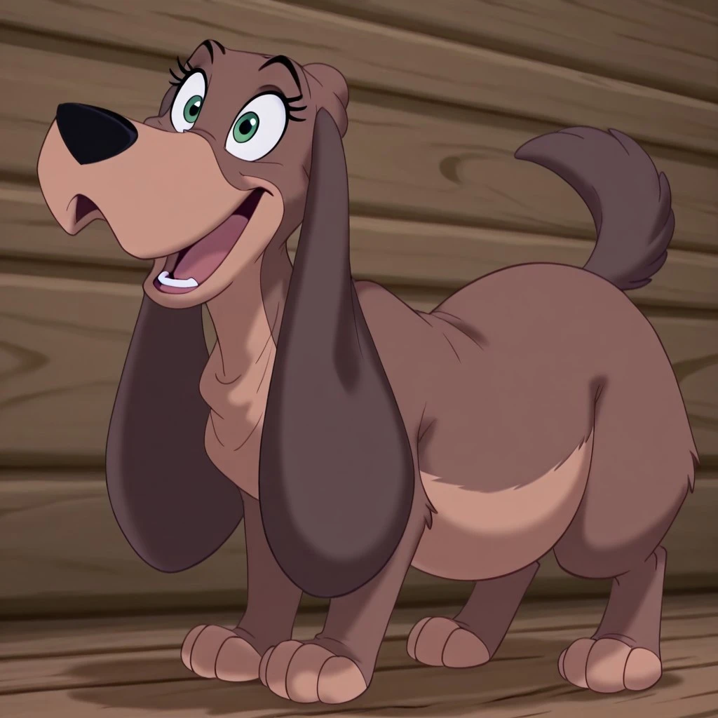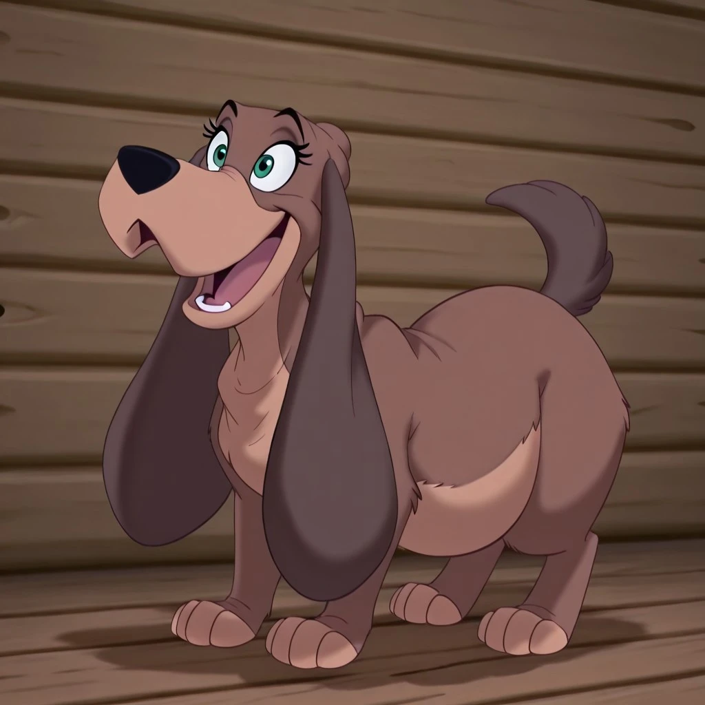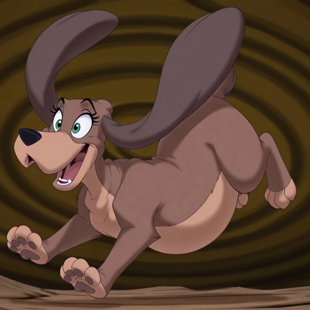 dipsy, female, dog, disney, cocker spaniel, brown fur, dark brown ears, dark brown tail, beige paws, beige belly, green eyes
