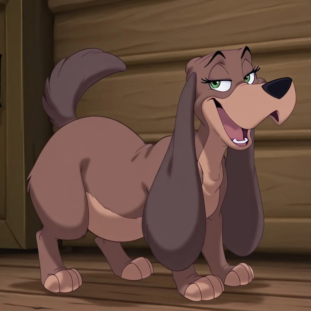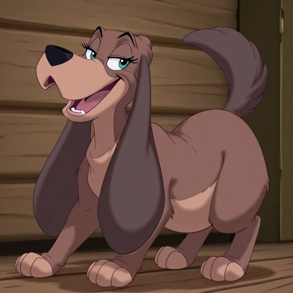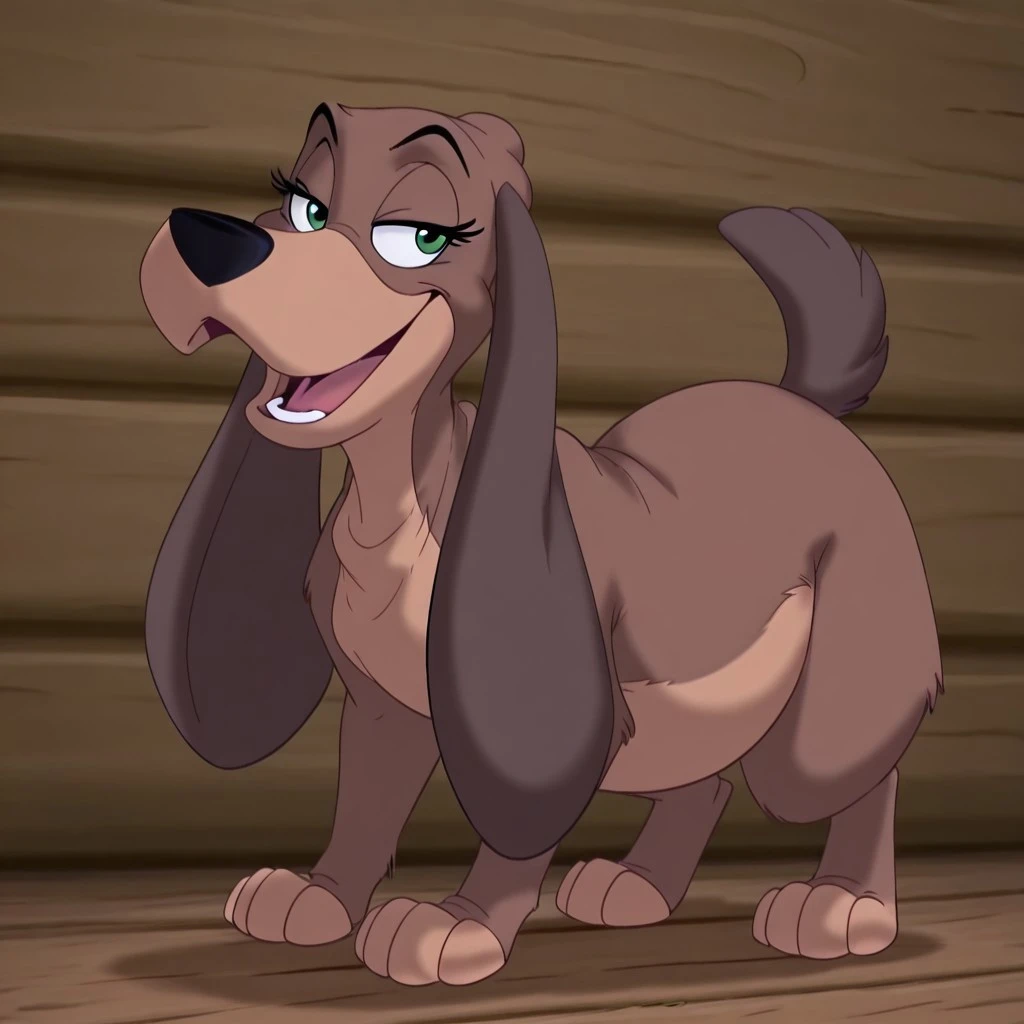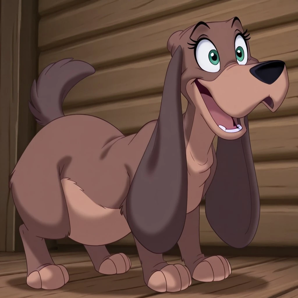 dipsy, female, dog, disney, cocker spaniel, brown fur, dark brown ears, dark brown tail, beige paws, beige belly, green eyes
