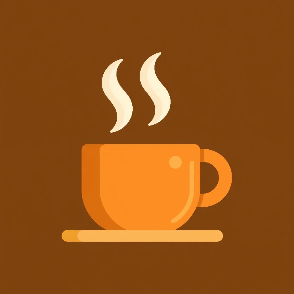 "An illustration of an icon of a bright, orange steaming cup of coffee on a deep brown background. The cup’s bold color and the rising white steam create a warm, inviting look. The contrasting colors make the icon pop, giving it a cozy yet modern feel."