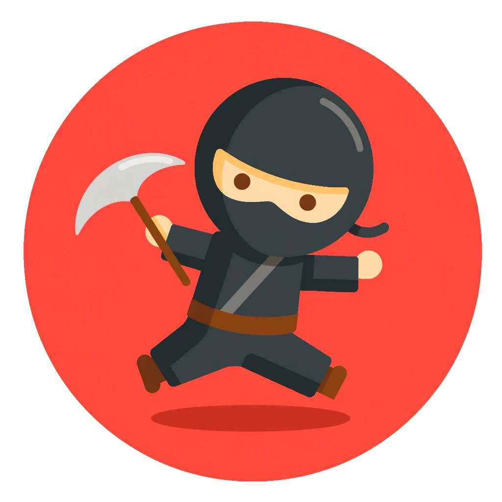 "An illustration of an icon of a tiny ninja wearing a black mask, jumping through the air, set against a bold red background. The ninja’s eyes are narrowed in concentration, and it holds a shiny silver-throwing star in one hand. The contrast between the black and red creates a dynamic, action-packed look."