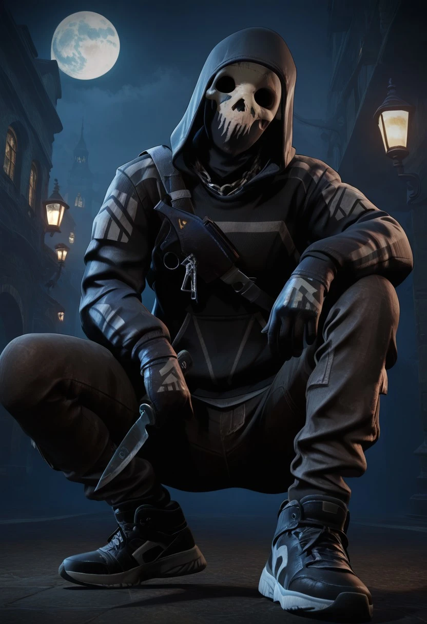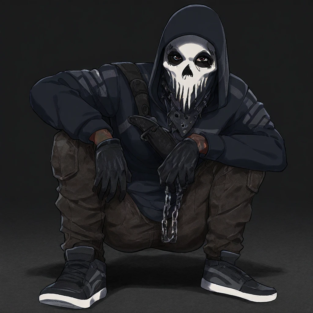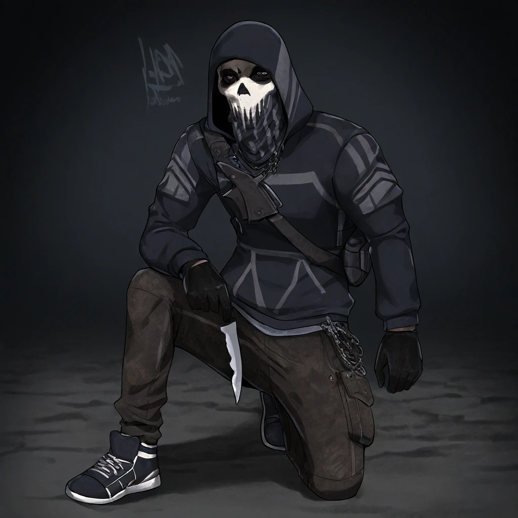 joey, skull mask, black hoodie with gray accent, hood up, black gloves, dark cargo pants, black sneakers, tactical backpack, chain hanging, shoulder straps, dark skin, black face paint around eyes,