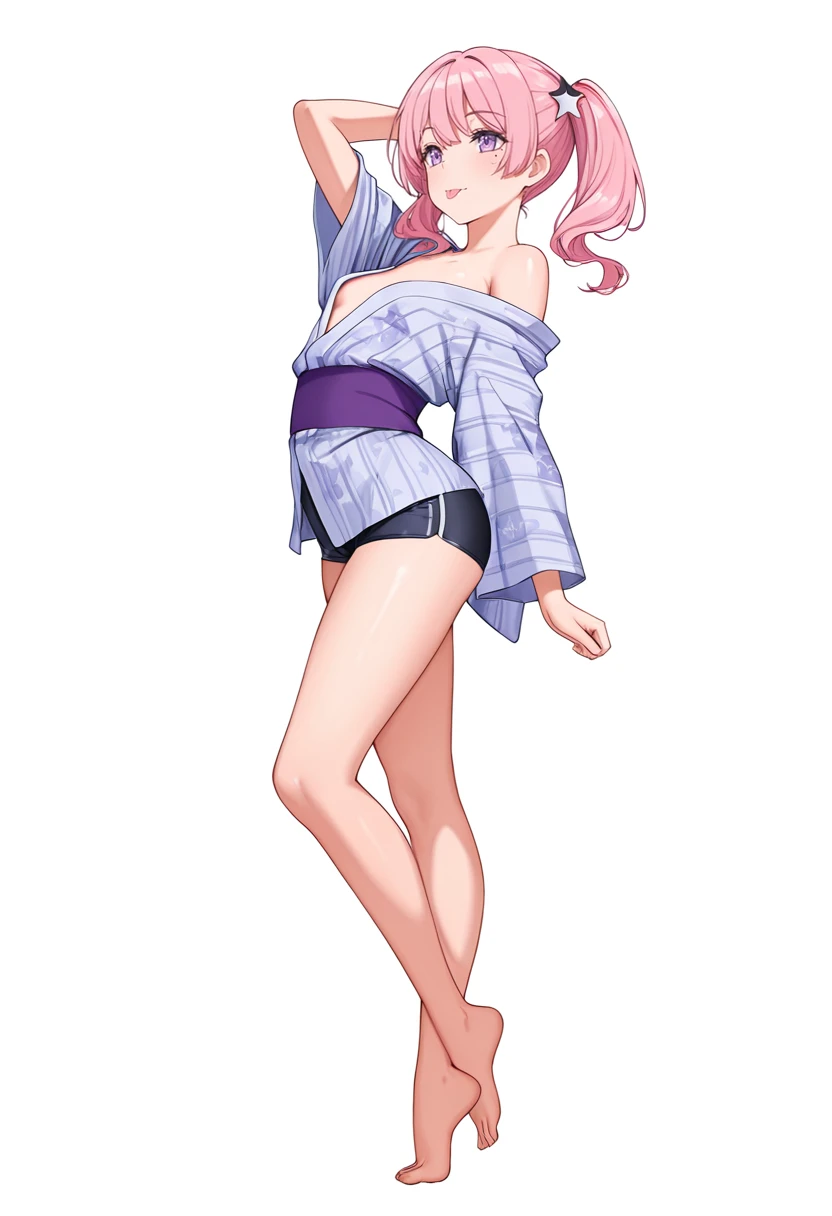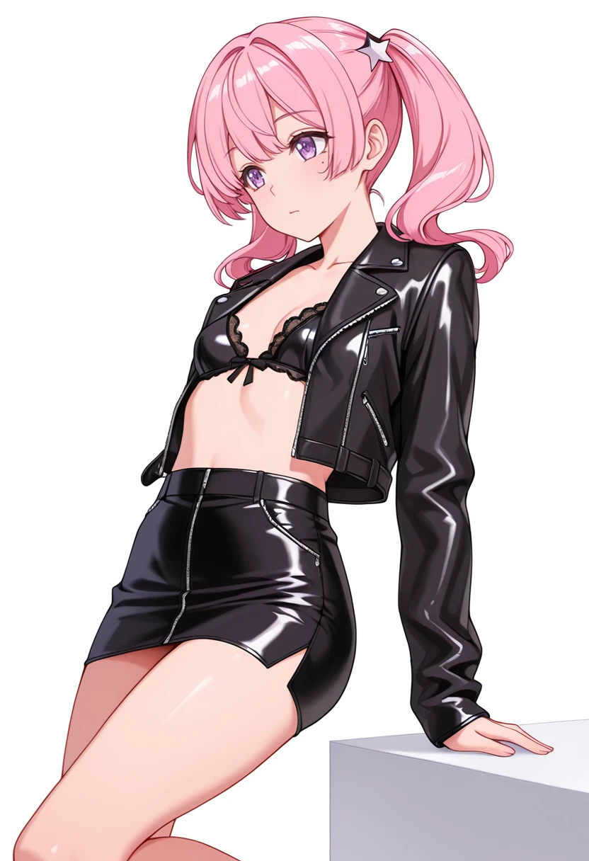 momo_cnr,pink hair, long hair, twintails, purple eyes, mole, mole under eye, small breasts, star hair ornament,