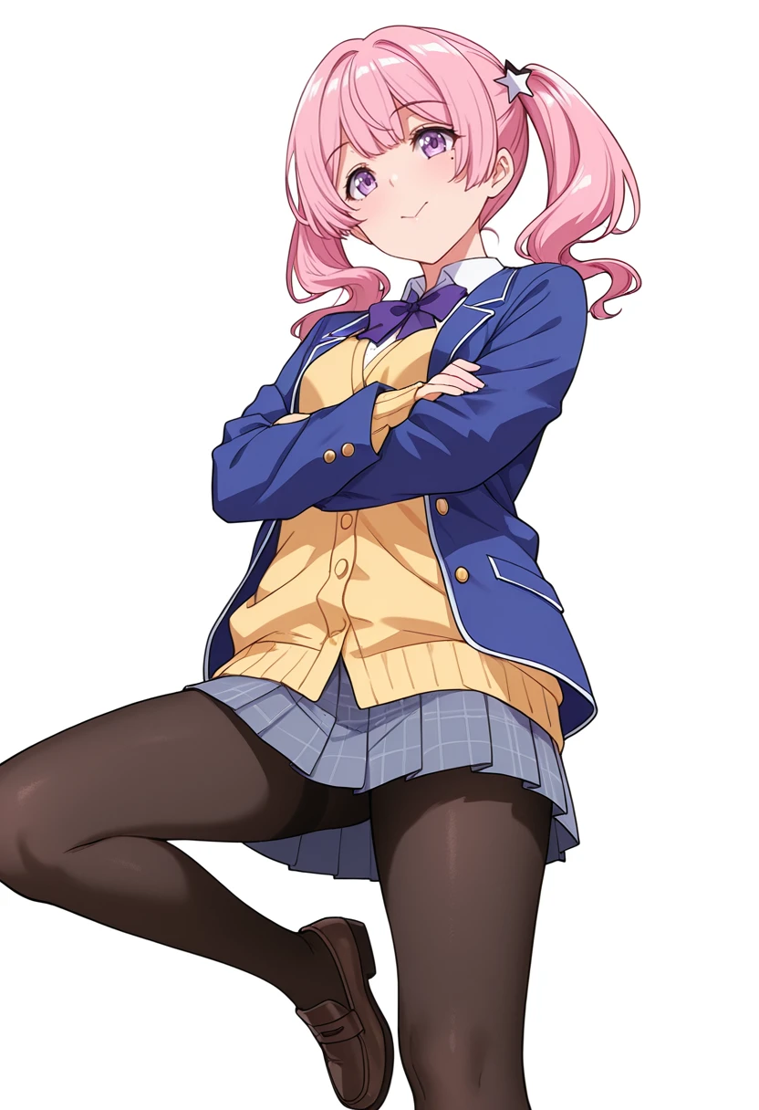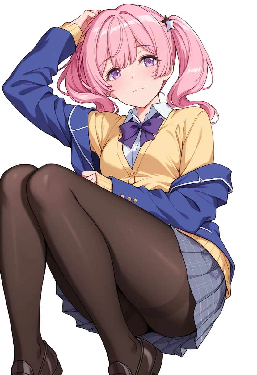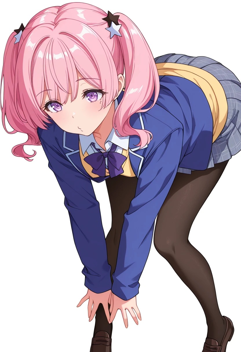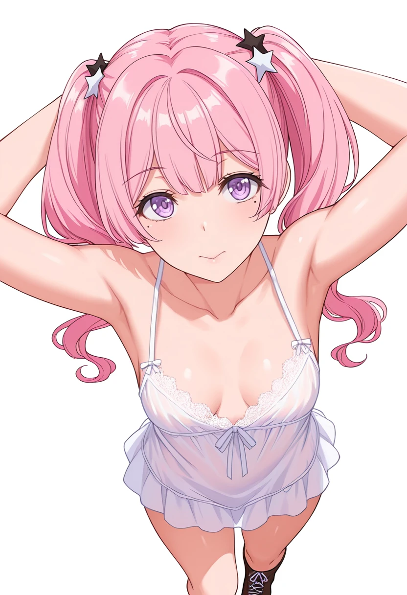 momo_cnr,pink hair, long hair, twintails, purple eyes, mole, mole under eye, small breasts, star hair ornament,Default outfit