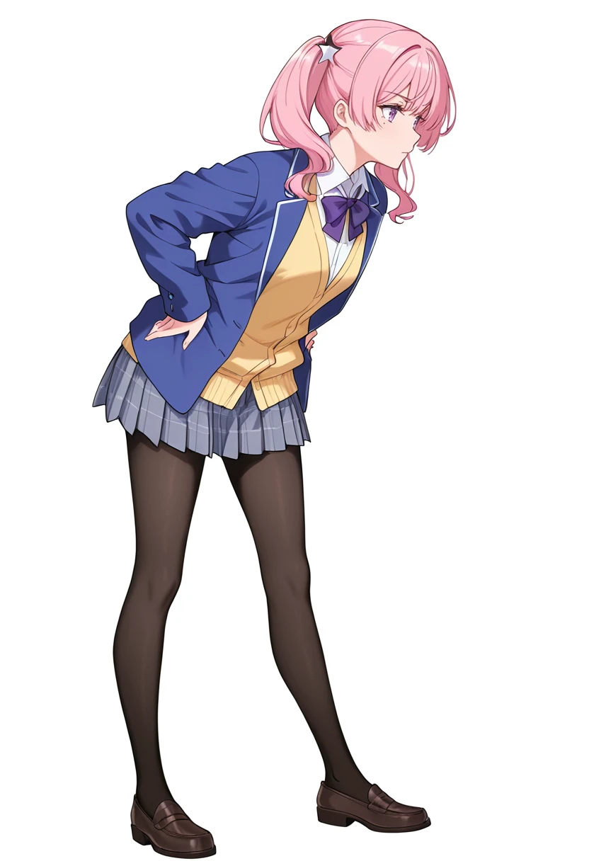 school uniform,white shirt, collared shirt, yellow cardigan,blue jacket,pleated skirt,black pantyhose, long sleeves,bowtie,loafers,Description