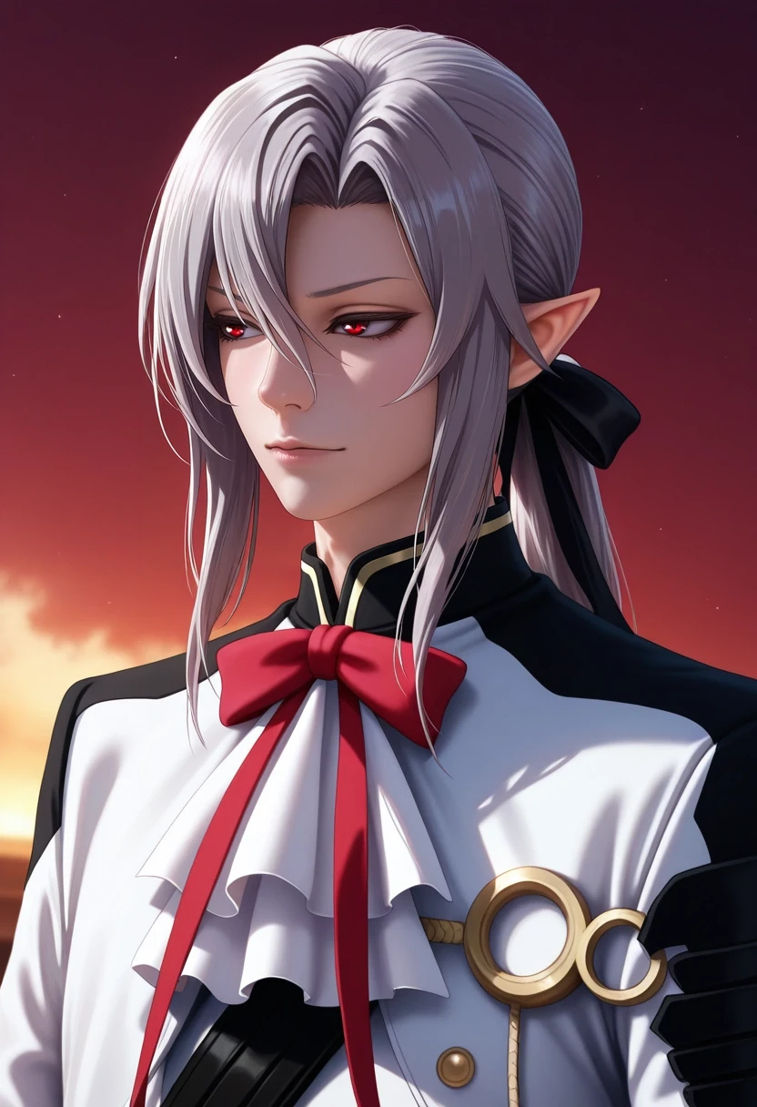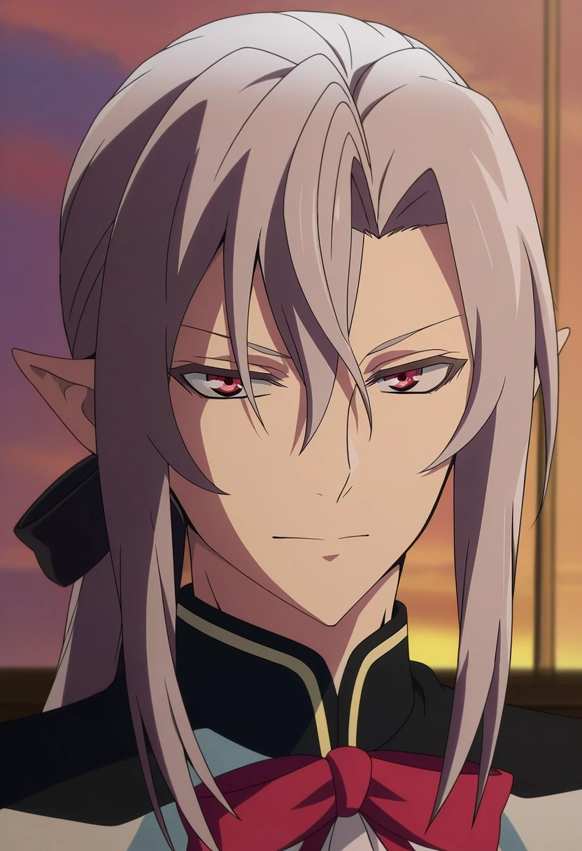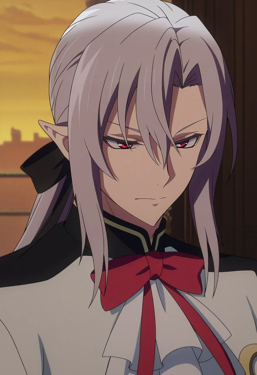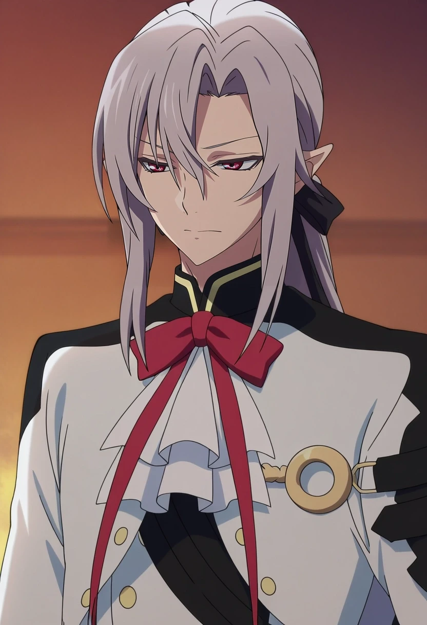 ferid_bathory, grey hair, red eyes, long hair, hair between eyes, pointy ears, ponytail