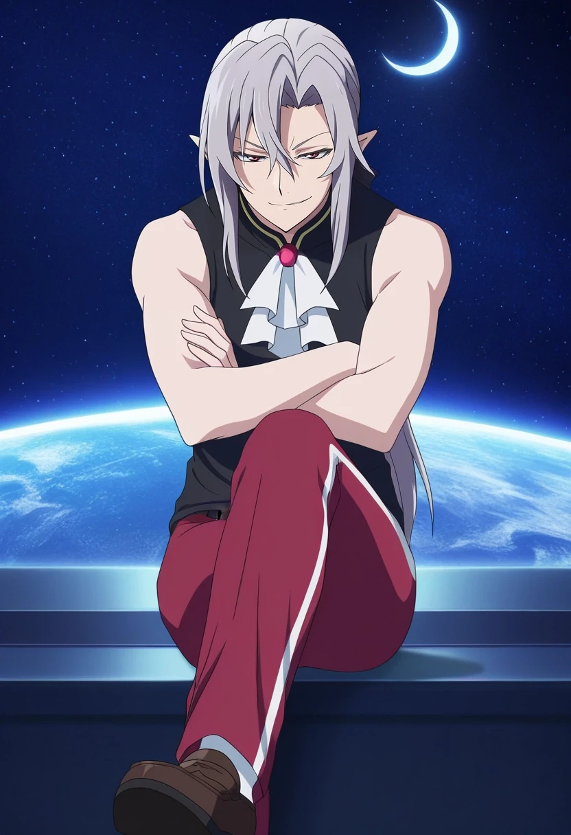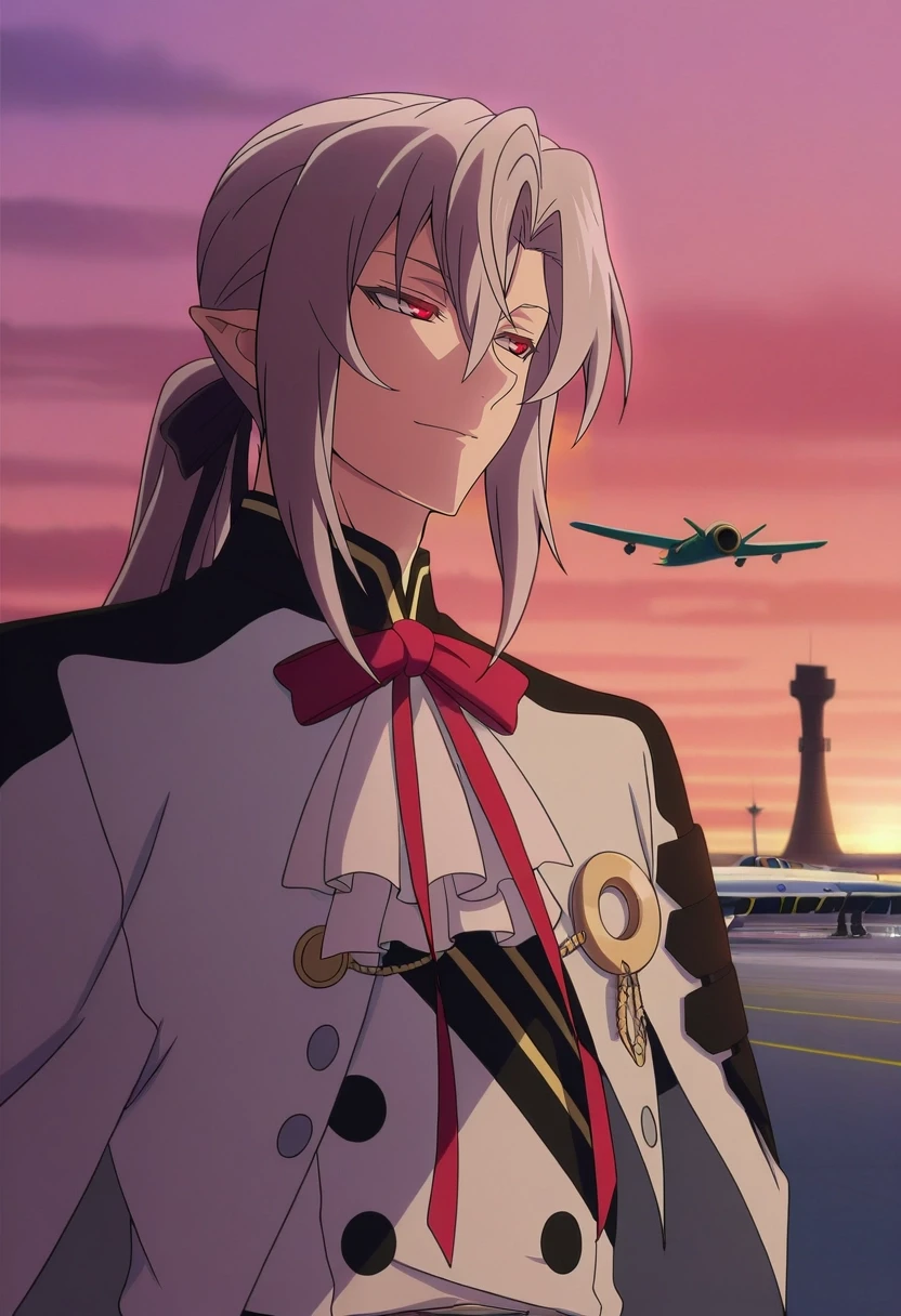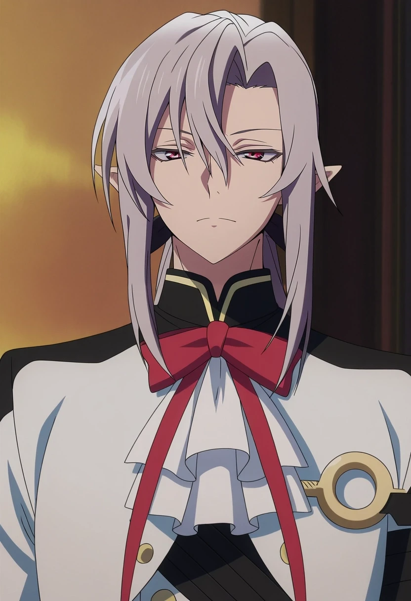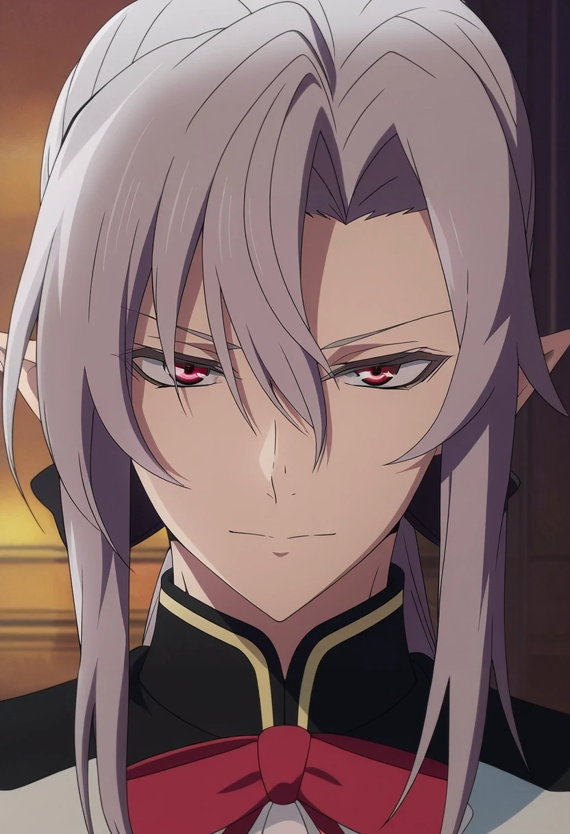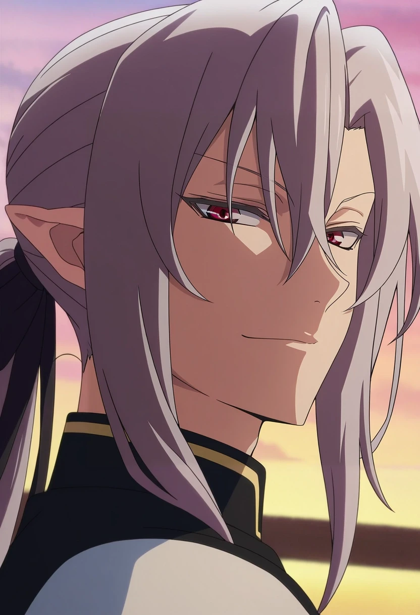 ferid_bathory, grey hair, red eyes, long hair, hair between eyes, pointy ears, ponytail