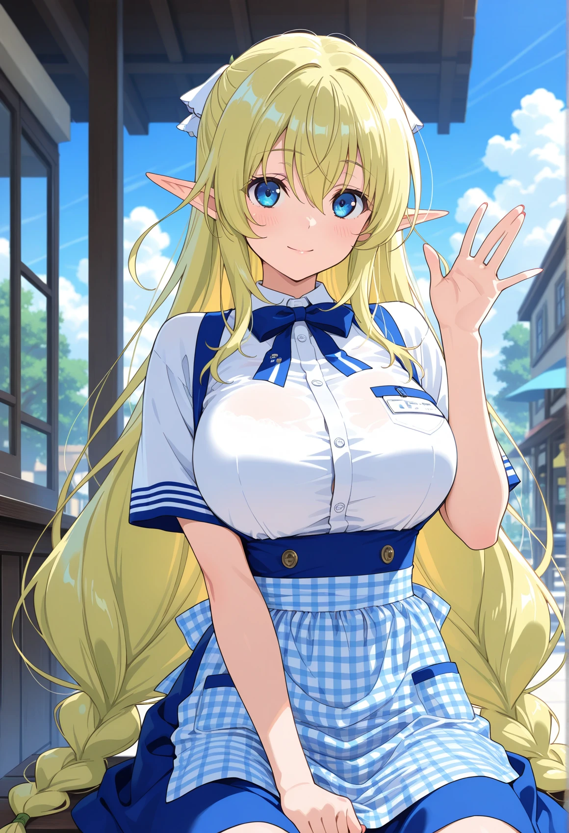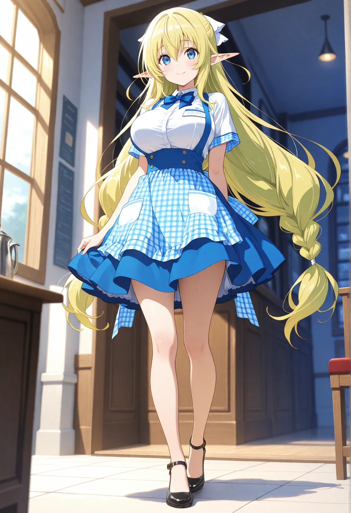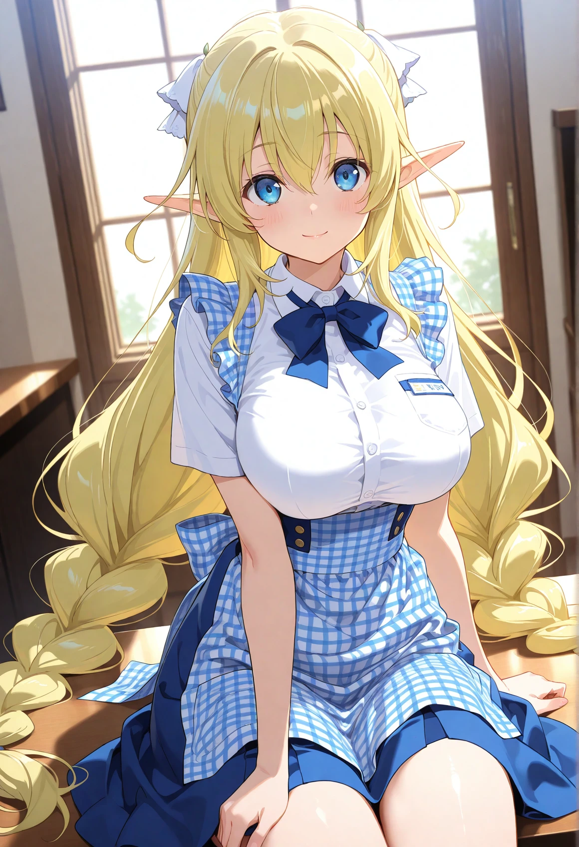 lyrule_il_v3,twin braids,very long hair,blonde hair,braid,pointy ears,large breasts,elf,blue eyes,hair between eyes,bangs,clothes: