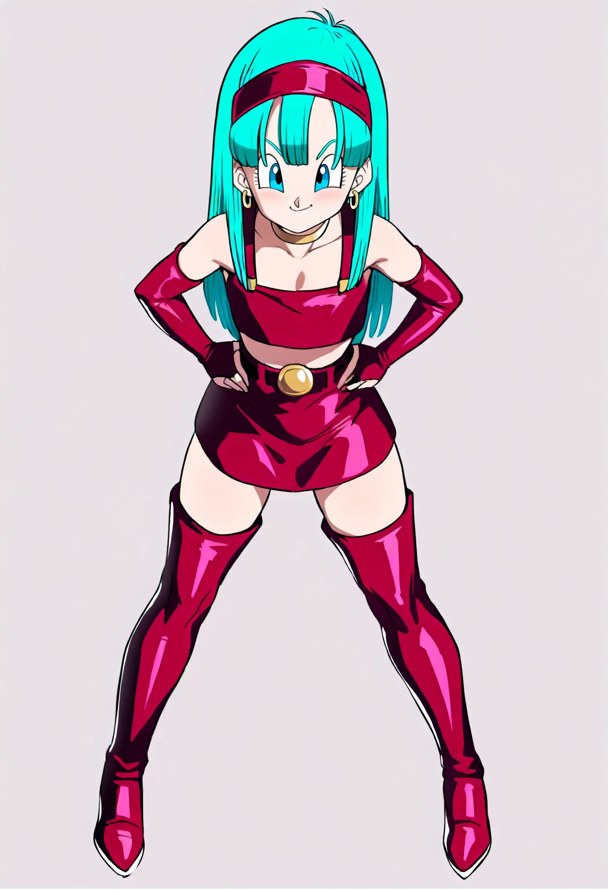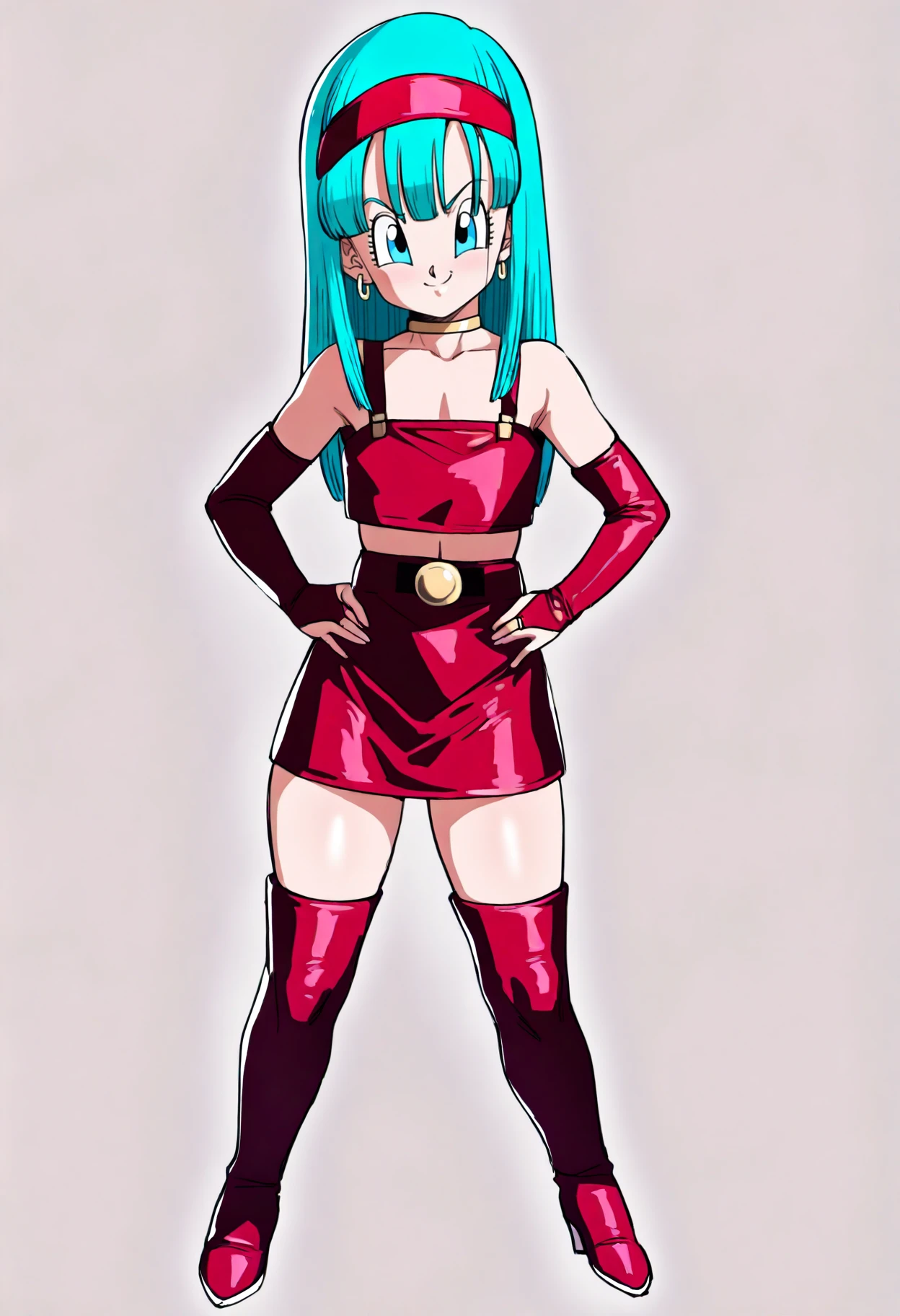 Outfit prompts : choker, crop top, earrings, red bridal gauntlets, red elbow gloves, midriff, red skirt, red thigh boots