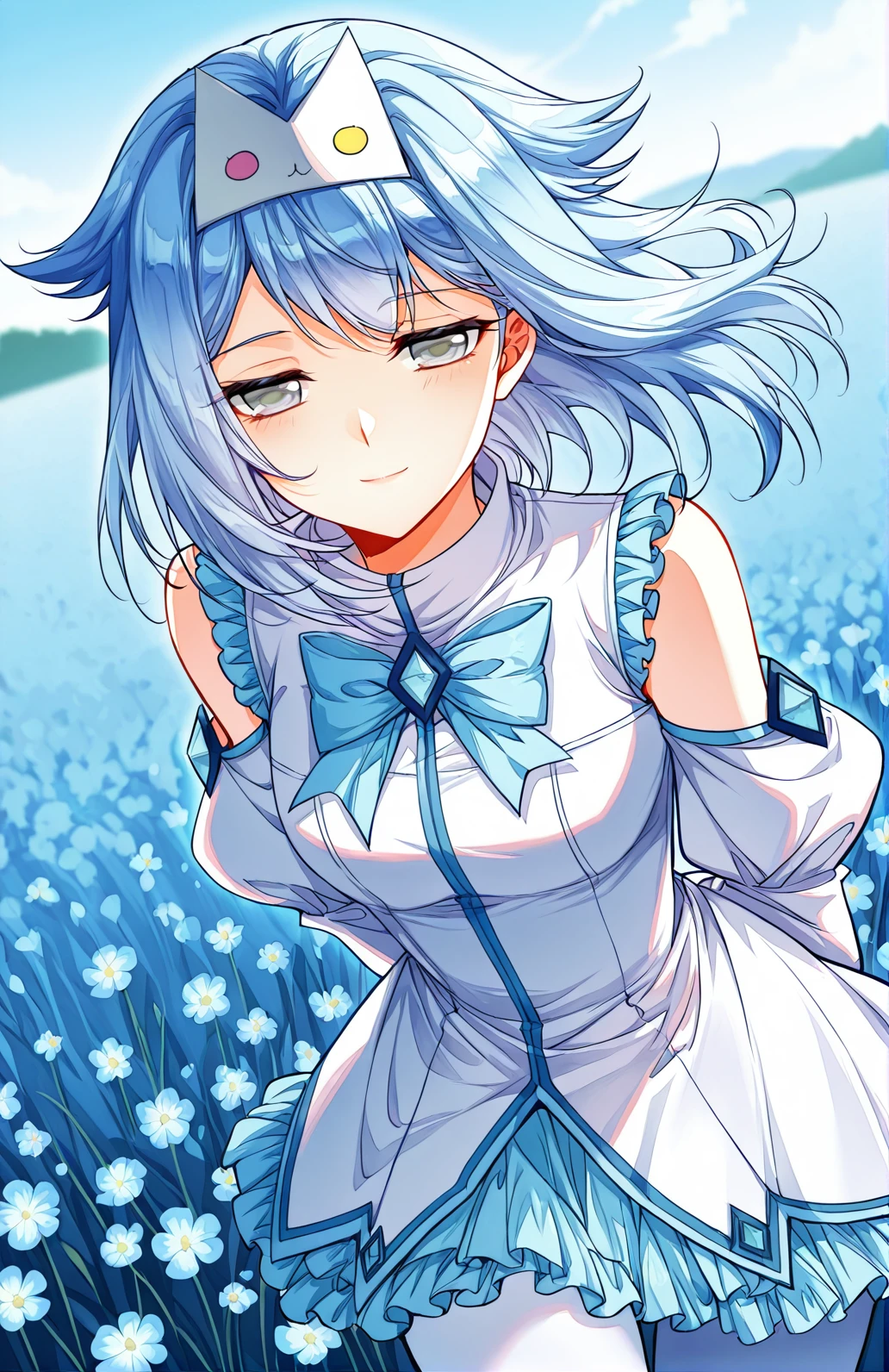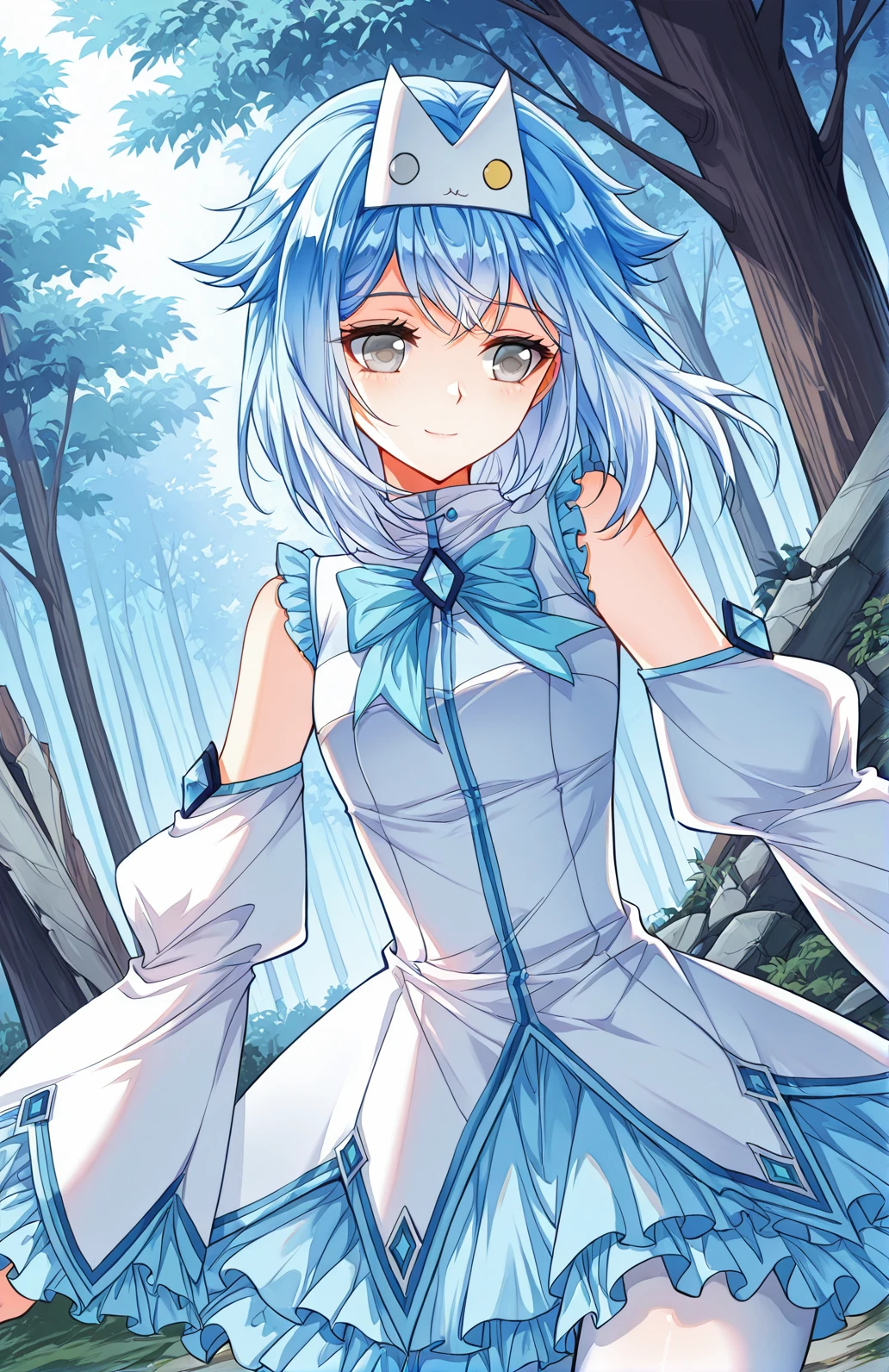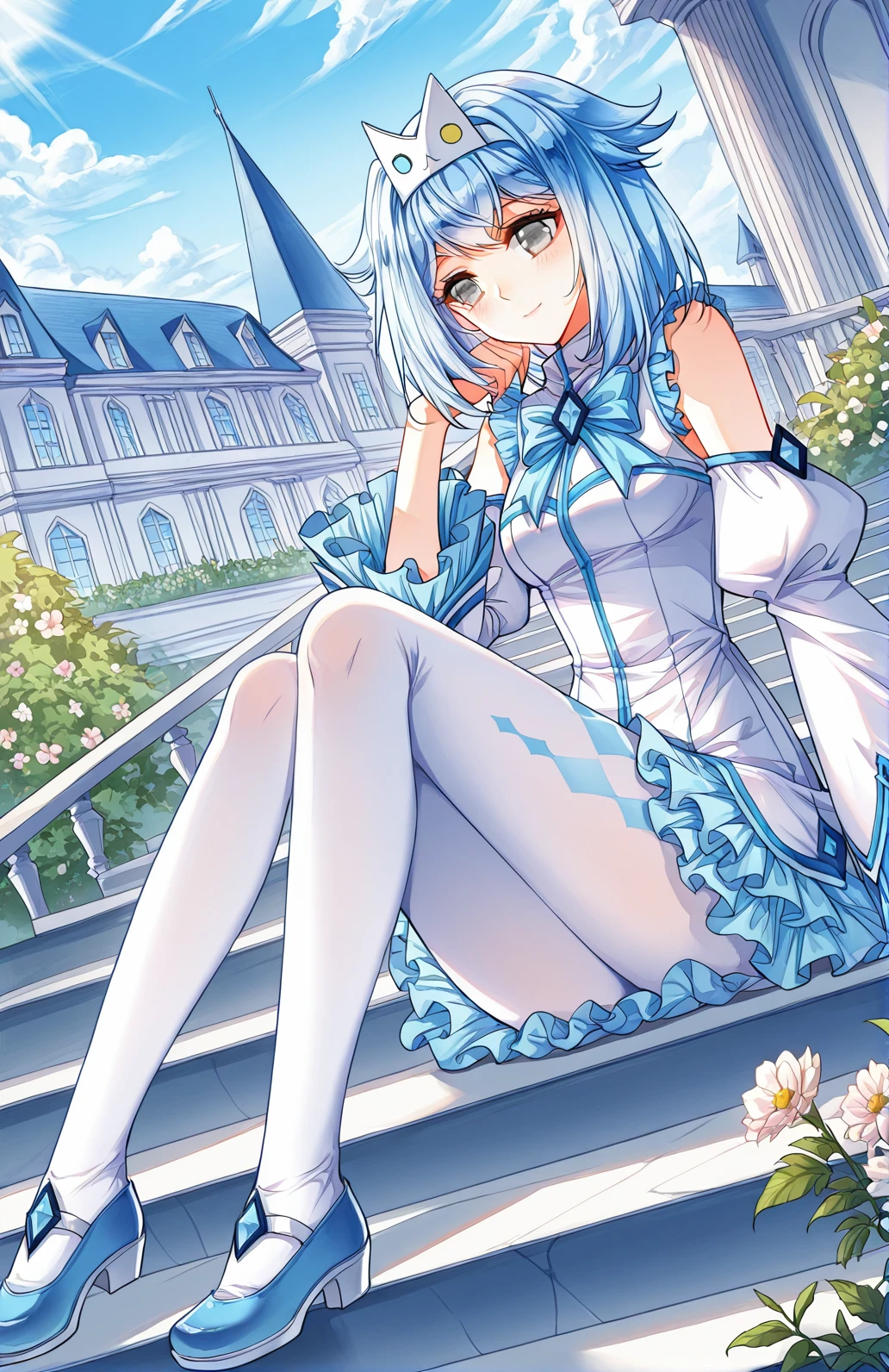 Luochen_outfit, white dress, blue trim, sleeveless, frilled sleeves, frilled skirt, layered skirt, detached sleeves, frilled detached sleeves, blue bow, diamond-shaped accents, white tights, blue shoes,