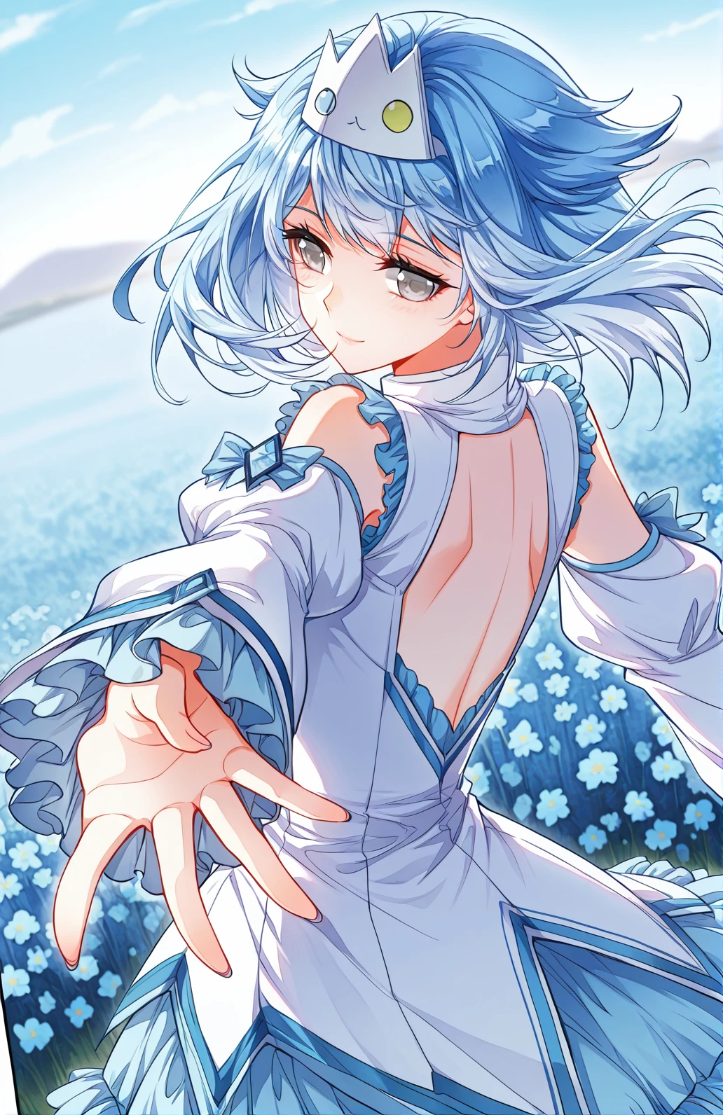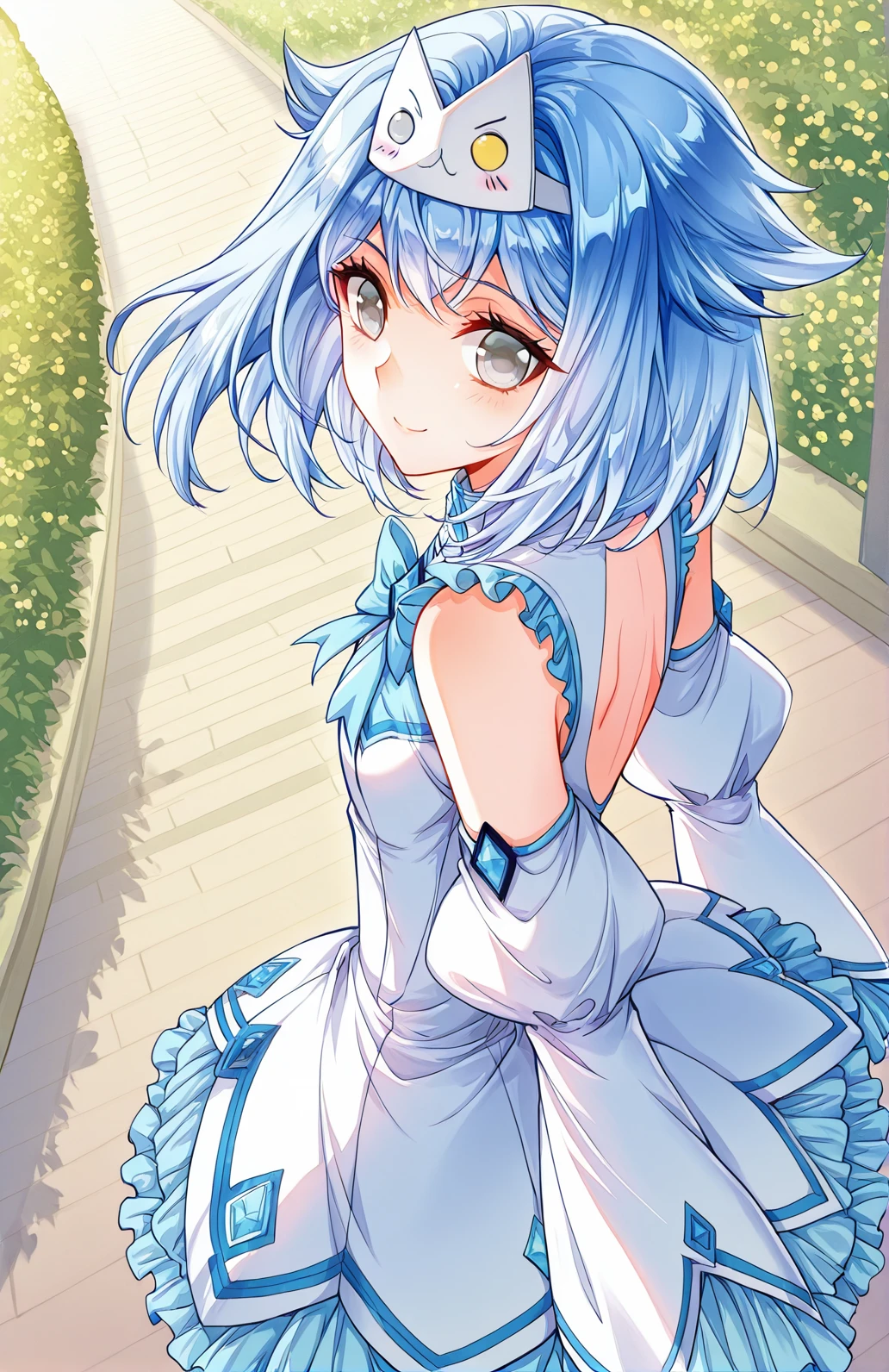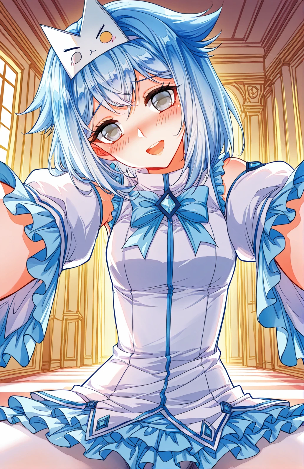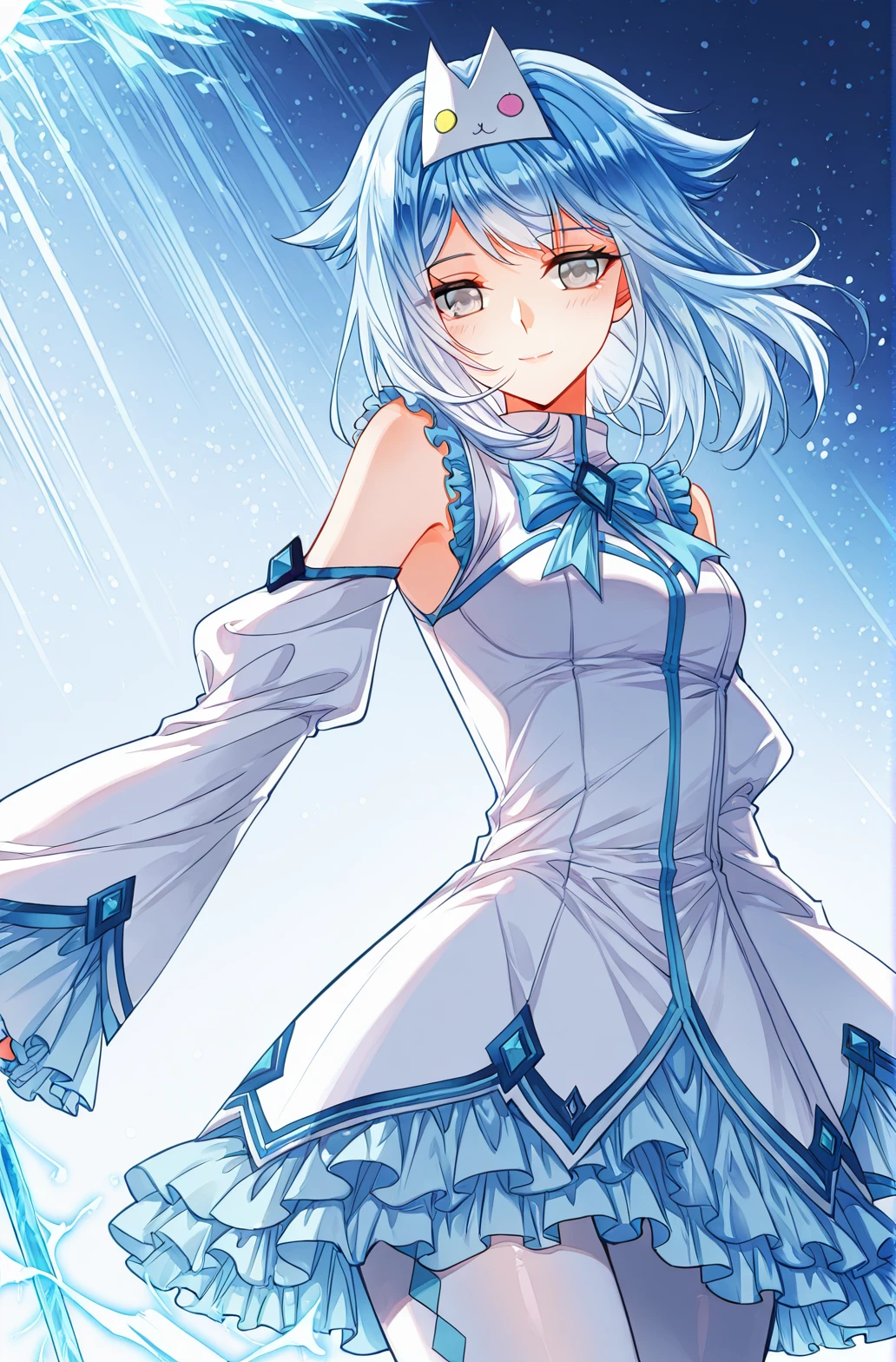 Luochen, 1 girl, solo, short hair, light blue hair, irregular bangs, blue gradient hair tips, light grey eyes, hair ornament, ornate tiara,