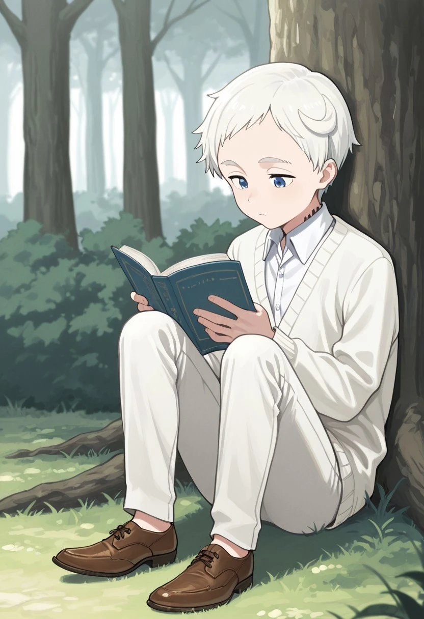 Nomansoku, 1boy, male focus, solo, blue eyes, white hair, white shirt, collared shirt, long sleeves, white pants, shoes, brown footwear,