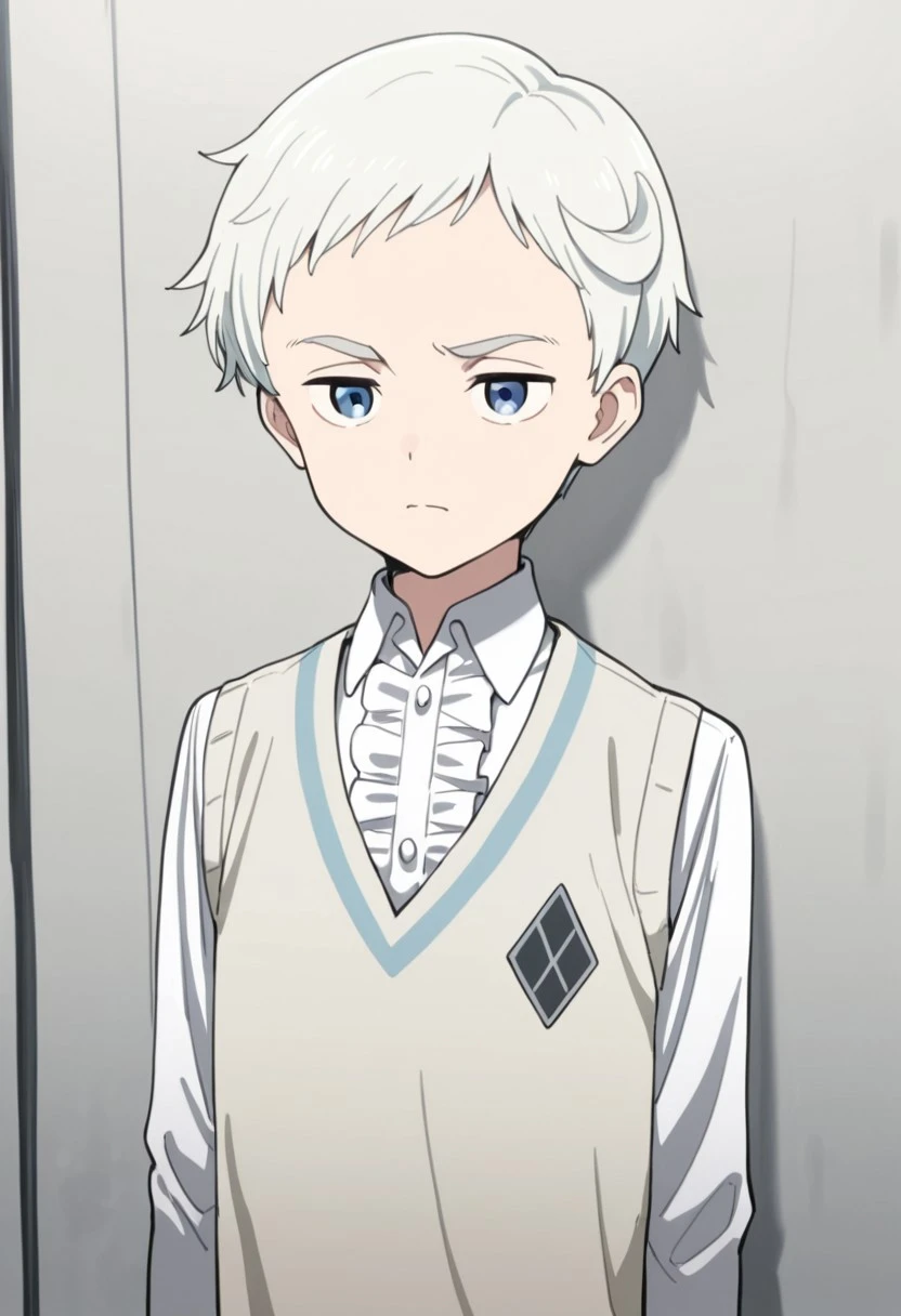 Nomansoku, 1boy, male focus, solo, blue eyes, white hair, white shirt, collared shirt, center frills, long sleeves, sweater vest, grey pants, shoes, brown footwear,