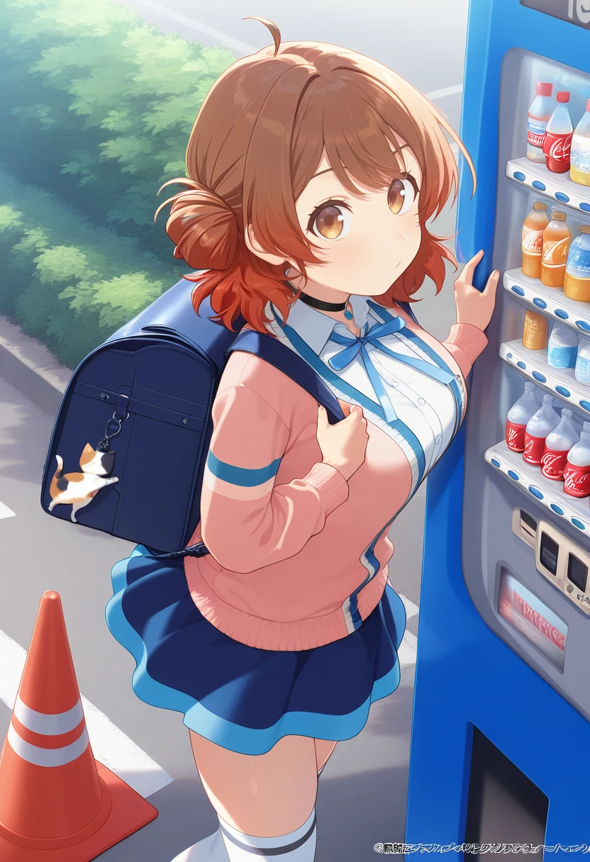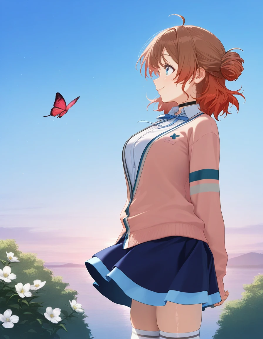1girl, hanami ume, brown hair, brown eyes, ahoge, single hair bun, bangs, medium hair, gradient hair, large breasts, school uniform, cardigan, white shirt, blue ribbon, blue skirt, white thighhighs, <lora:Hanami_Ume-04:1>