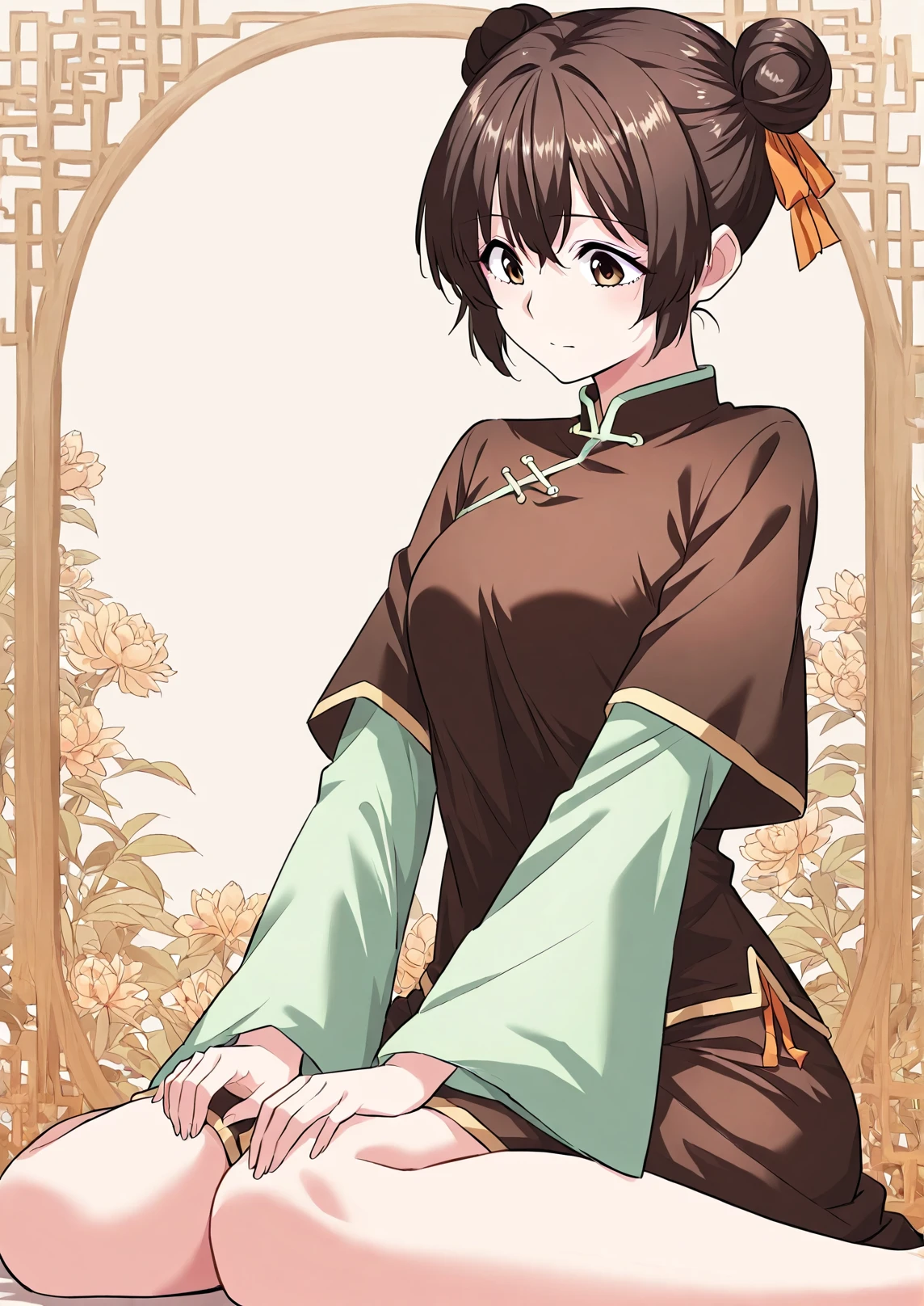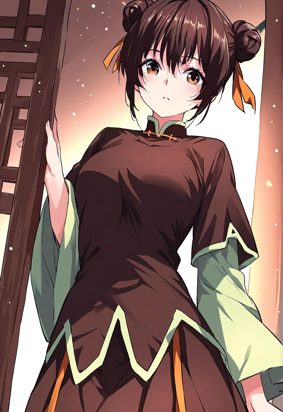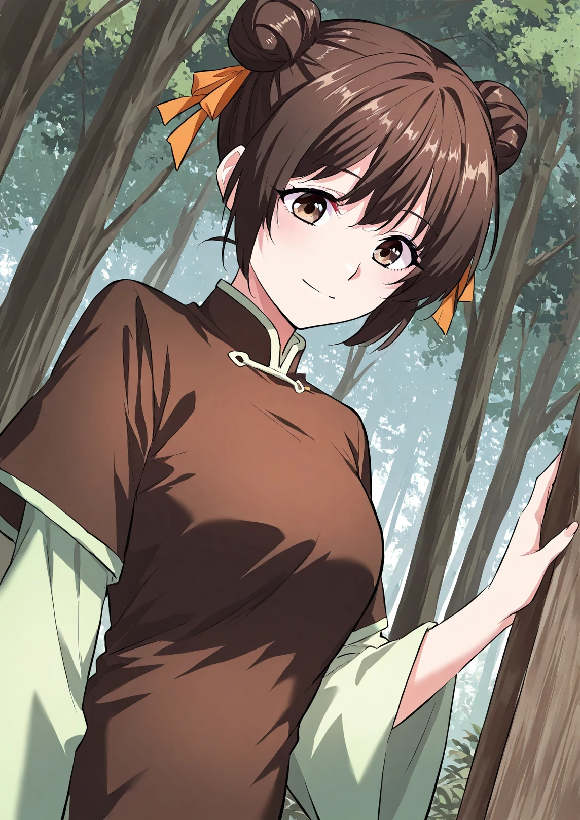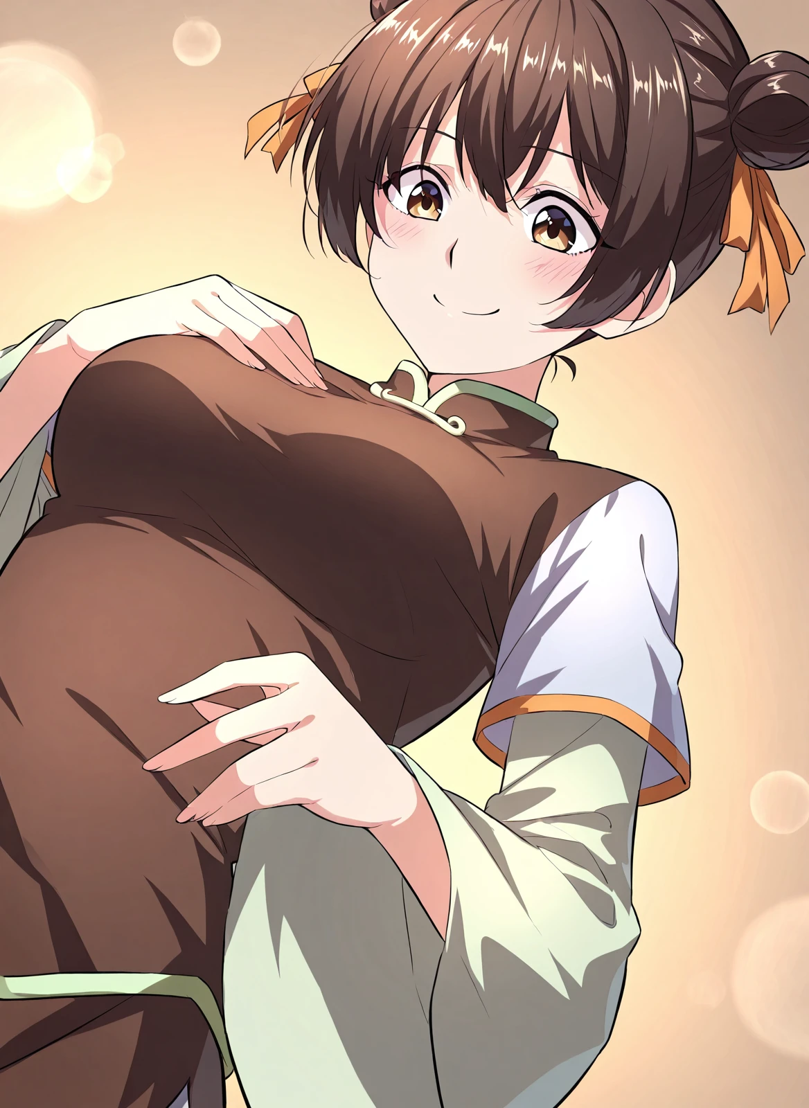 1 girl, solo, short dark brown hair, hair buns, double bun, orange ribbon on hair, big brown eyes,